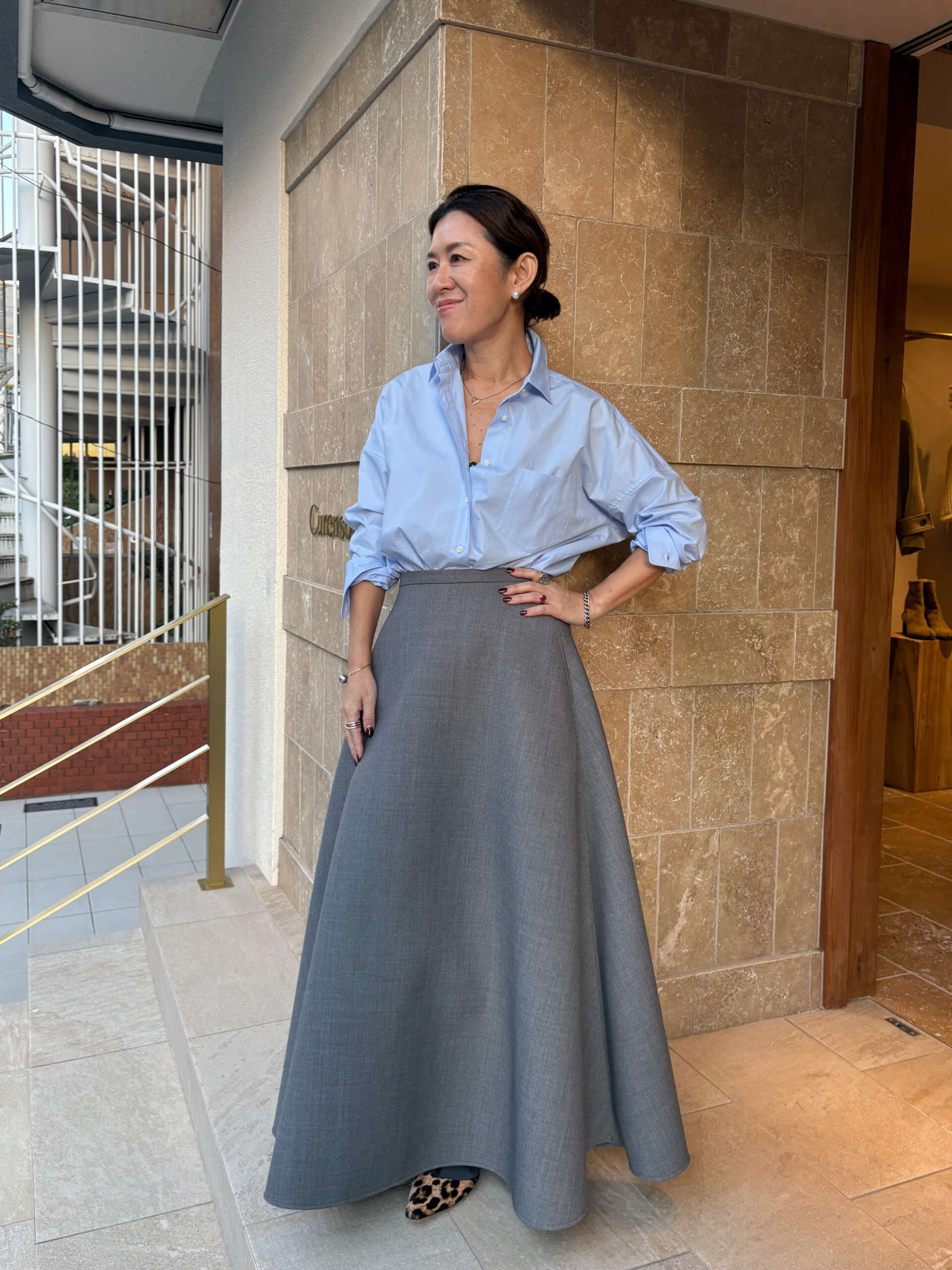 スタイリングは、キレイめシャツにレディなスカートを合わせ、カジュアルなジャケットで外すテイストミックスが大人っぽく着こなせるコツ。このスカートのラインも本当に美しくて、ぜひセットで欲しい組み合わせ。