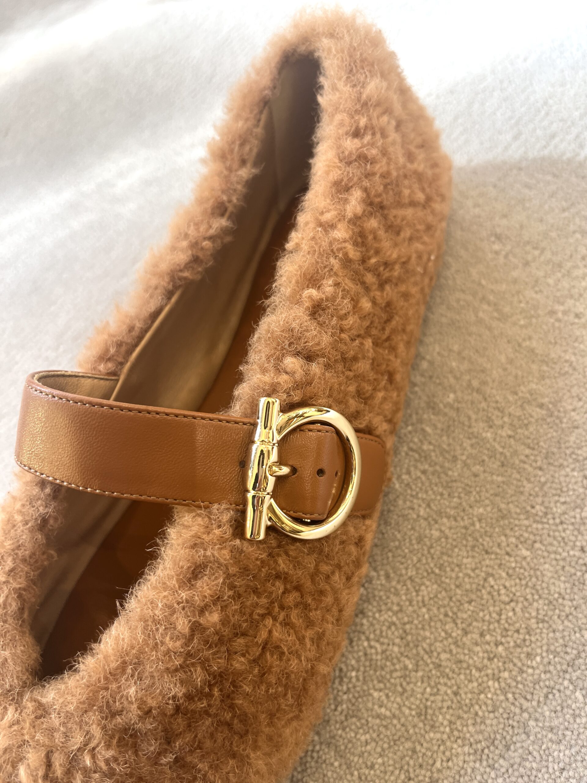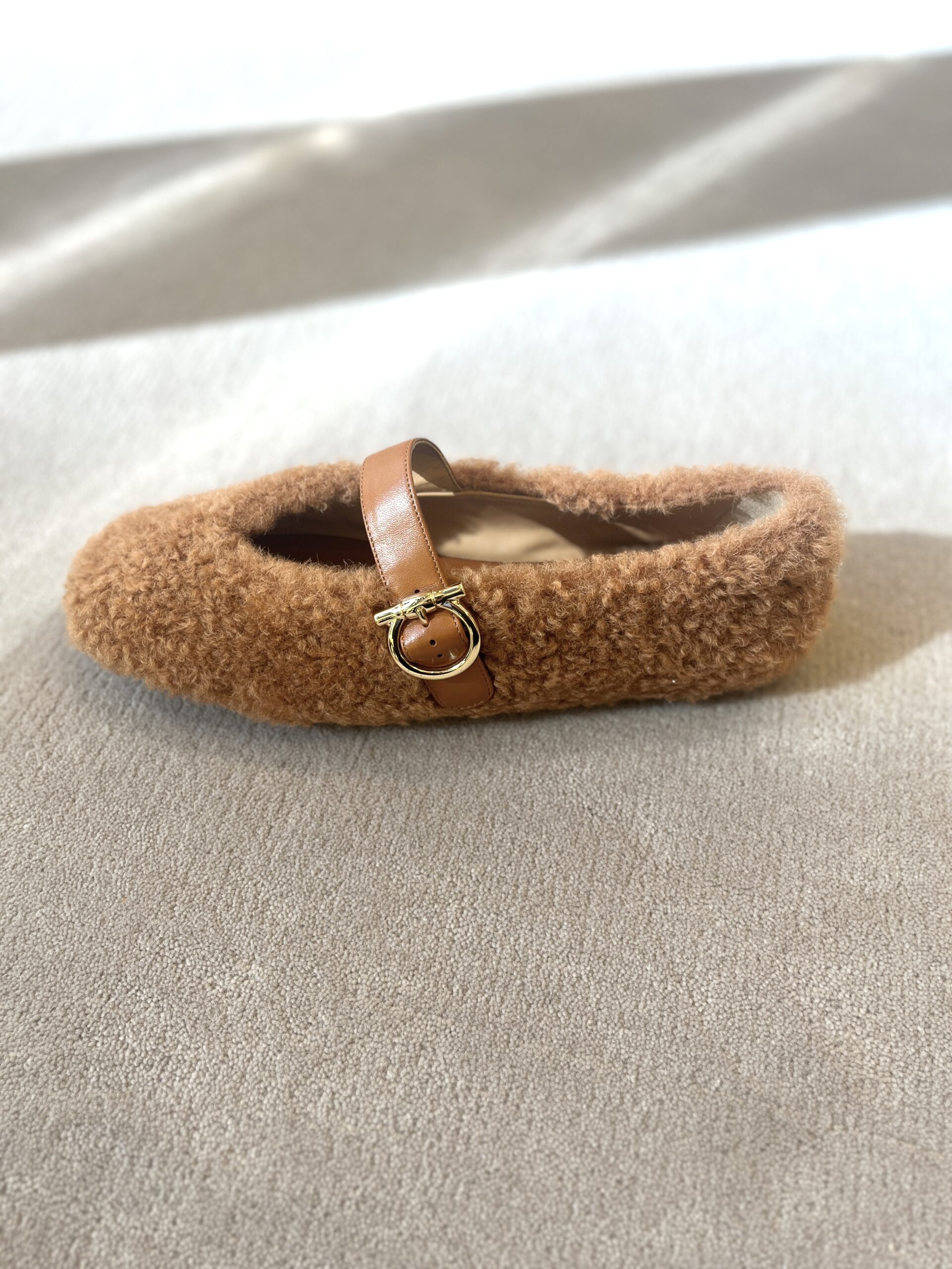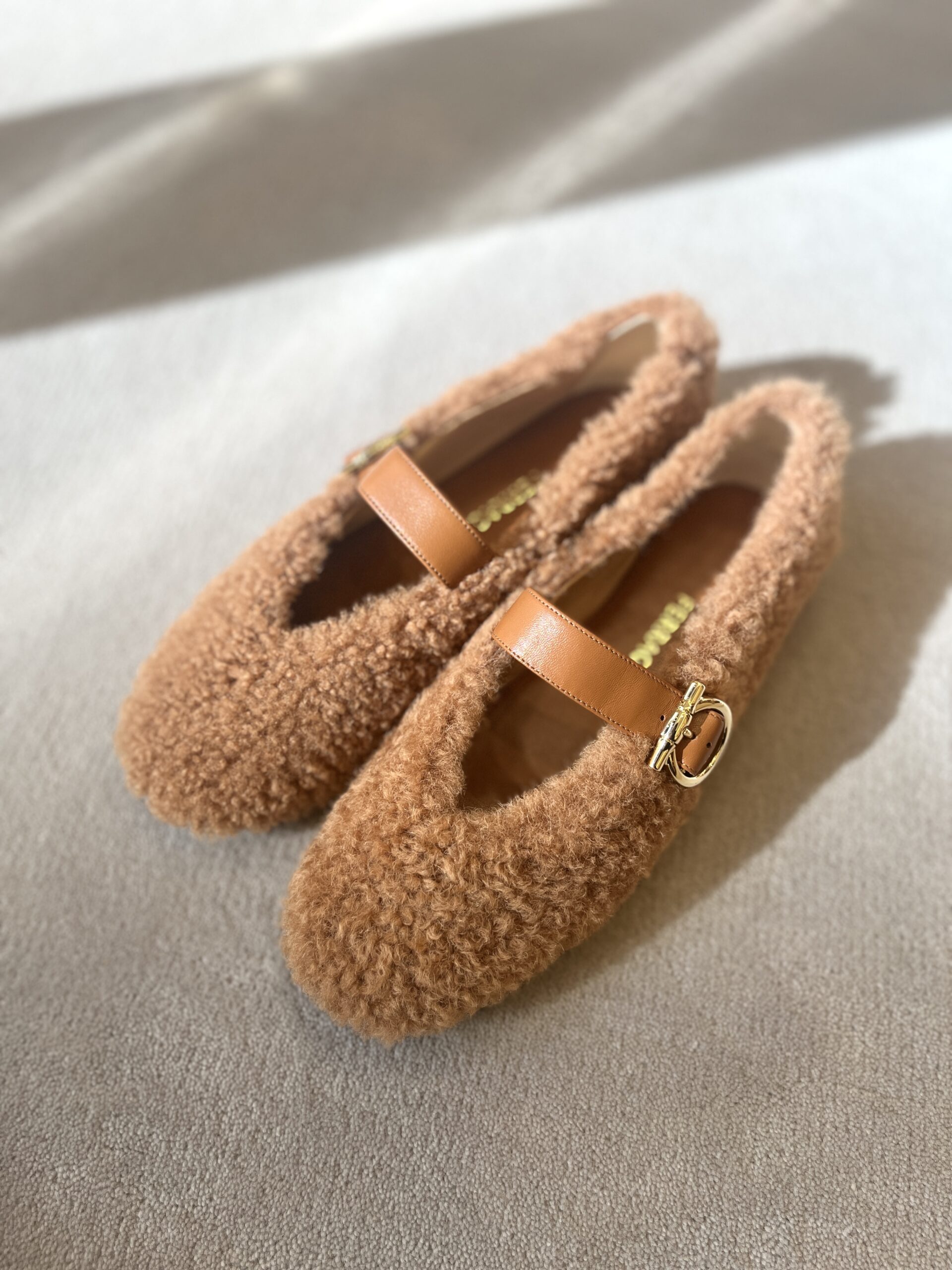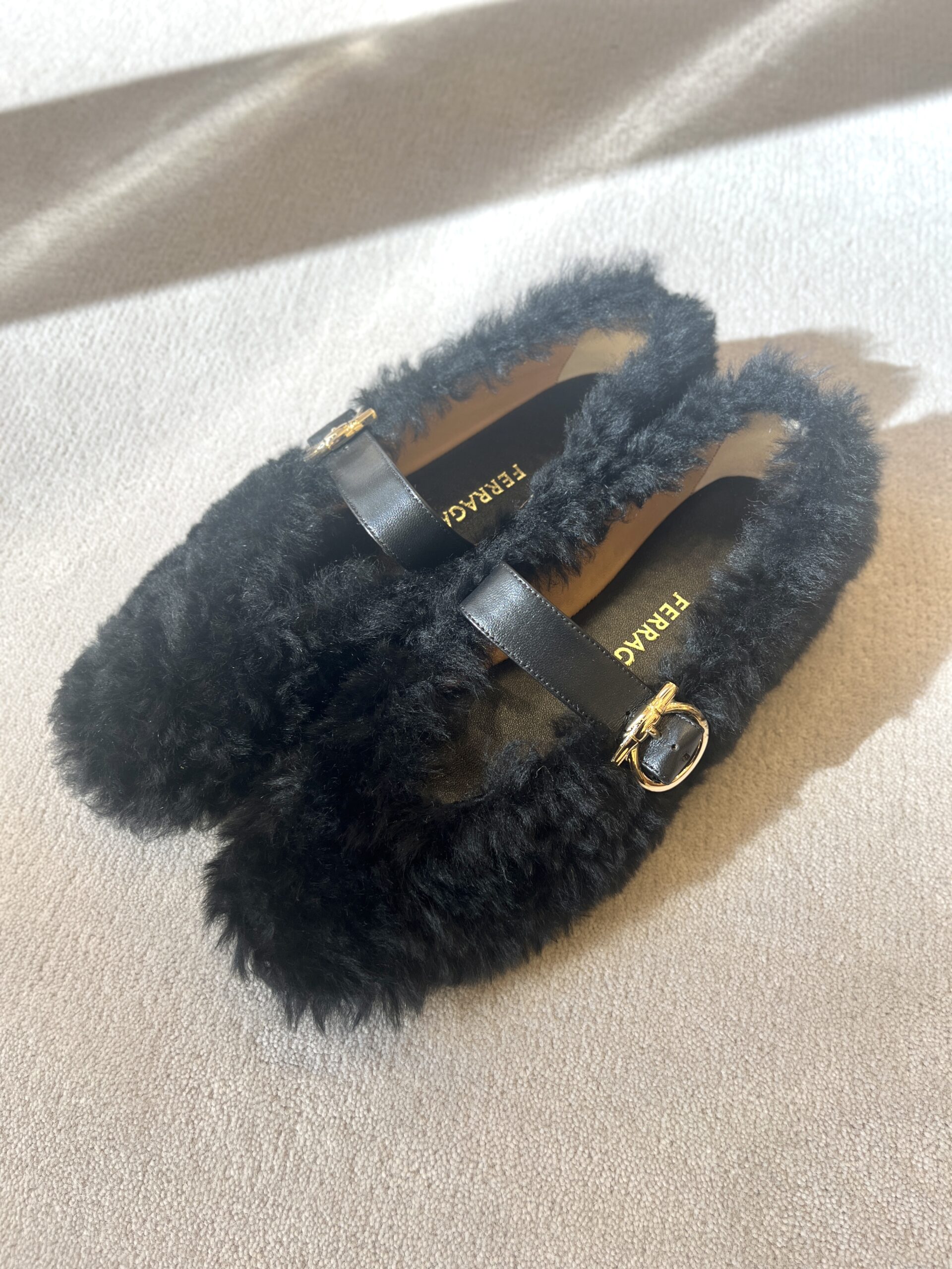「数々のメディアで注目されたという、ファーシューズ。温かみのあるテクスチャーが、寒いこの季節を楽しむのにぴったりのフラットシューズです。今年っぽいファー使いで、程よいモコモコ感が冬の足元に上質なリラックス感とクラス感を加えます。