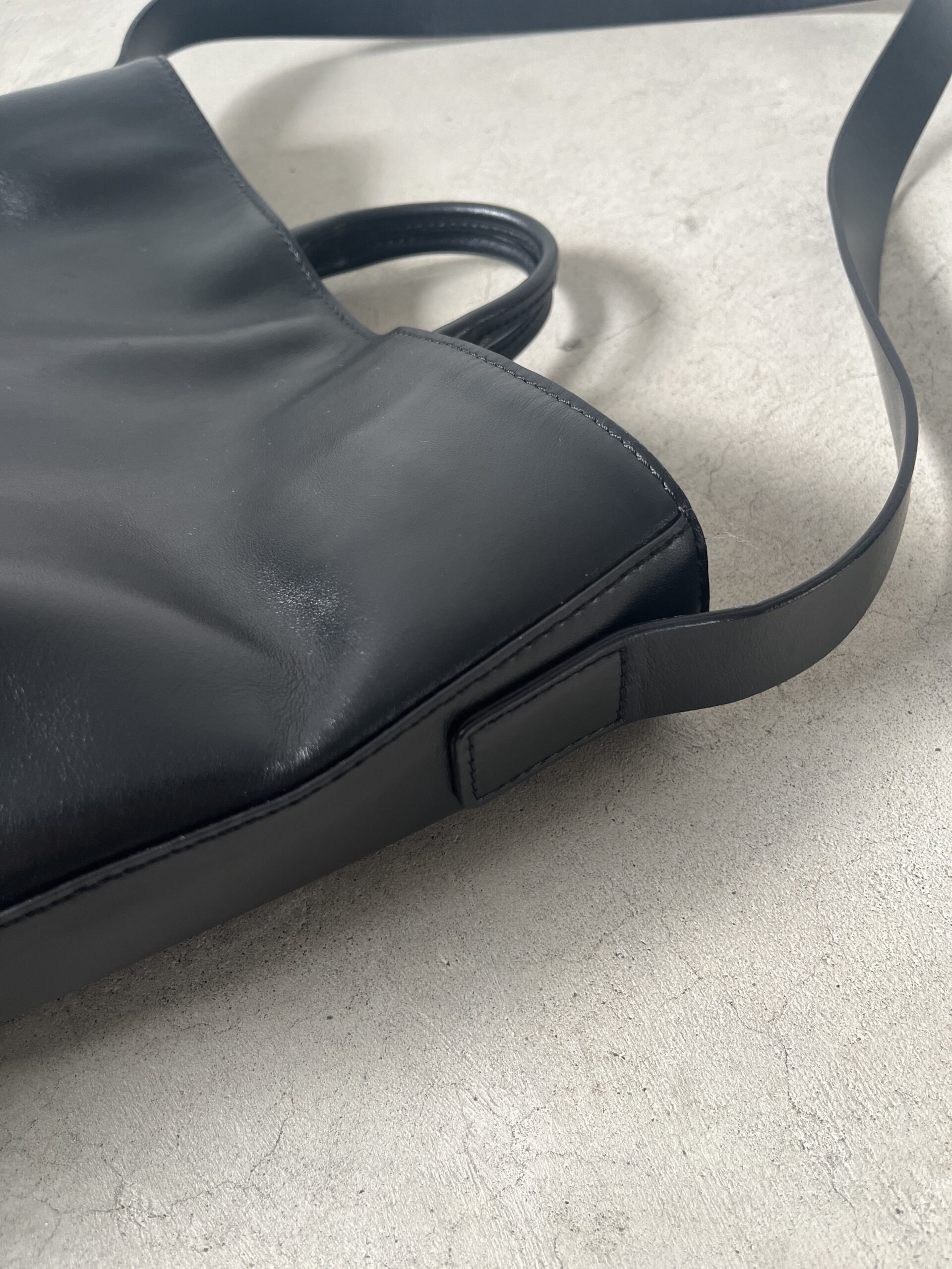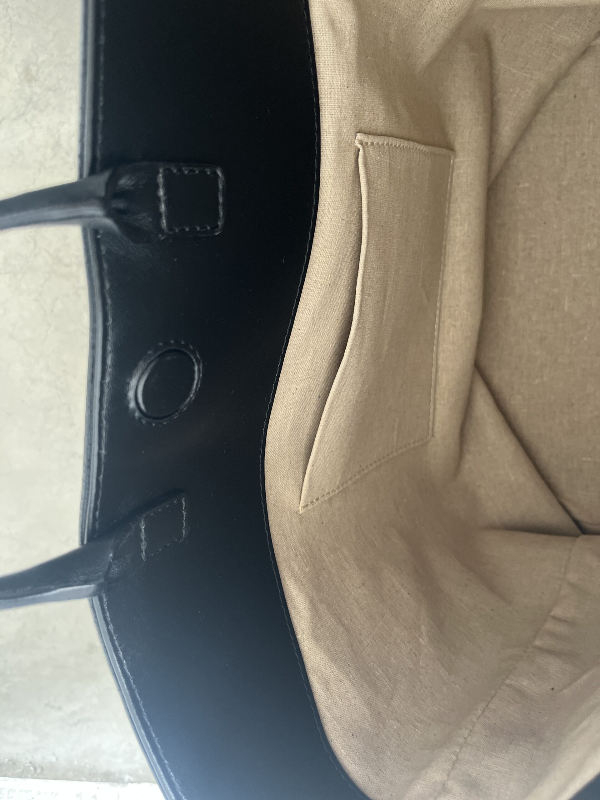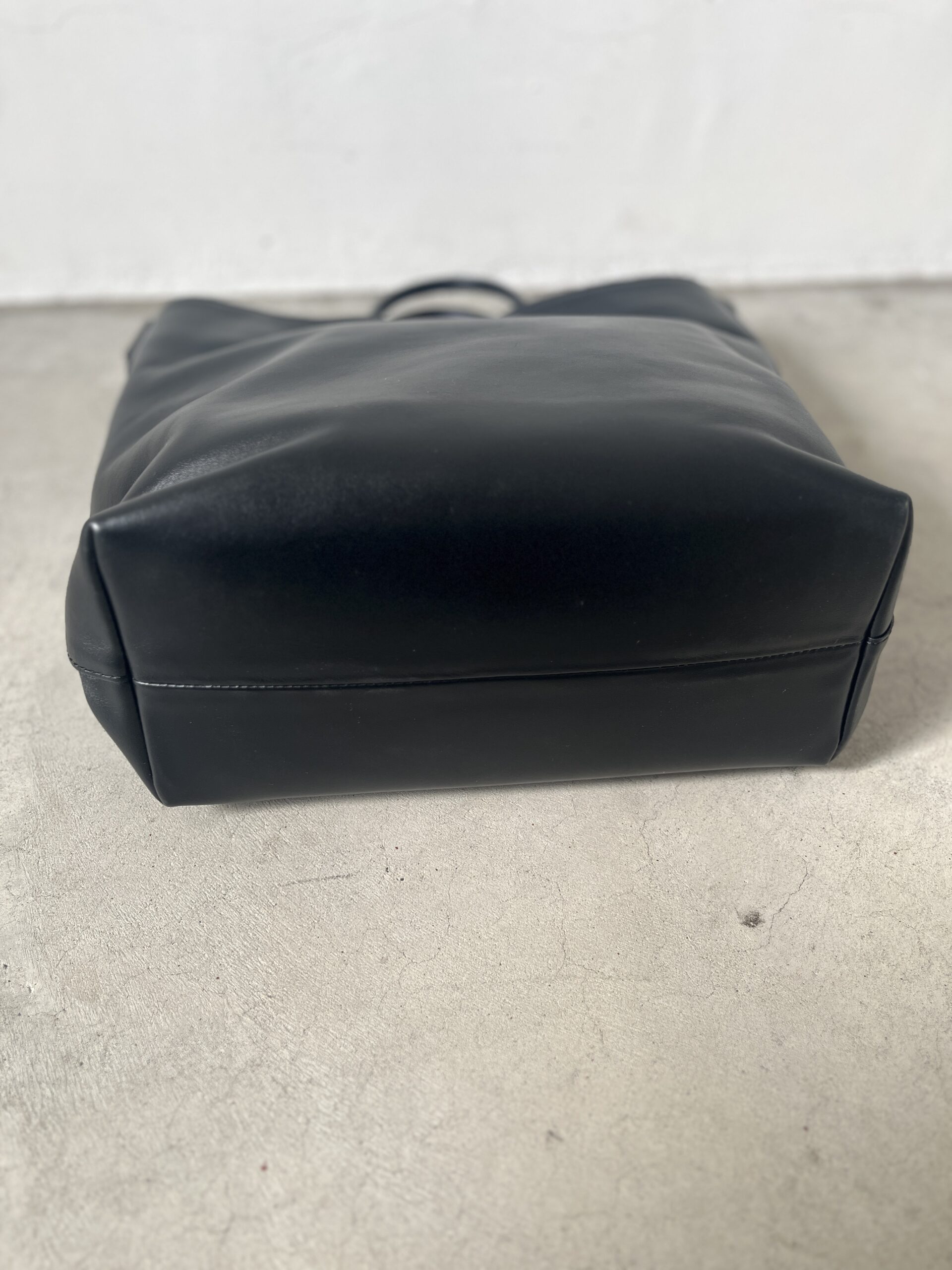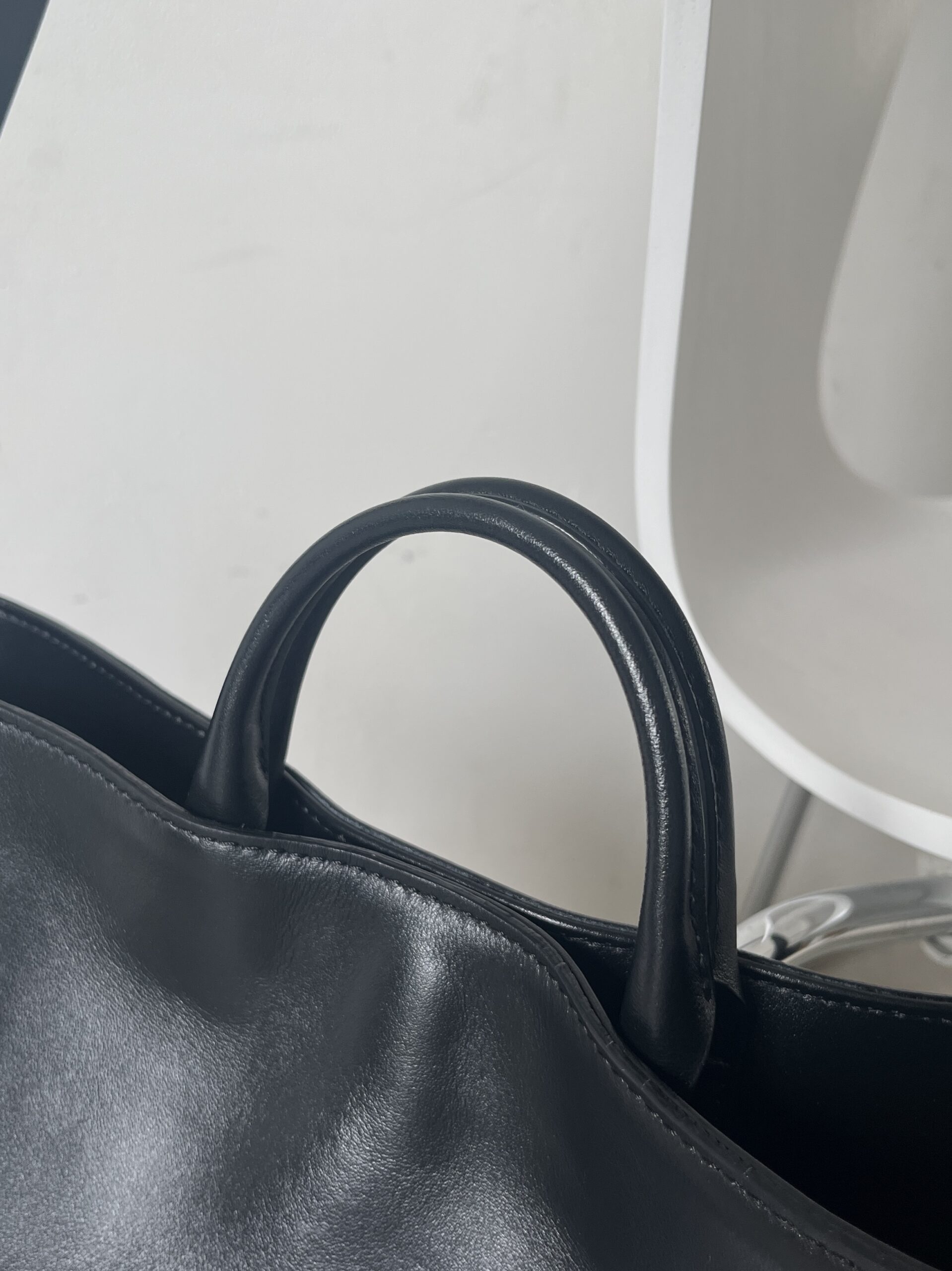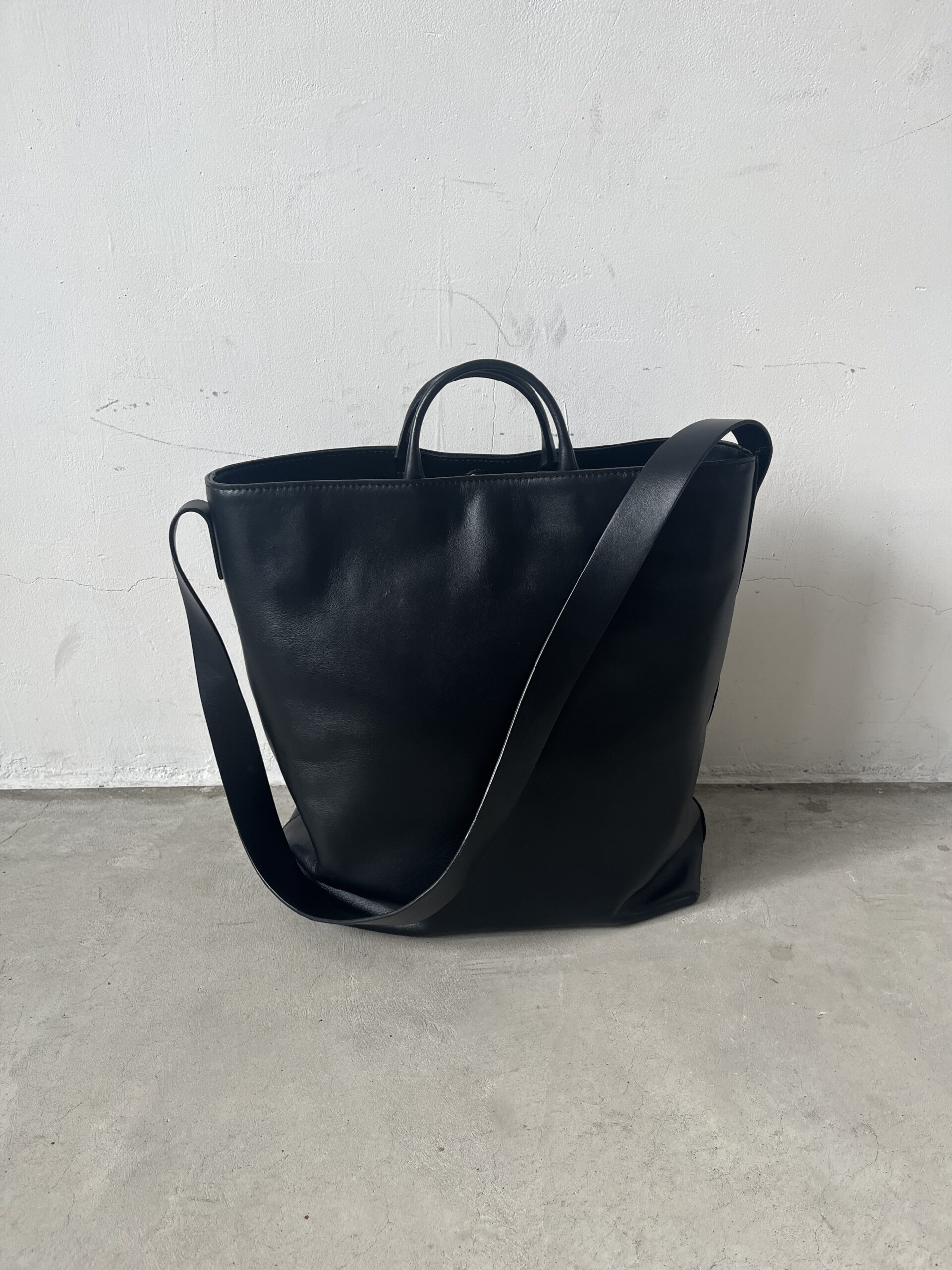 こちらのバッグは長方形の縦型トートで、デザインはいたってシンプル。あえてハンドルを小さく設計することで、持った時のシルエットをミニマルに、そしてスタイリッシュに見せてくれます。小ぶりなハンドルの良さはその見た目にありますが、肩掛けができないのが唯一のデメリット。そこを補ってくれるのがショルダーストラップです。本体と同じレザーで仕上げているのでラグジュアリー感も申し分なく、ビジネスだけでなく日常使いもできるマルチなバッグ。男性の方にもおすすめです!