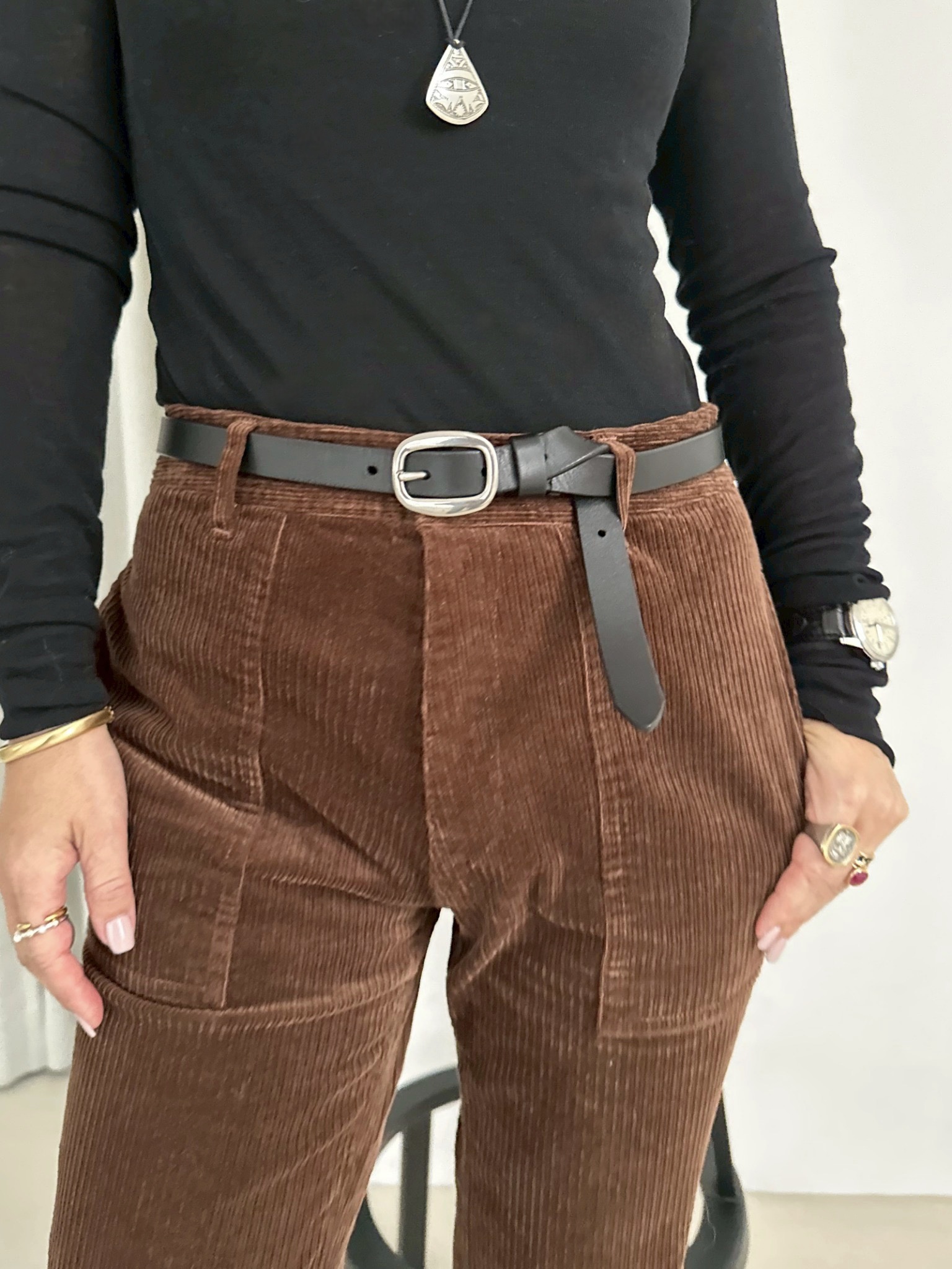 ちなみに、この時合わせたベルトもお気に入り♡ バックルが真鍮(しんちゅう)なので、使い込むほどにいい味が出てきそうです。無骨になりすぎないよう計算された細身のデザインで、長さが100cmあるので、ジャストウエストでもローウエストでも万能に使えます。こちらもぜひ、メンズの方にも手に取っていただきたいアイテム♡」(大草)