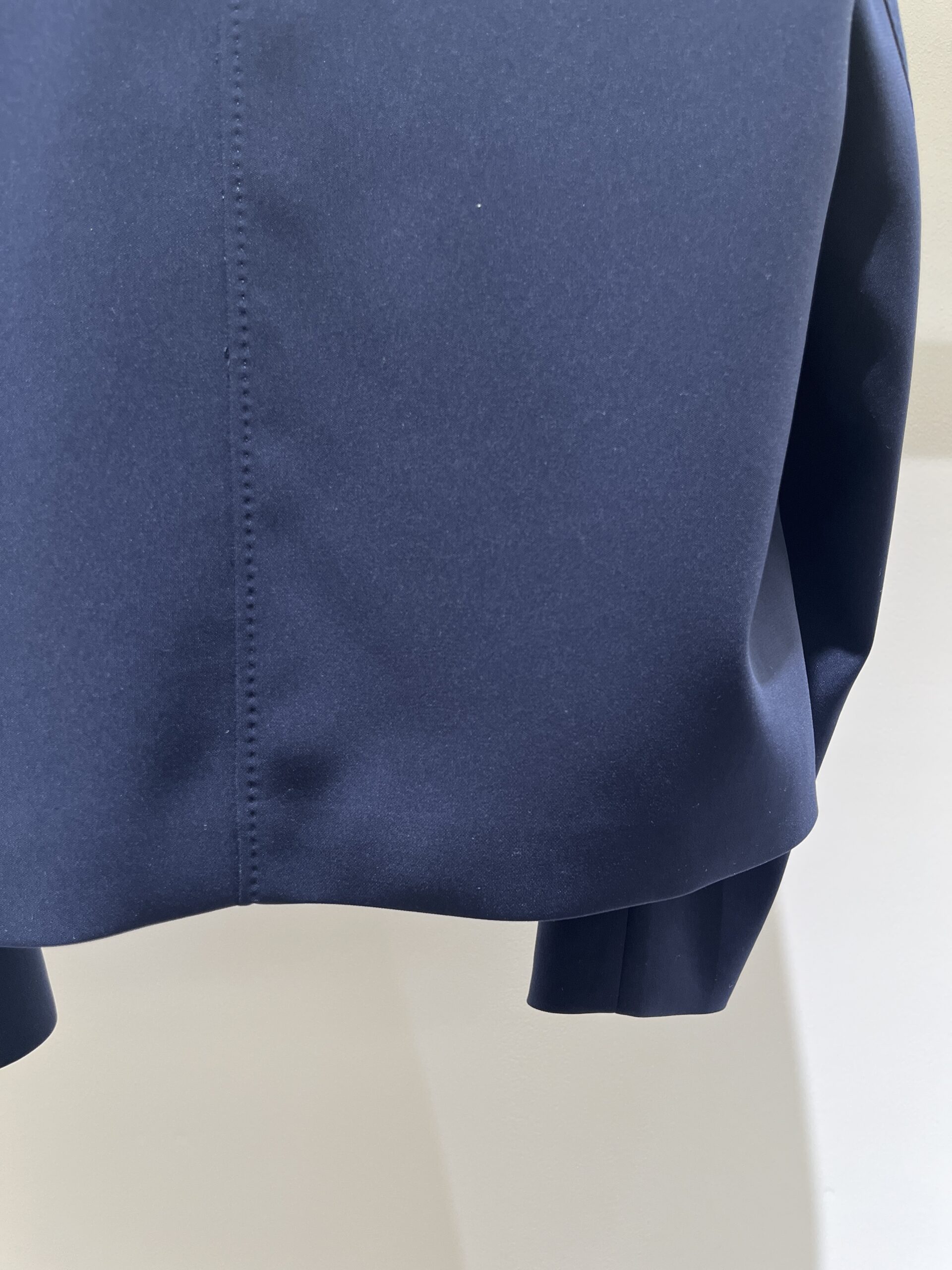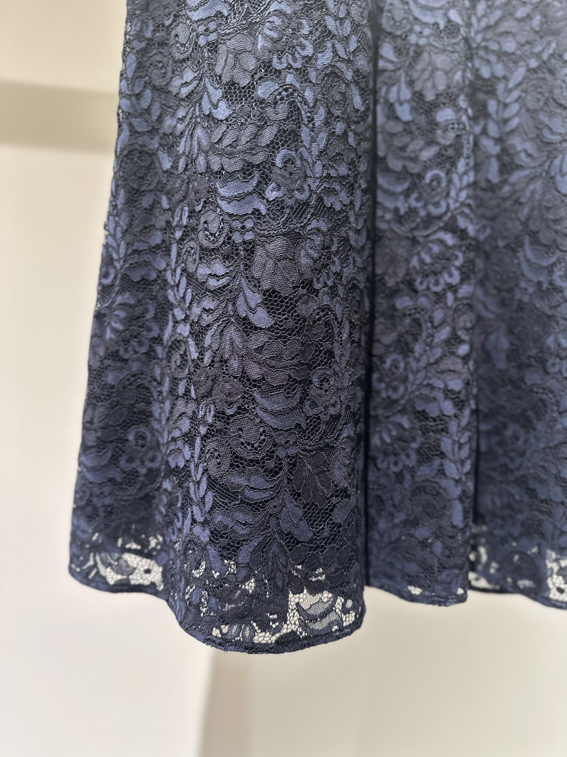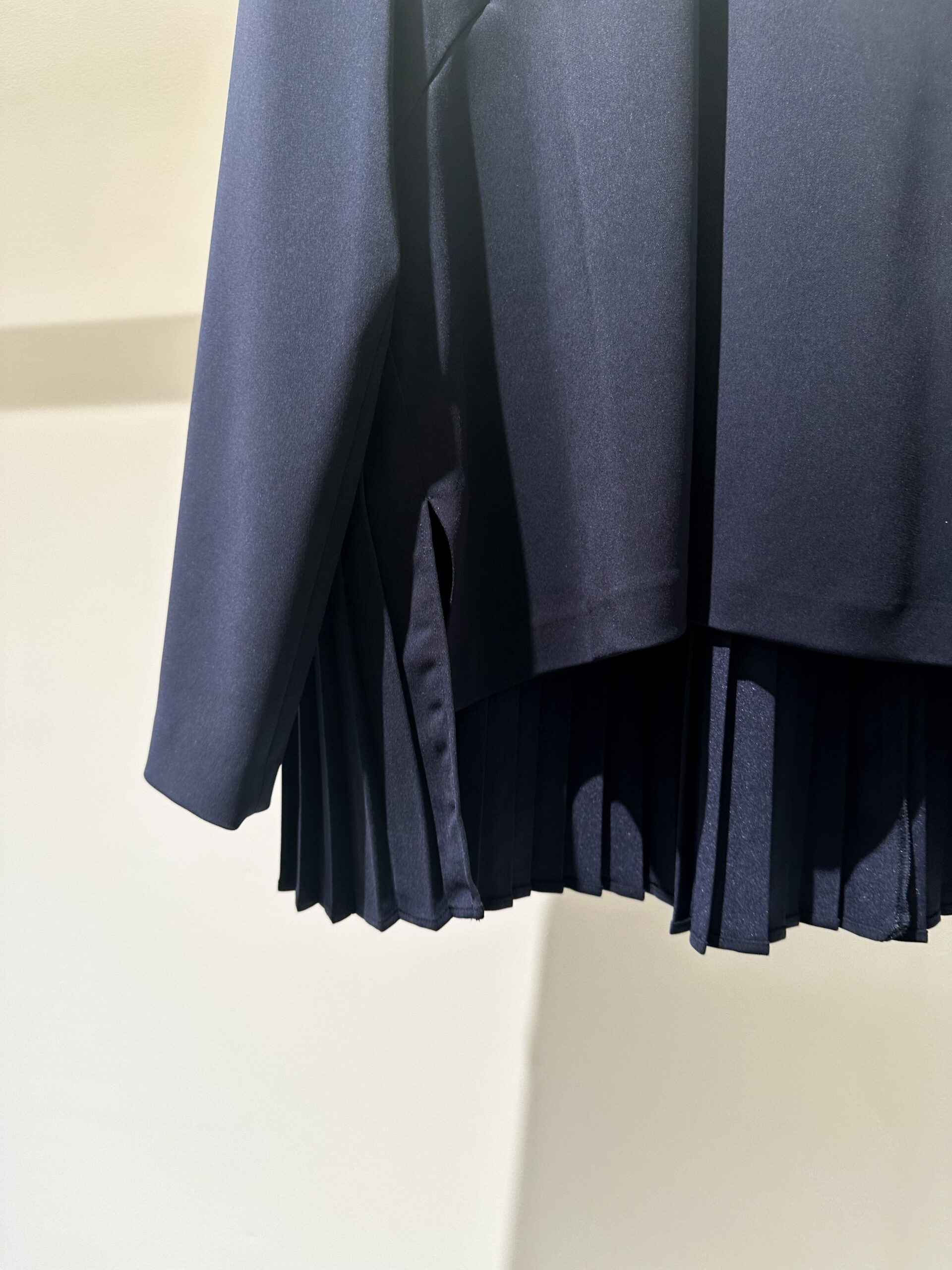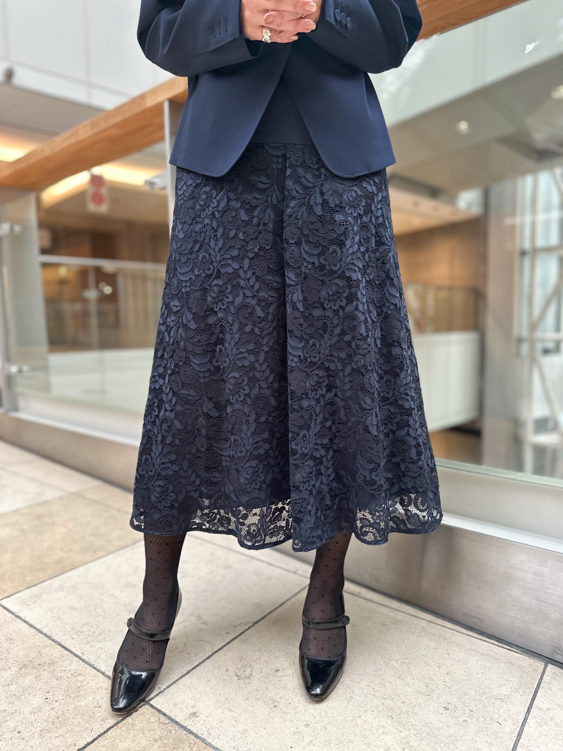 今回選んだのは、ネイビーのノーカラージャケットとレーススカートのセット。 どちらもシルエットはシンプルですが、ディテールの繊細さが際立っています。ジャケットはコンパクトながらストレッチが効いていて、着心地は抜群。スカートはウエストがゴム仕様でゆとりがありつつも、すっきりとしたナローなシルエットです。