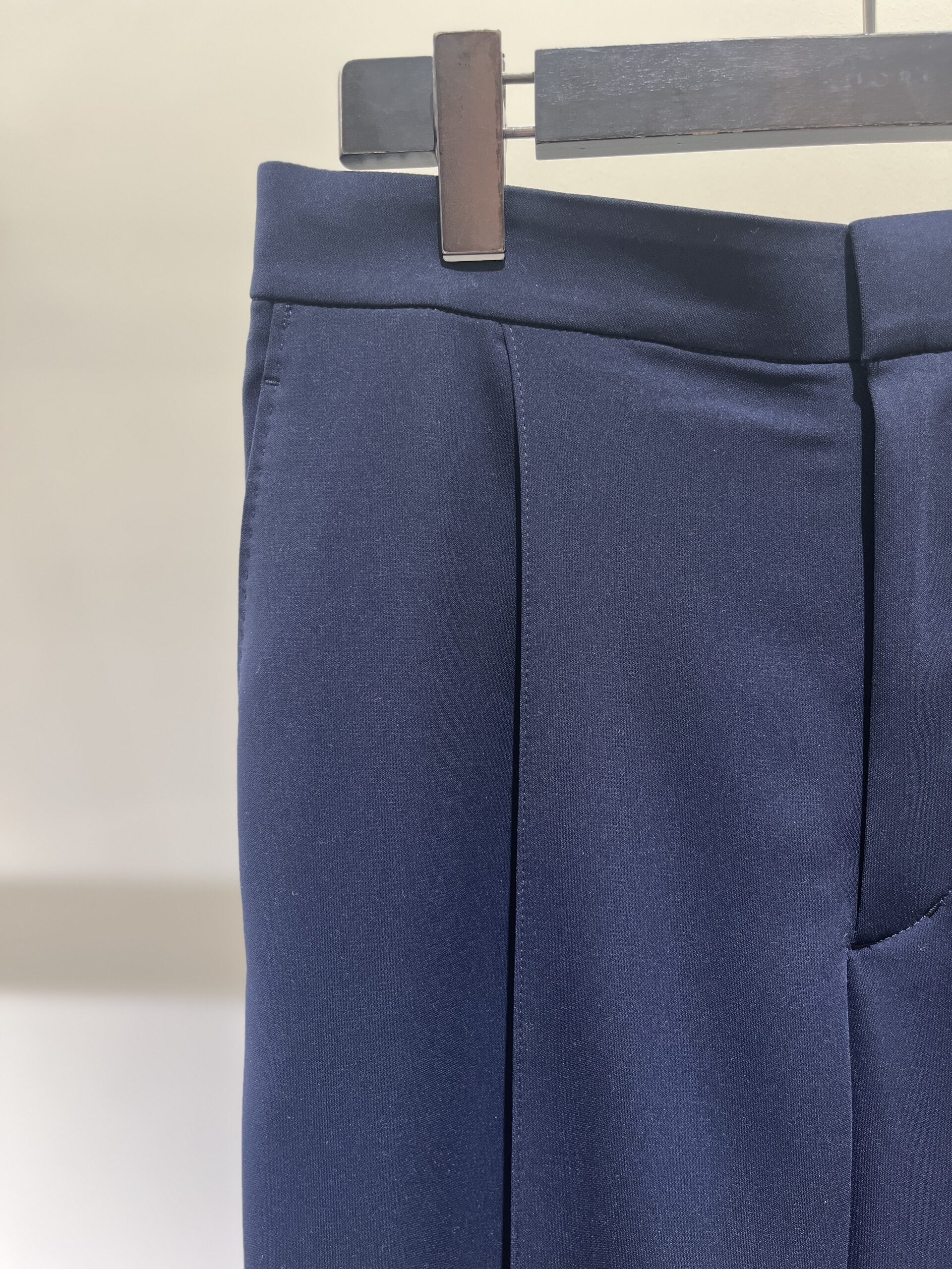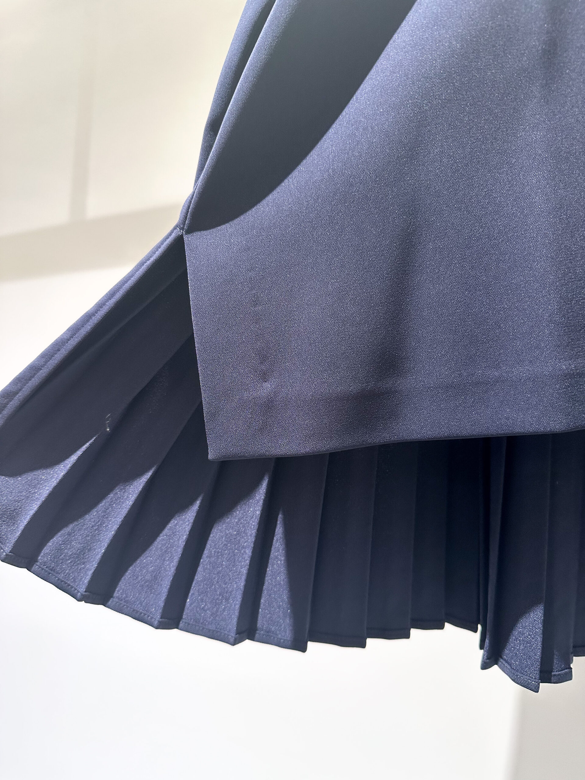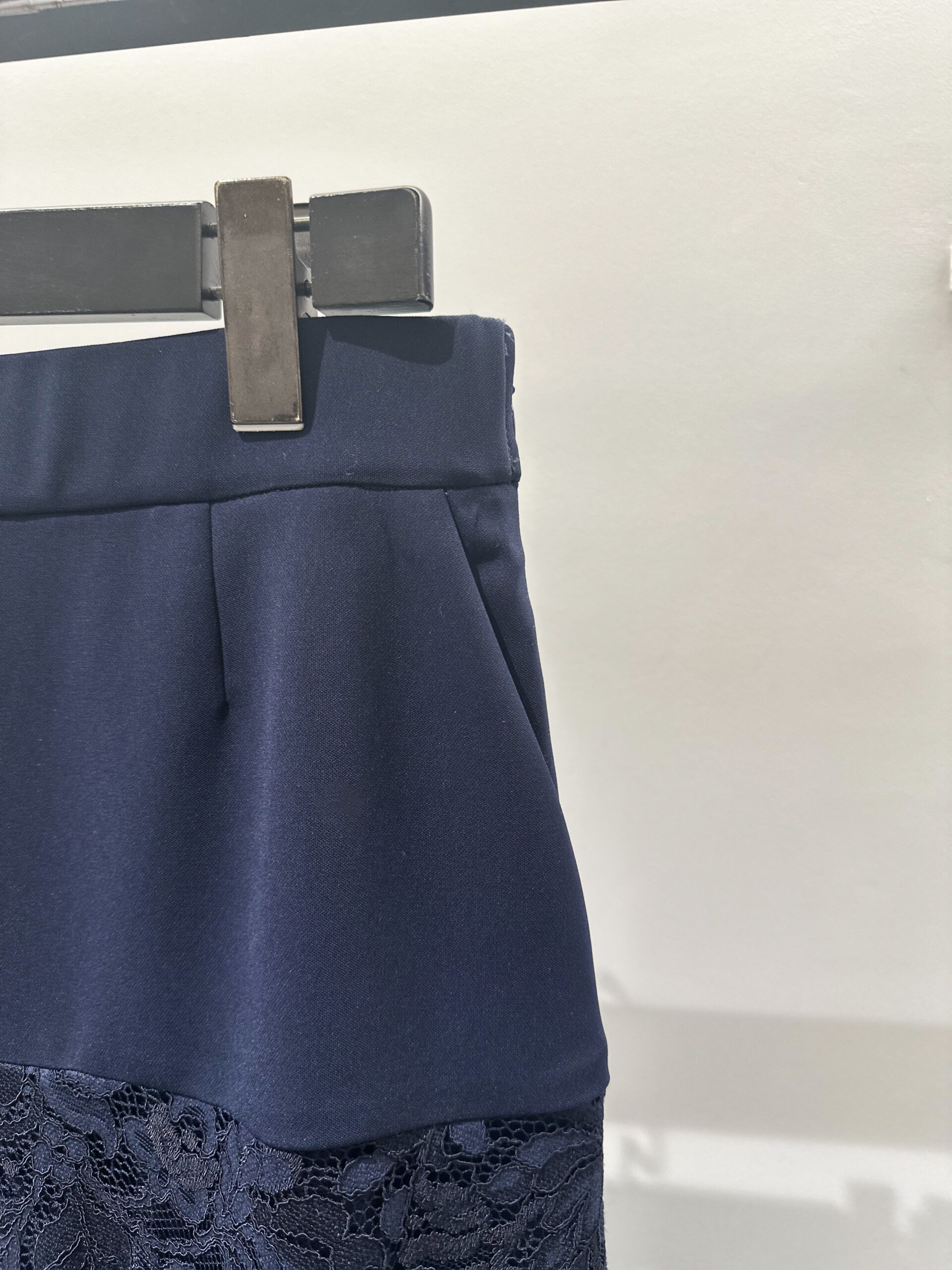今回選んだのは、ネイビーのノーカラージャケットとレーススカートのセット。 どちらもシルエットはシンプルですが、ディテールの繊細さが際立っています。ジャケットはコンパクトながらストレッチが効いていて、着心地は抜群。スカートはウエストがゴム仕様でゆとりがありつつも、すっきりとしたナローなシルエットです。