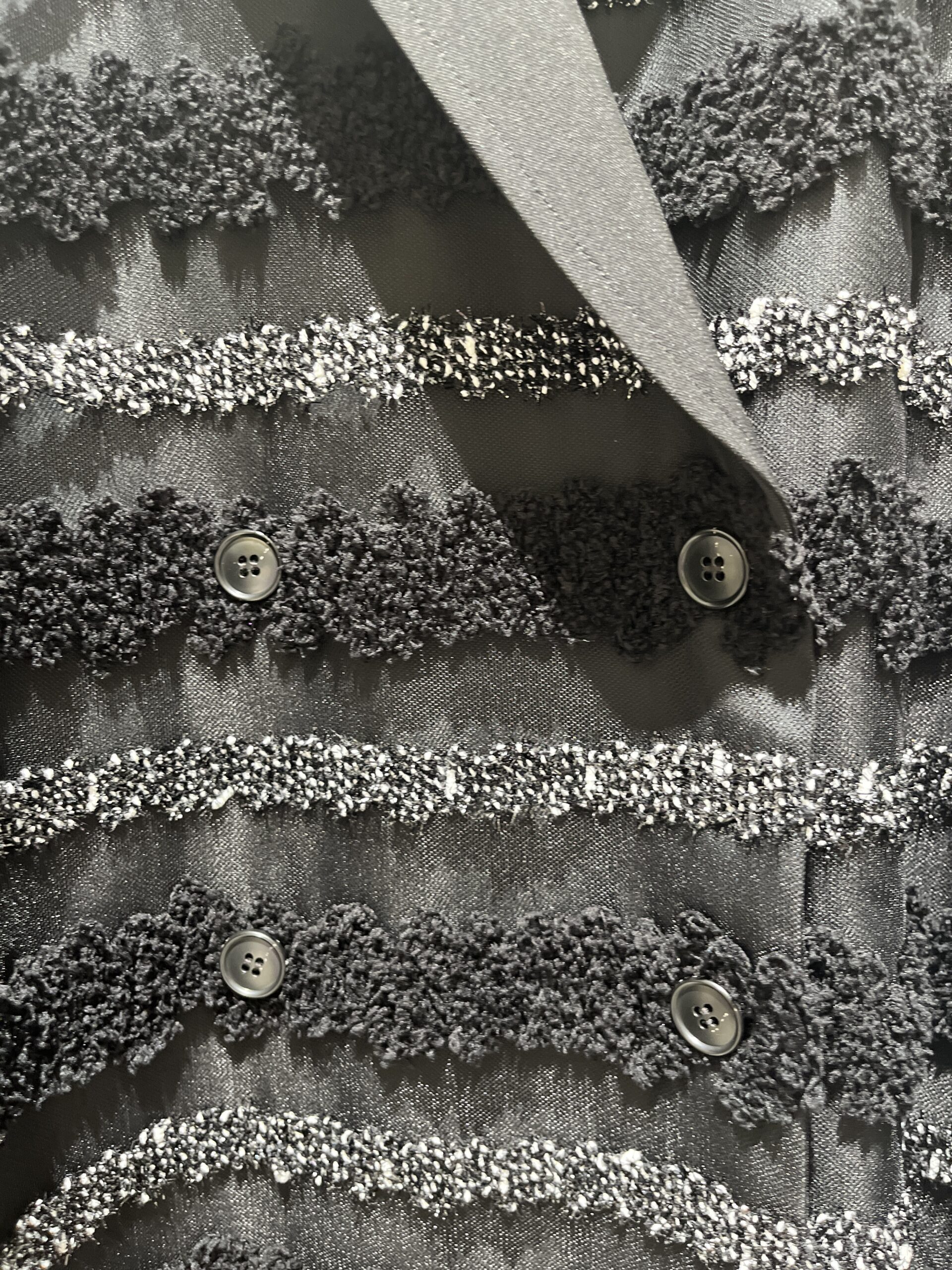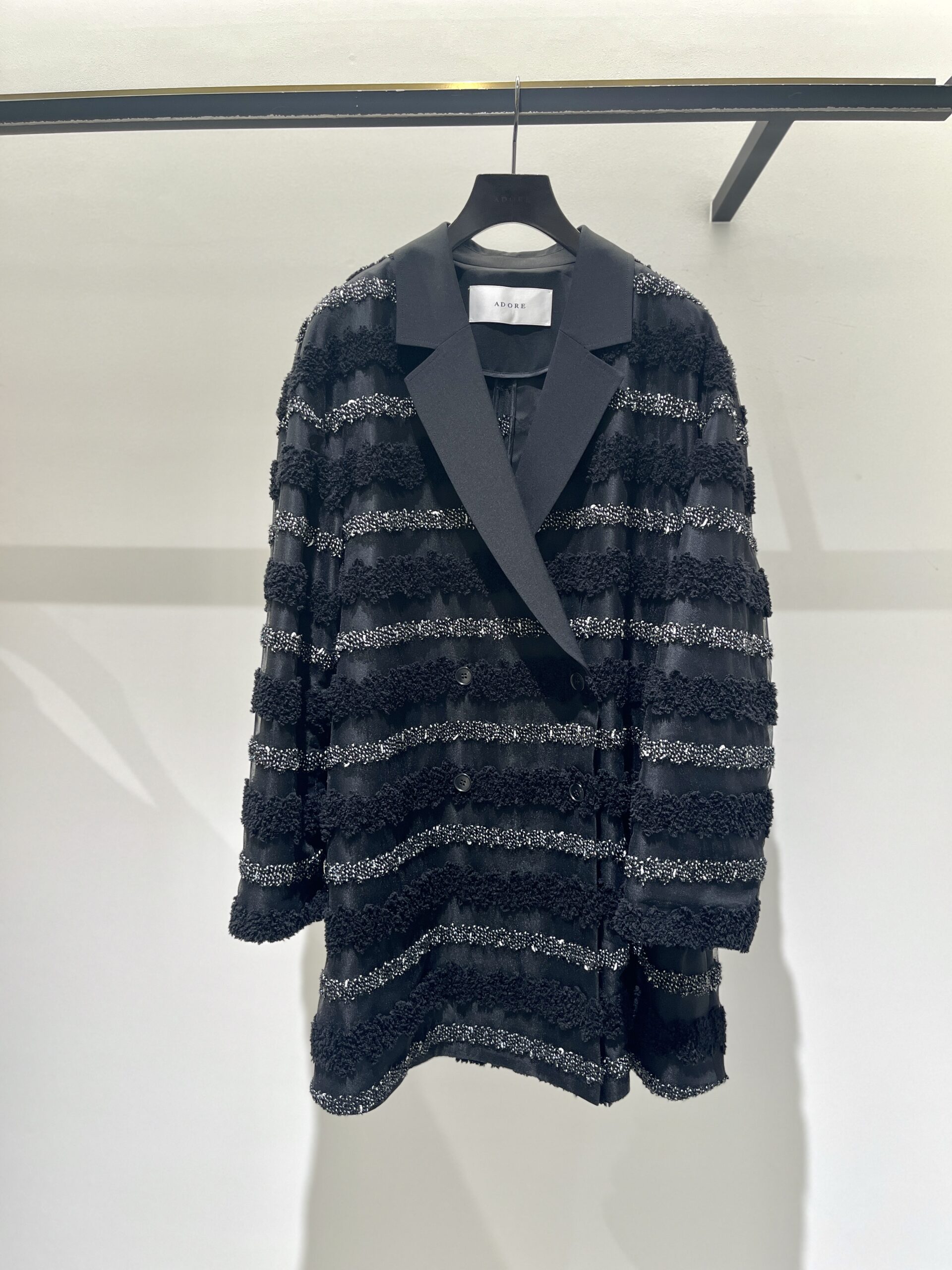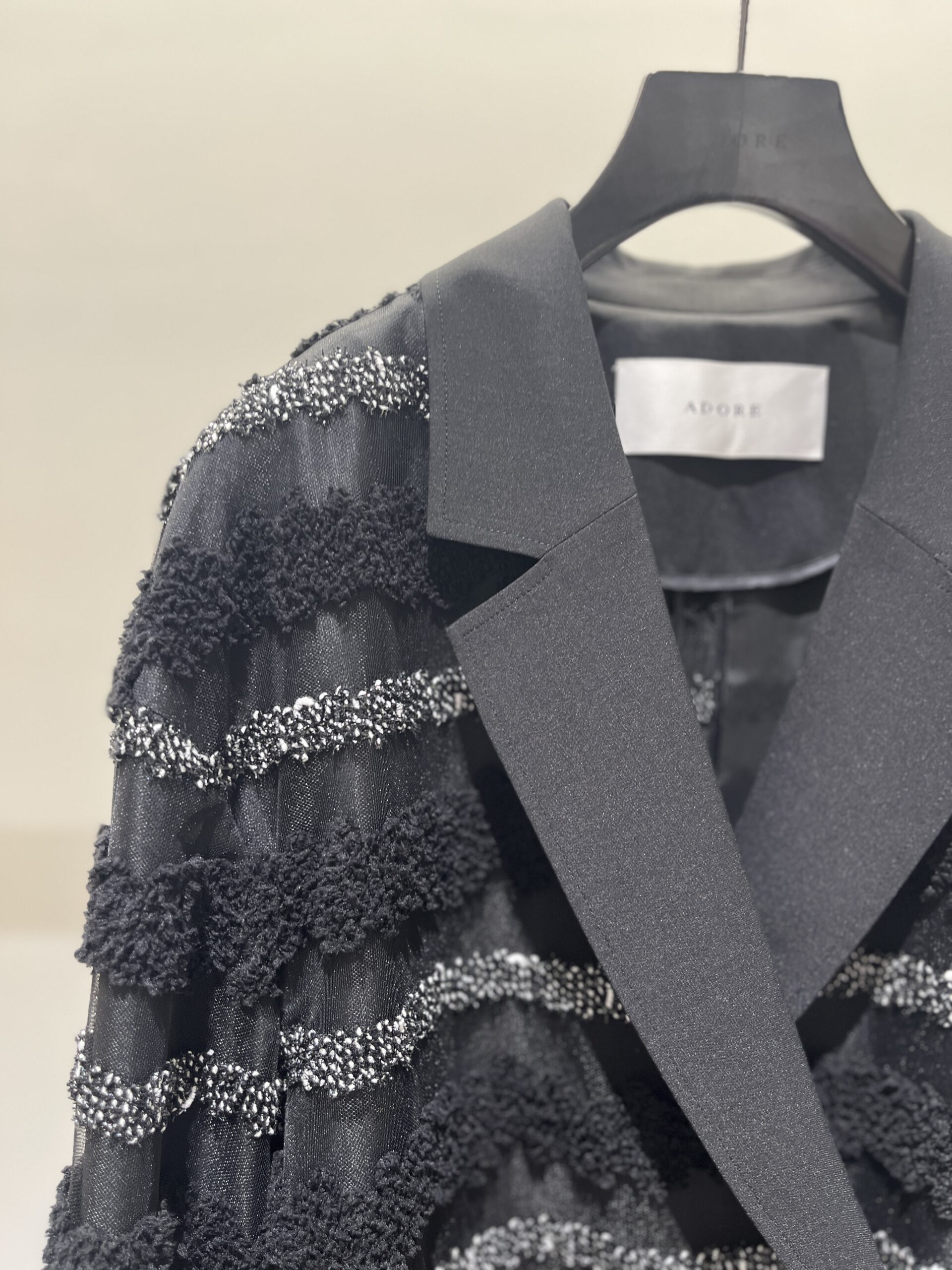 ちょっと変化球ではありますが、チュールベースの素材に膨らみのある糸や、表情のある糸をボーダー状に刺繍した素材で仕上げられた、ジャケットもとっても素敵。謝恩会などのパーティーといった華やかなシーンや、女友達と集まる食事会にもおすすめの一着。こんな遊び心が溢れたアウターでも、上品さは損なわないのが、さすがADORE」(大草)
