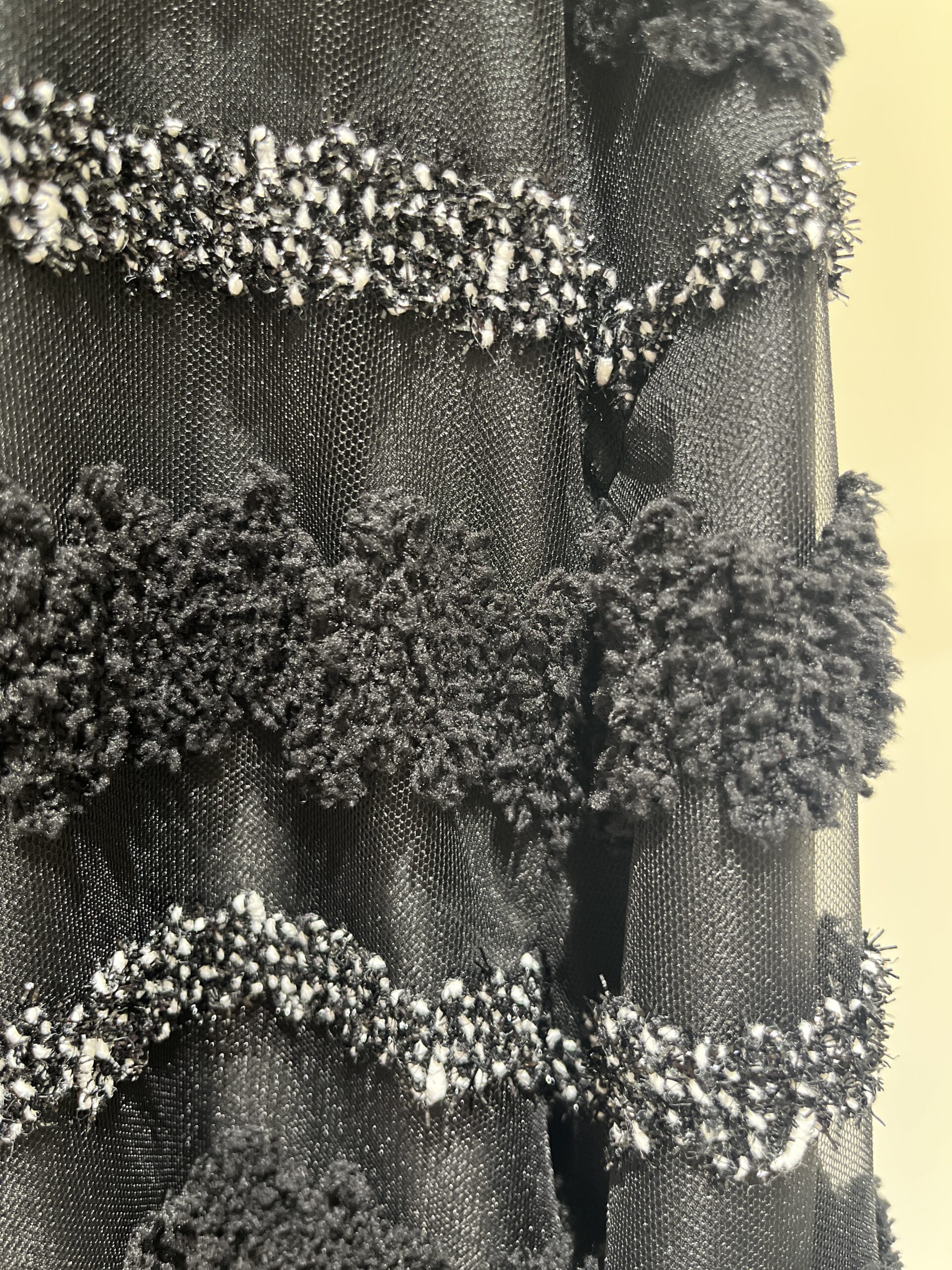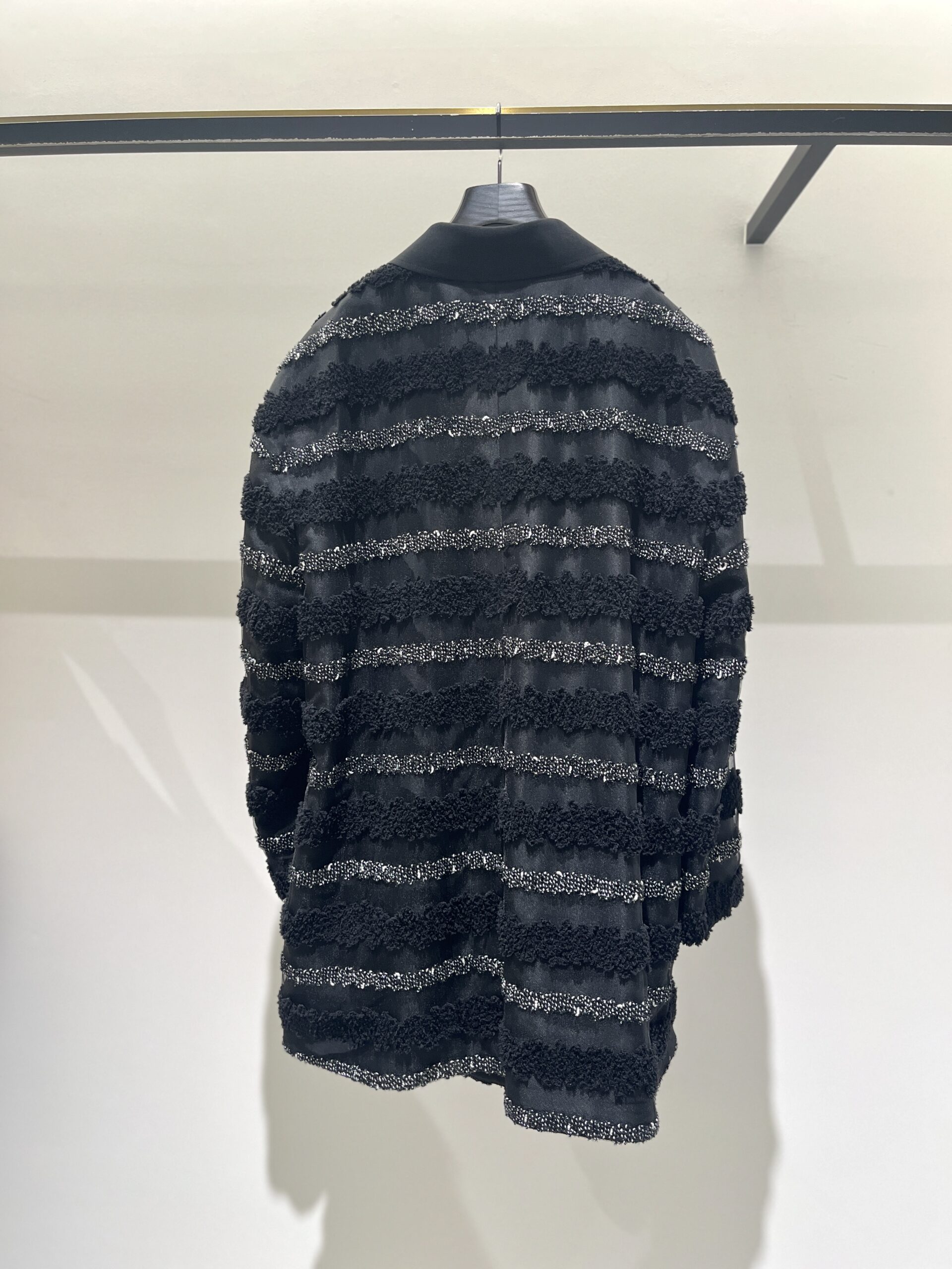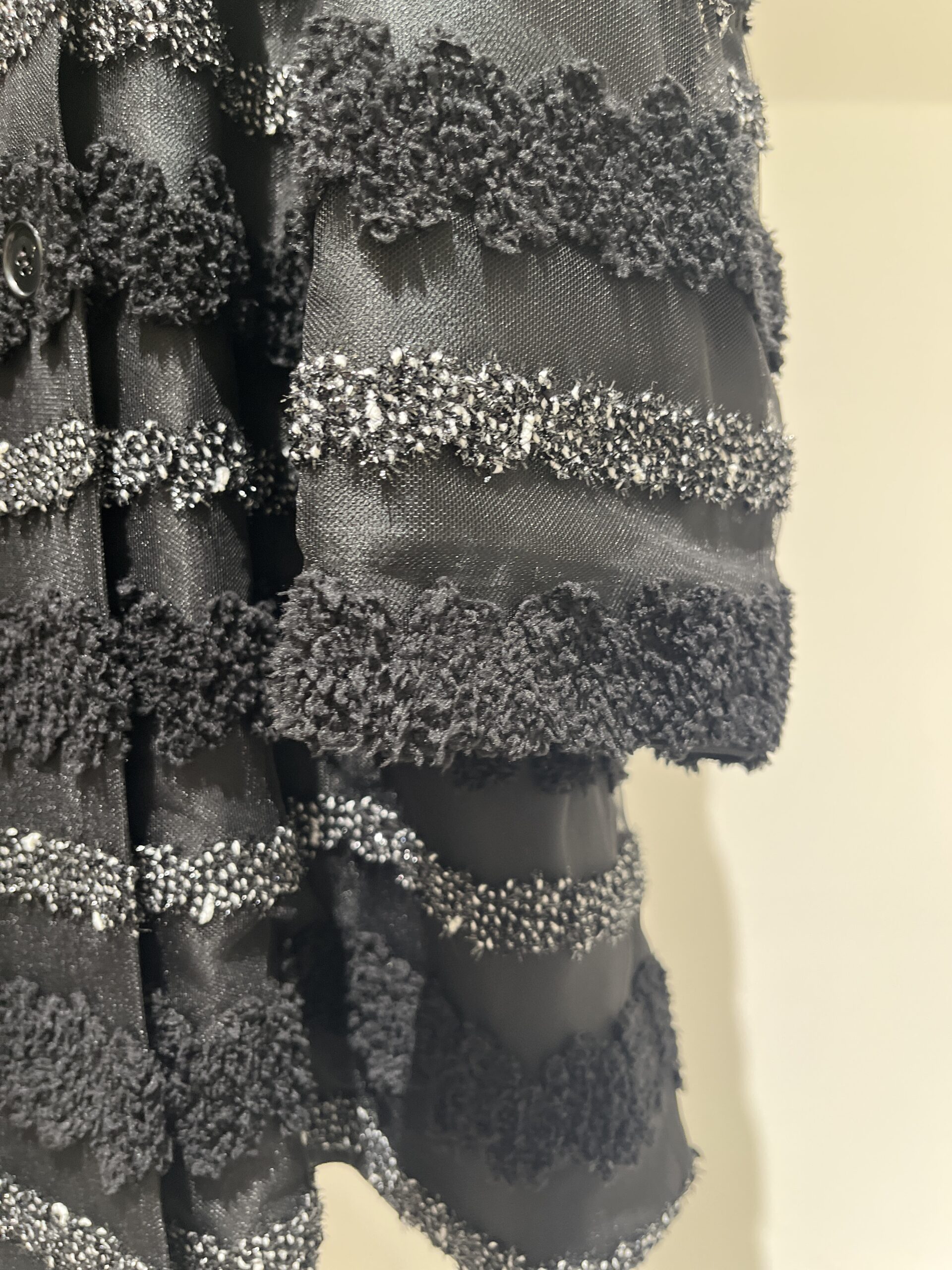 ちょっと変化球ではありますが、チュールベースの素材に膨らみのある糸や、表情のある糸をボーダー状に刺繍した素材で仕上げられた、ジャケットもとっても素敵。謝恩会などのパーティーといった華やかなシーンや、女友達と集まる食事会にもおすすめの一着。こんな遊び心が溢れたアウターでも、上品さは損なわないのが、さすがADORE」(大草)