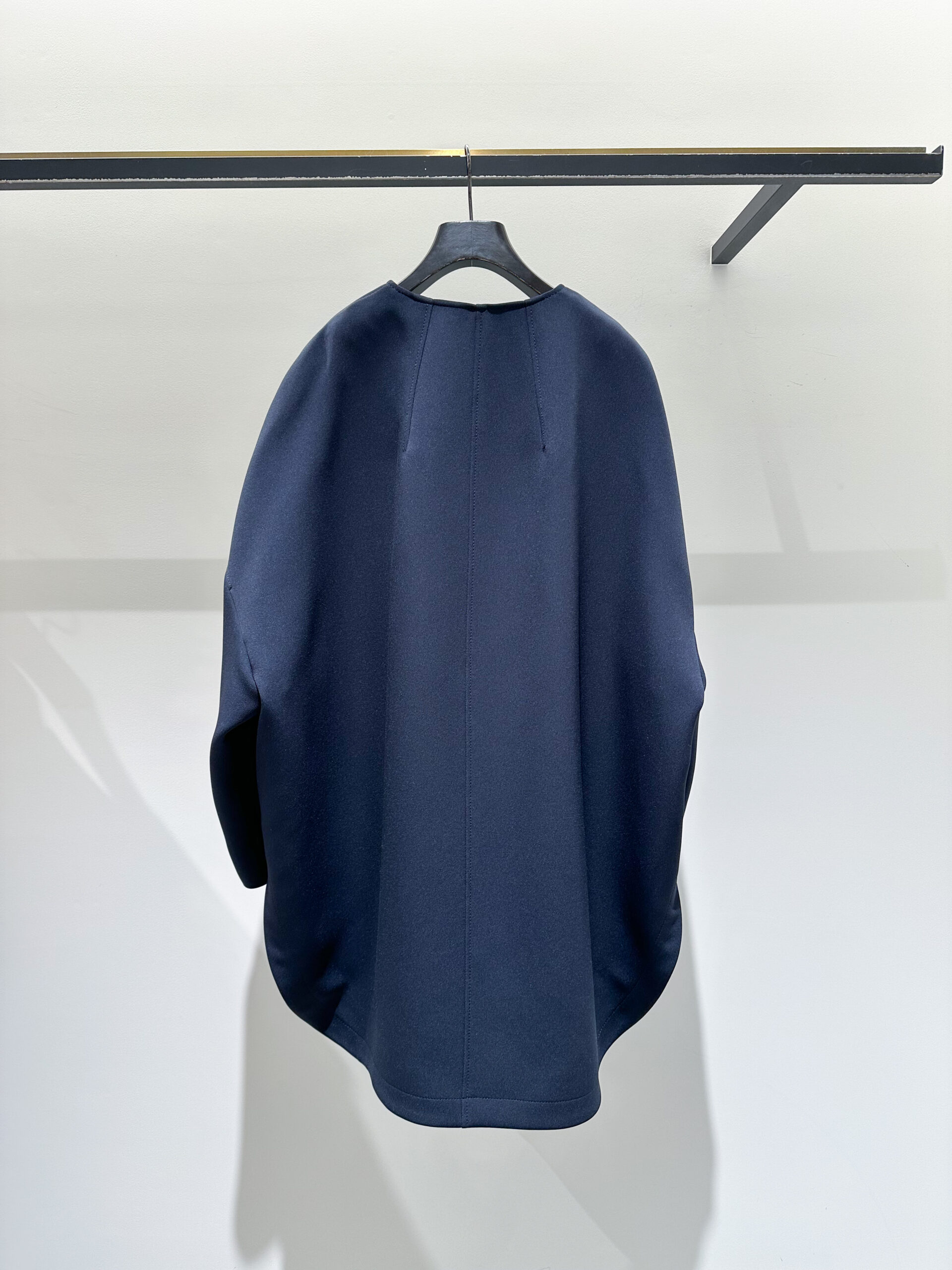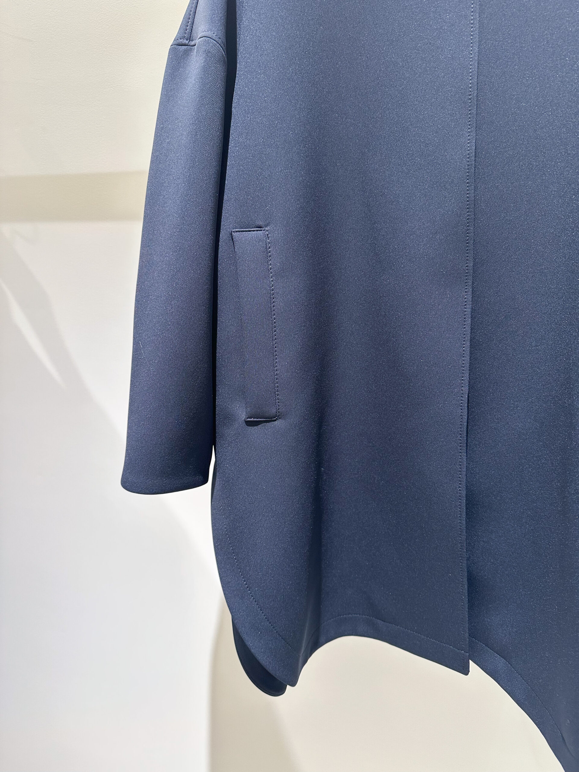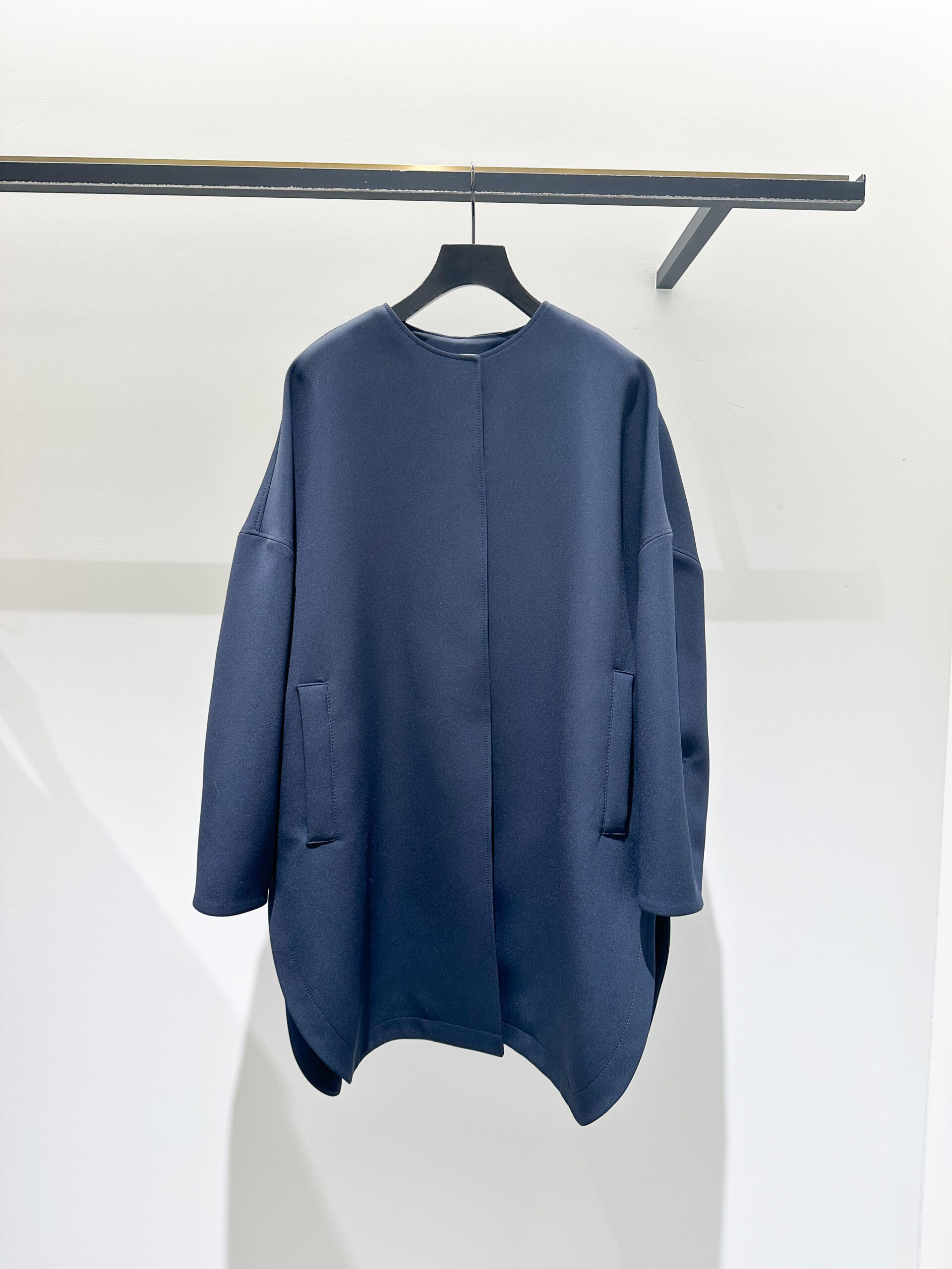 まずチェックすべきは、そのシーンにふさわしい素材感とディテールかどうか。カジュアルすぎる素材や主張の強い装飾は避けたいところですが、このノーカラーコートは軽やかなポンチ素材でありながら、表面のきめ細かな質感が圧倒的な品の良さを醸し出します。ボタンが表に見えない究極にシンプルな作りなので、どんな装いも邪魔しません。また、ノーカラーの襟元は中に着る服とのバランスに悩む必要がなく、ゆったりとした身頃と袖のデザインは、ボリュームのあるブラウスやジャケットの上からも気兼ねなく羽織れます。