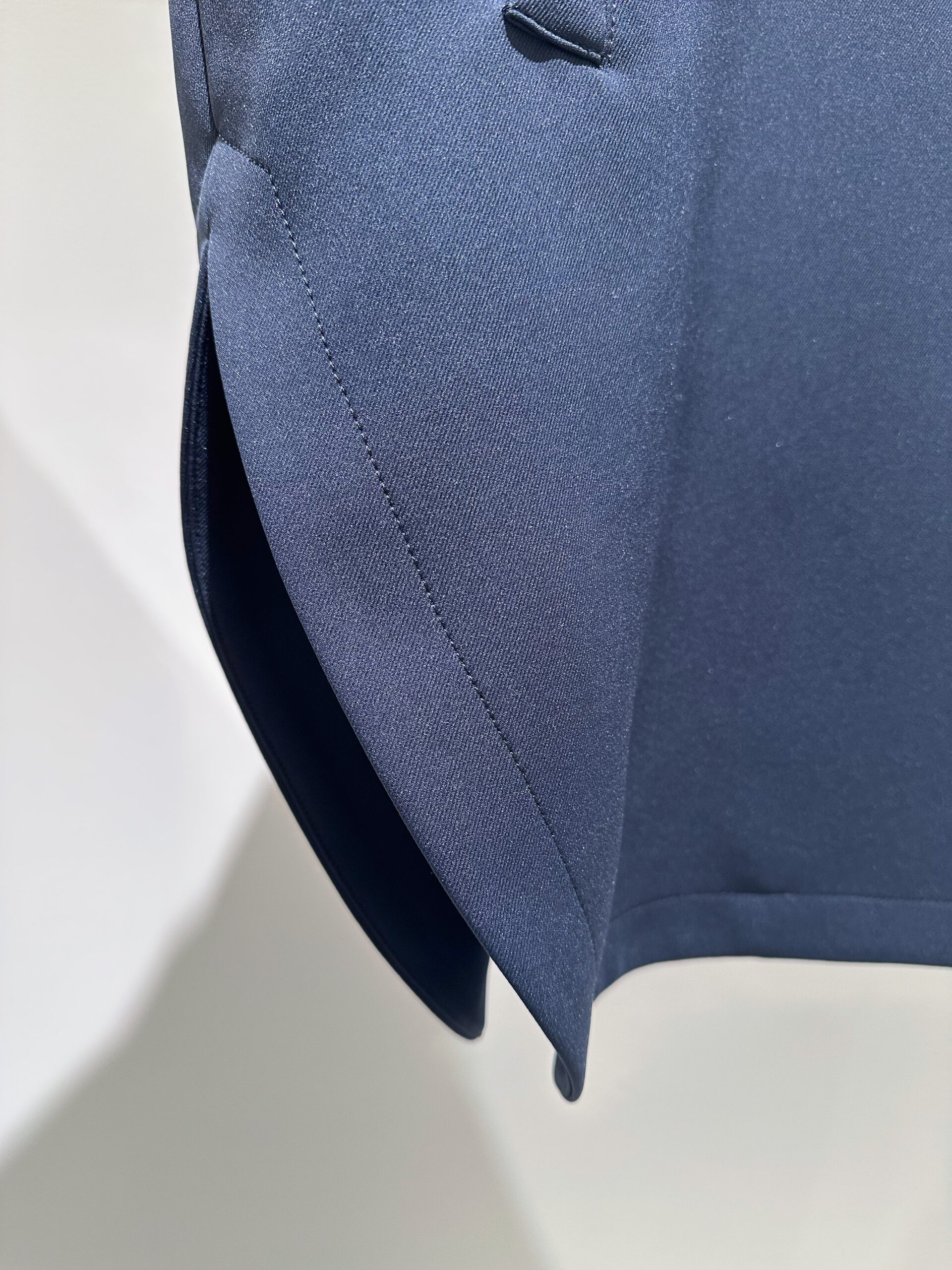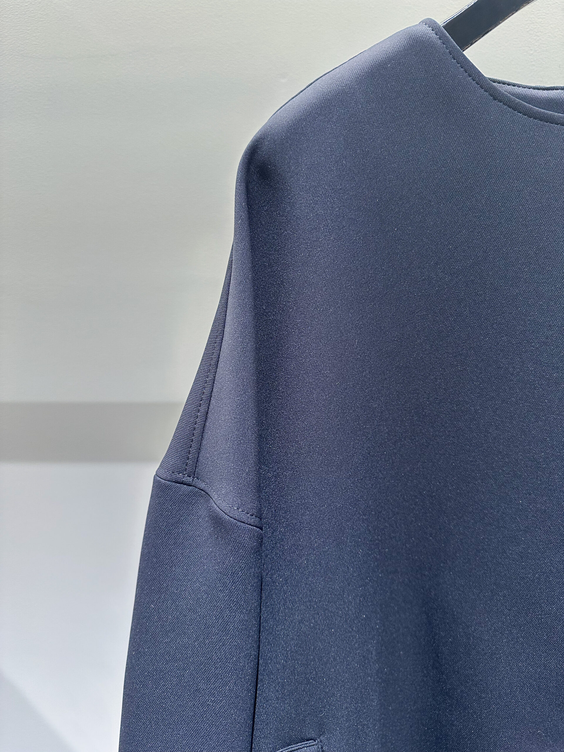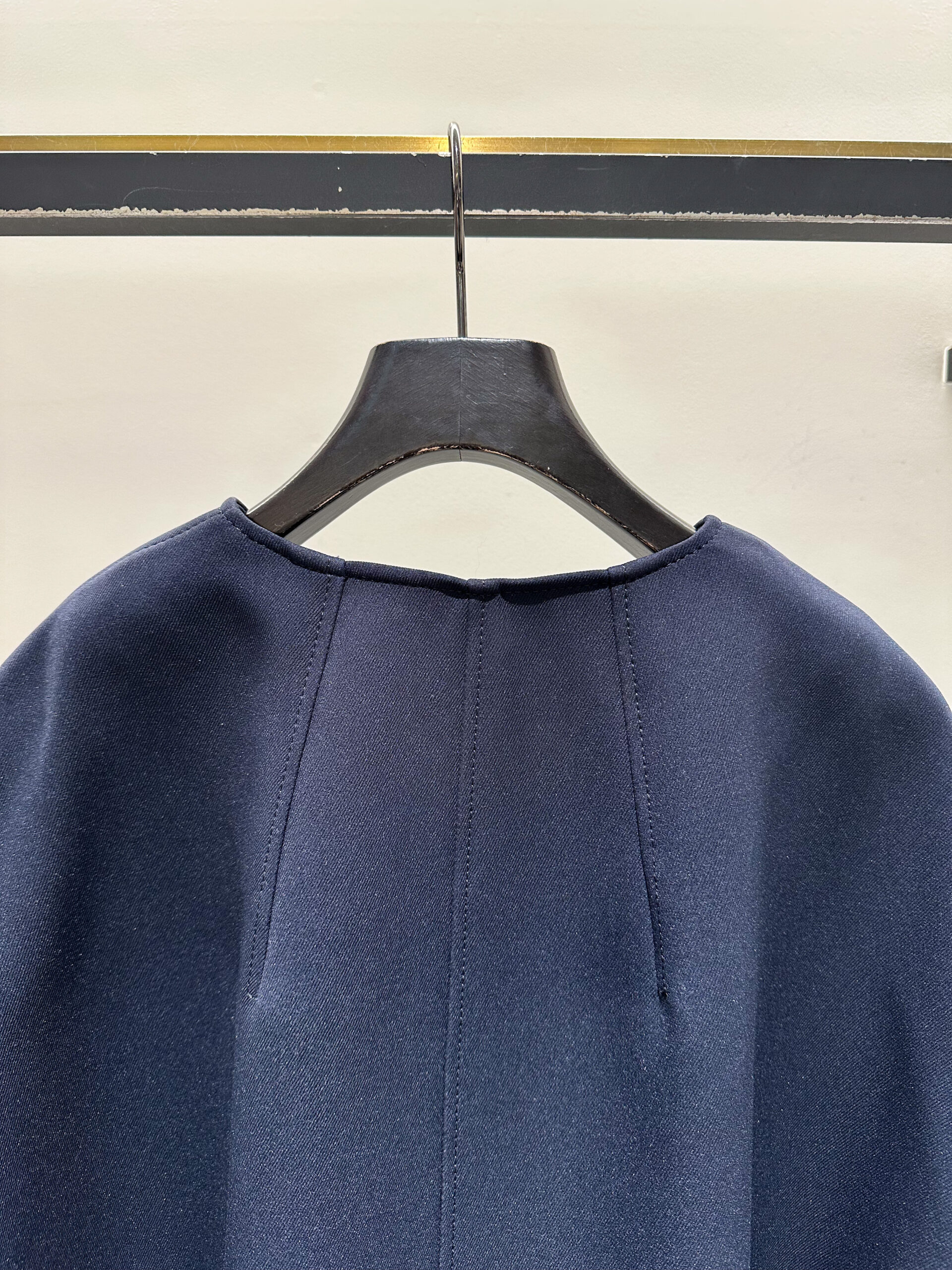 まずチェックすべきは、そのシーンにふさわしい素材感とディテールかどうか。カジュアルすぎる素材や主張の強い装飾は避けたいところですが、このノーカラーコートは軽やかなポンチ素材でありながら、表面のきめ細かな質感が圧倒的な品の良さを醸し出します。ボタンが表に見えない究極にシンプルな作りなので、どんな装いも邪魔しません。また、ノーカラーの襟元は中に着る服とのバランスに悩む必要がなく、ゆったりとした身頃と袖のデザインは、ボリュームのあるブラウスやジャケットの上からも気兼ねなく羽織れます。