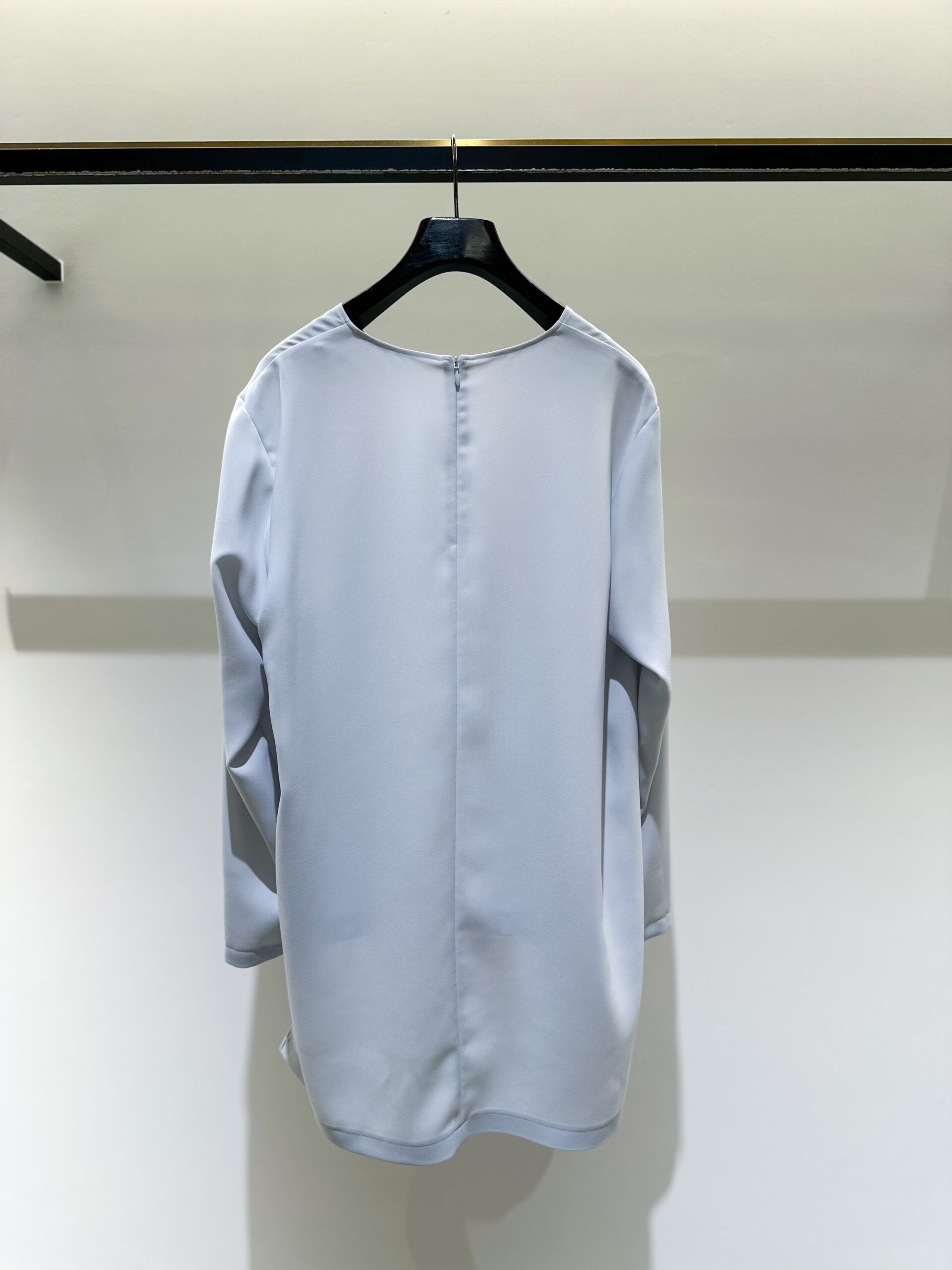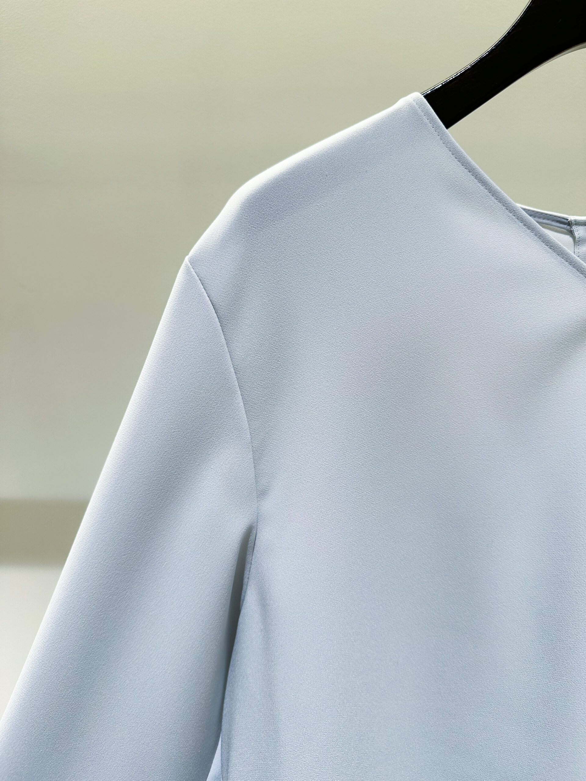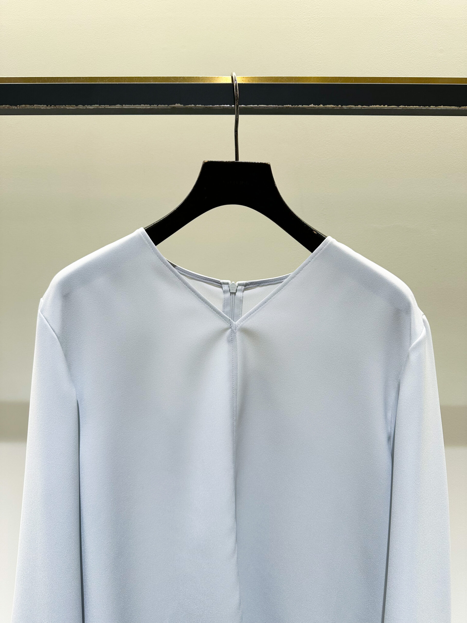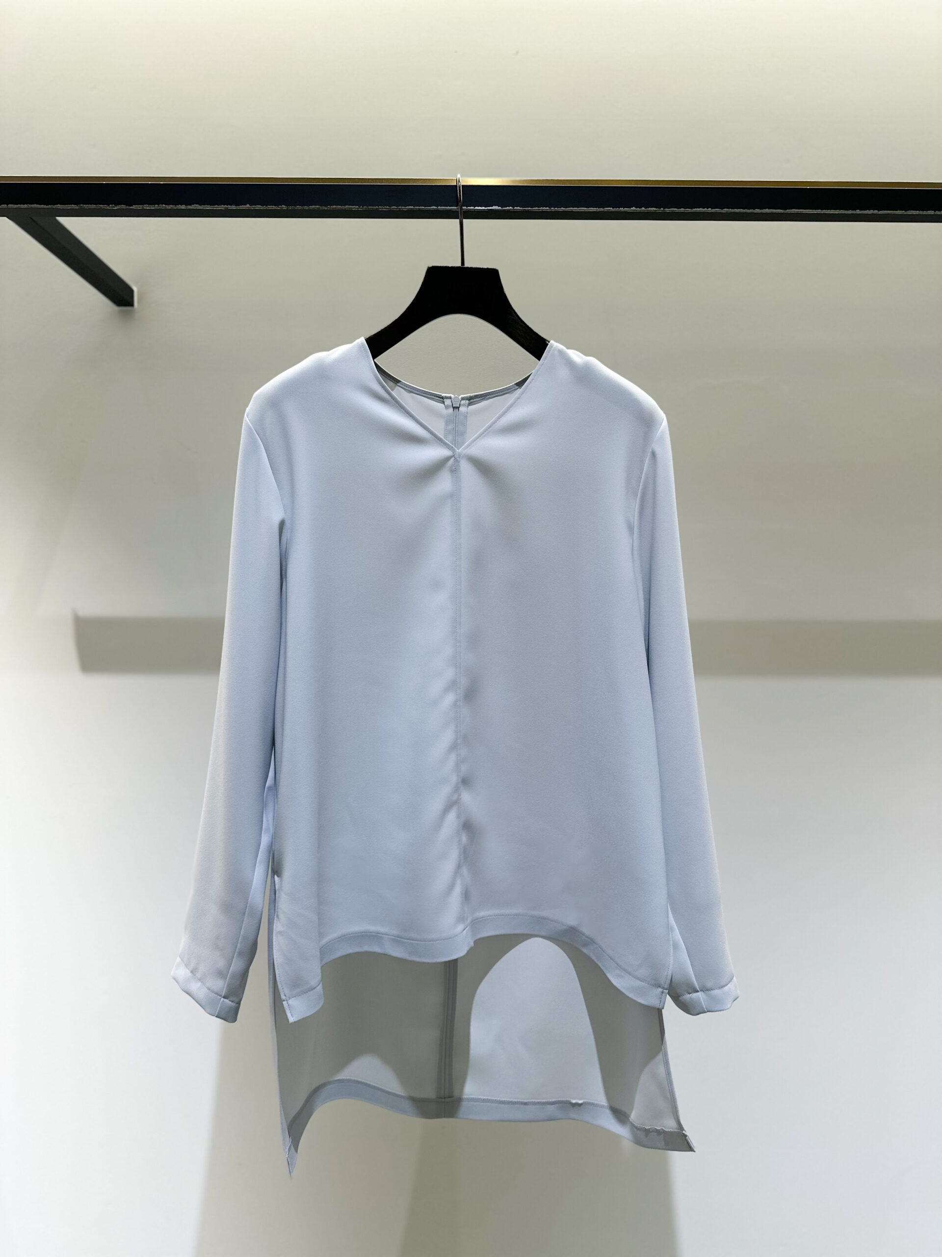 まずトップスは、さらさらとした素材が生み出すドレープがとってもエレガントなブラウス。後ろ身頃を長めに設定しているので、アウトスタイルで着ても、フロントだけインしても、シルエットが崩れず綺麗に収まります。首周りは鎖骨が美しく映えるVネックライン。ストレッチがしっかり効いているので、着心地はどこまでもストレスフリーです。 さらに嬉しいのが、ご自宅でのお洗濯が可能なこと。暖房が効いた室内で汗ばむような日も、気兼ねなく、常に清潔感を保っていただけます。今回はあえてゆったりとしたニュアンスを出したかったので、トップスは38サイズのサイズ展開ですが、幅広い体型の方に着ていただけるサイジングです。パンツは36、38サイズの2展開ですので、より、お好みのシルエットで楽しんでいただけます。