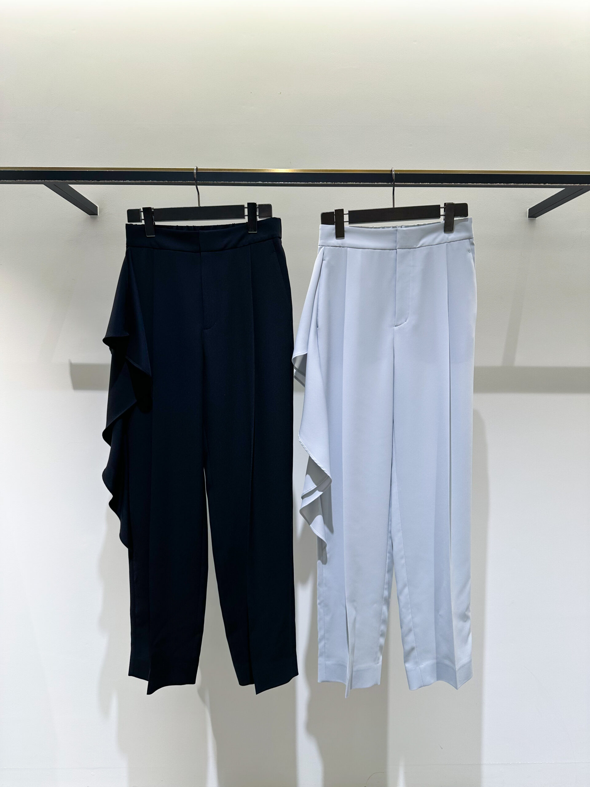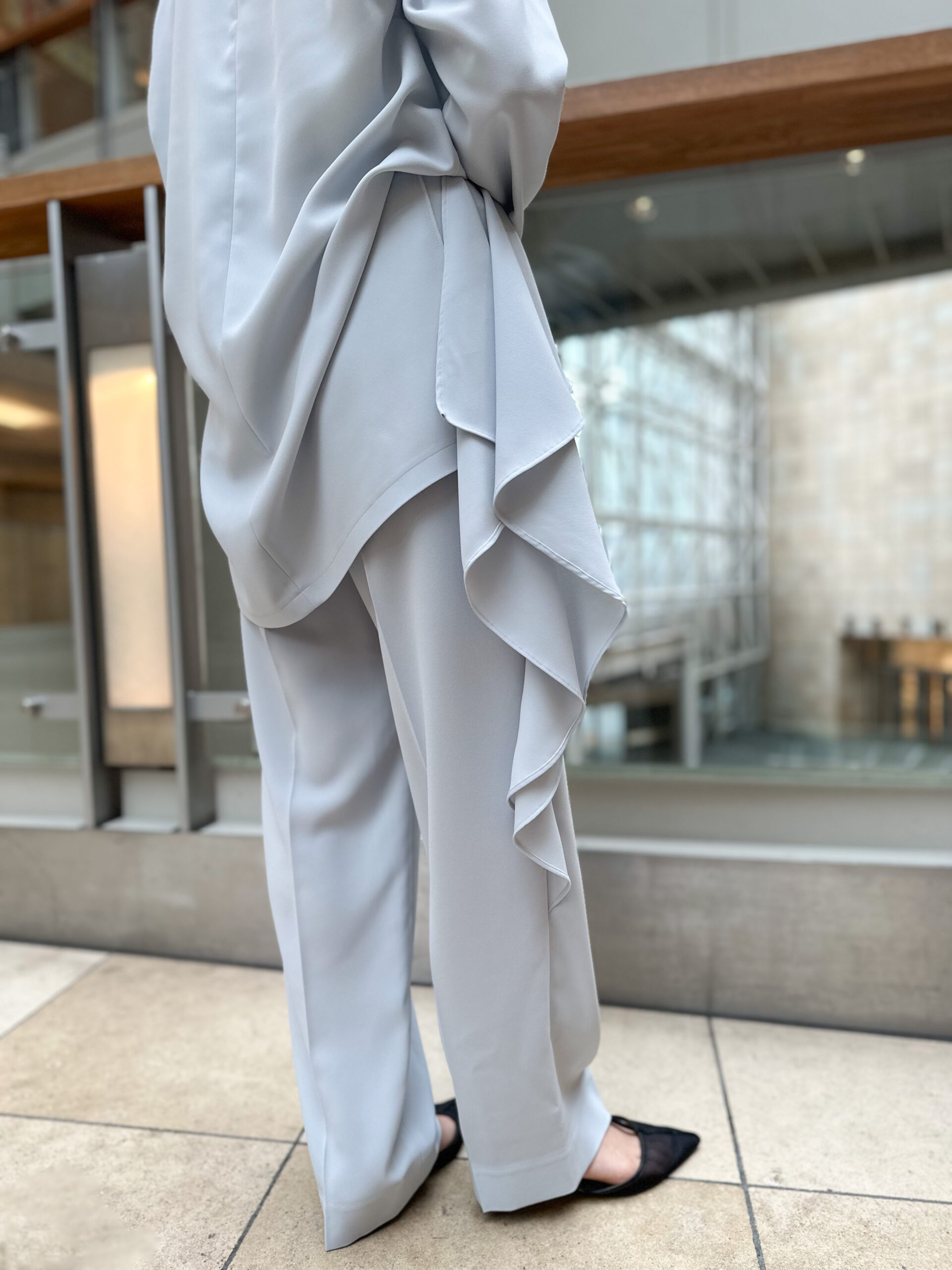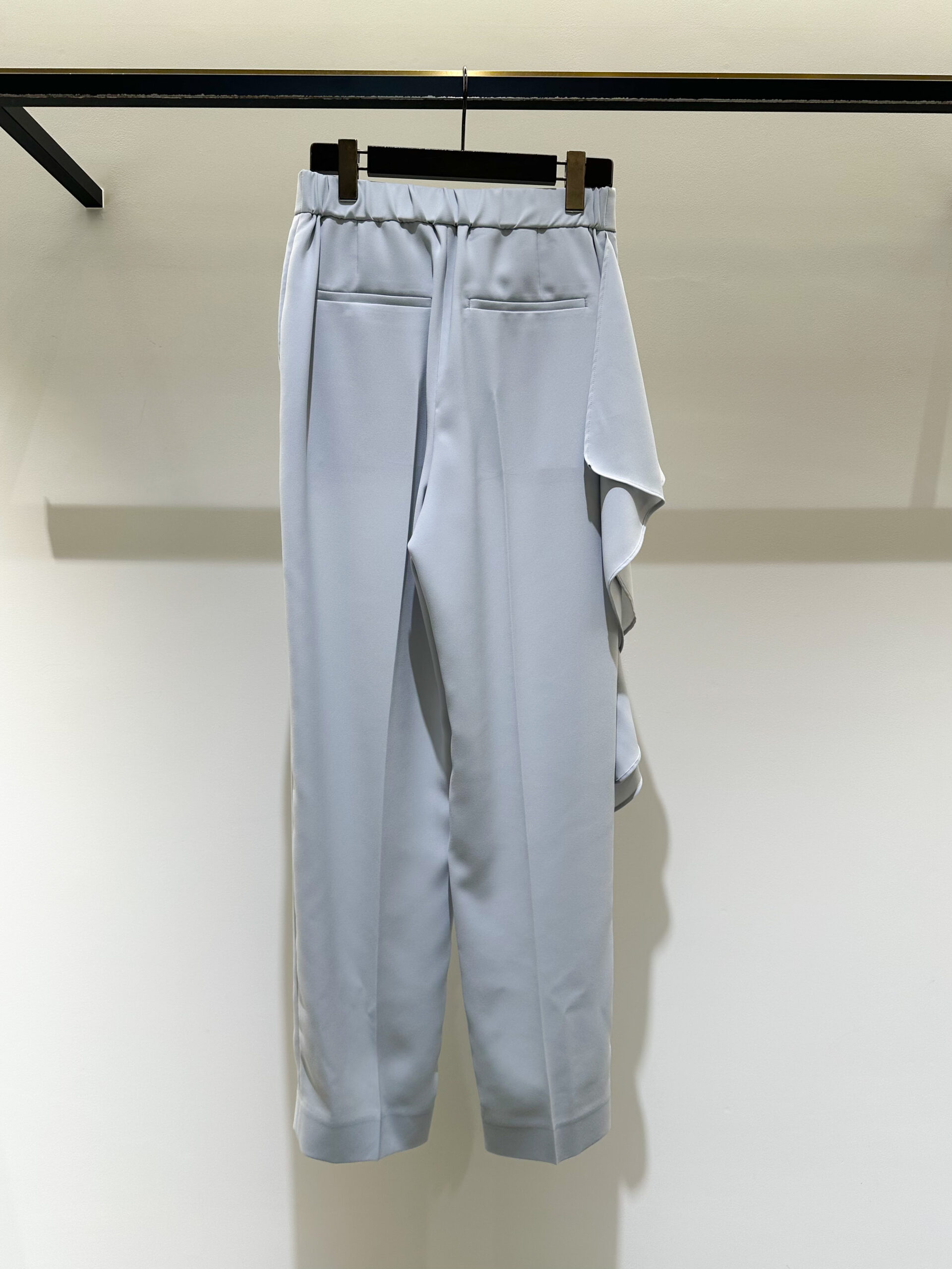 パンツは、アシンメトリーなデザインに大胆なラッフルパーツを挟み込んだ、ブランドらしい意匠が光る一本。適度な反発感とソフトな風合いが特徴の、バックサテン素材で仕立てました。一見、難易度が高そうに見えるデザインですが、計算されたアシンメトリーなバランスが、脚をすっきりと、洗練された印象に見せてくれます。
