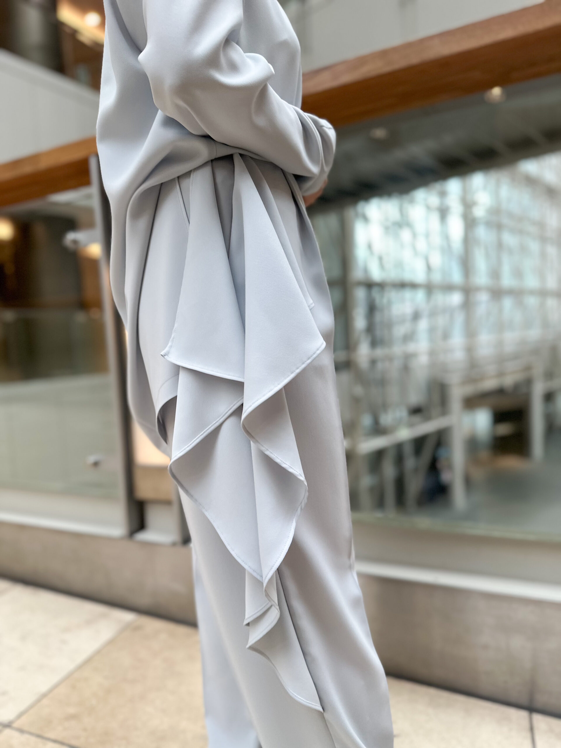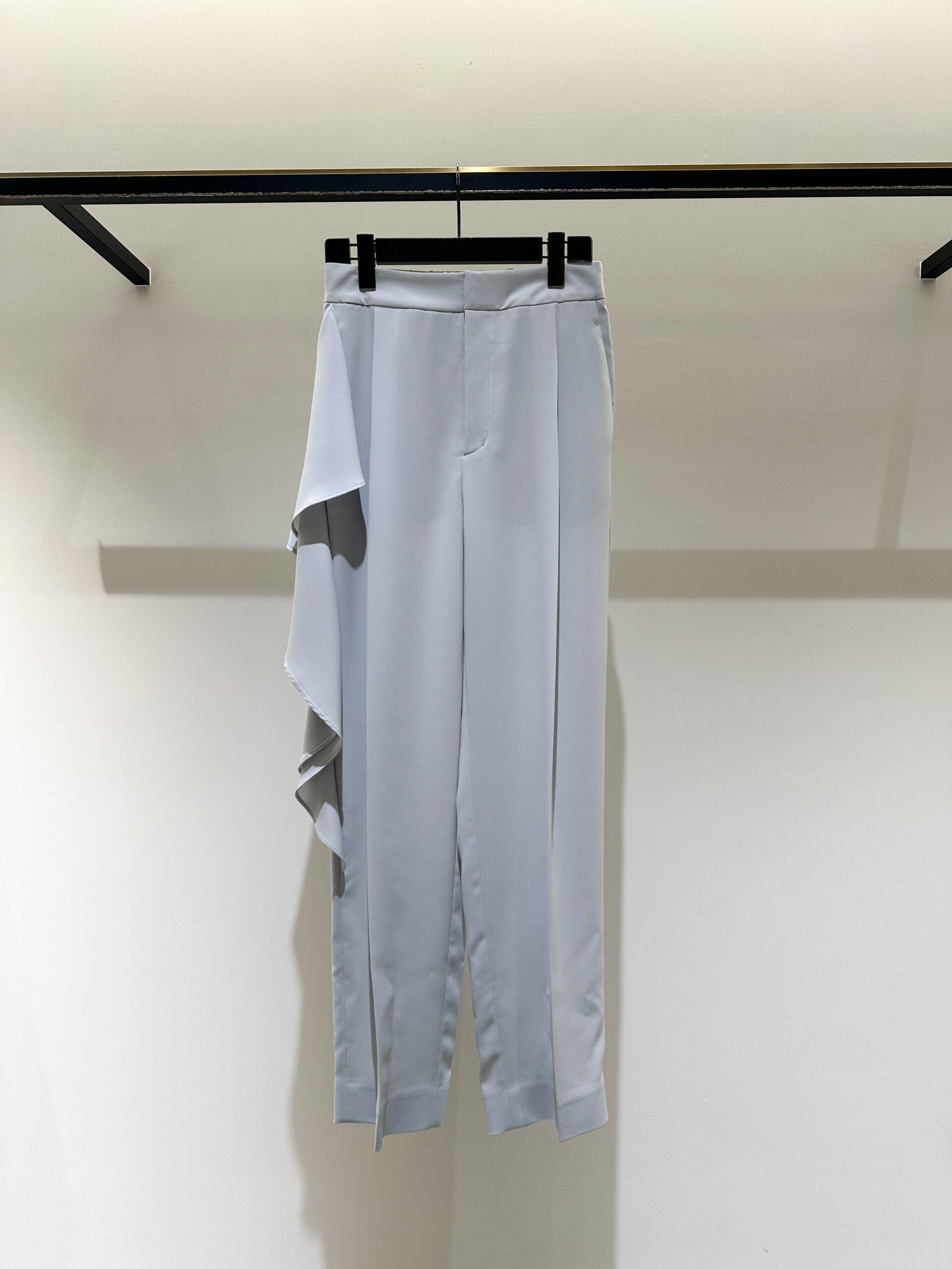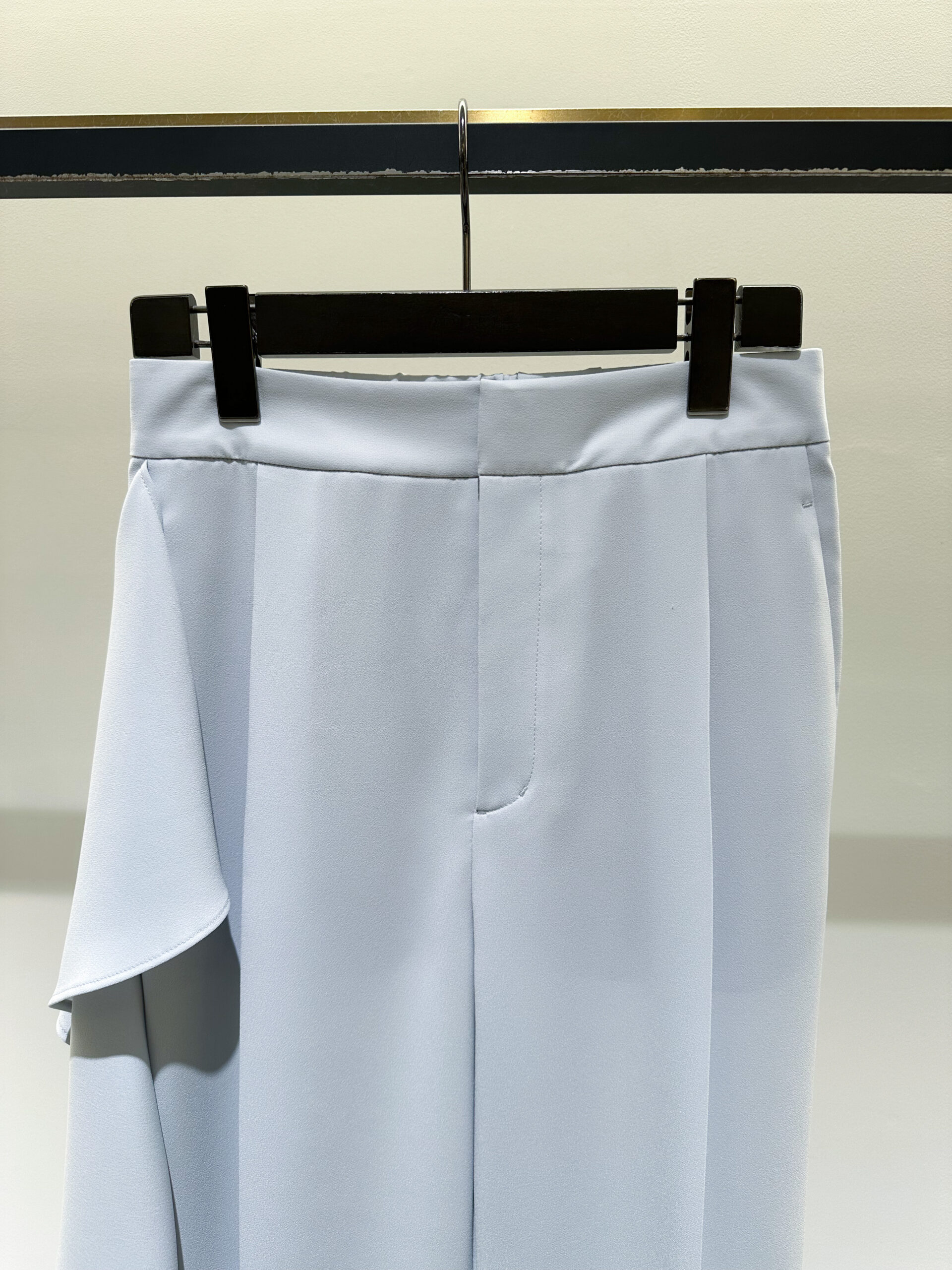 パンツは、アシンメトリーなデザインに大胆なラッフルパーツを挟み込んだ、ブランドらしい意匠が光る一本。適度な反発感とソフトな風合いが特徴の、バックサテン素材で仕立てました。一見、難易度が高そうに見えるデザインですが、計算されたアシンメトリーなバランスが、脚をすっきりと、洗練された印象に見せてくれます。