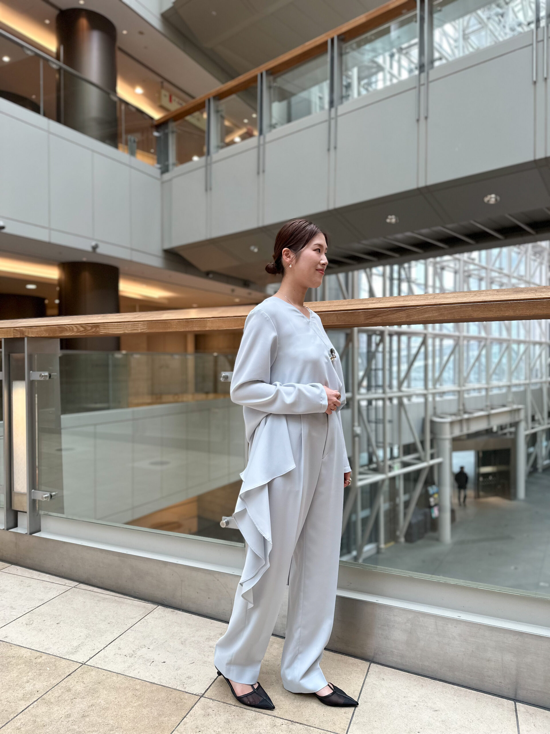 爽やかなライトグレーは、ダークカラーが多くなりがちなセレモニーの会場を、パッと明るくしてくれるカラー。潔くワントーンでまとめるセットアップはもちろん、上下で色を変えるバイカラーの着こなしも素敵です。
