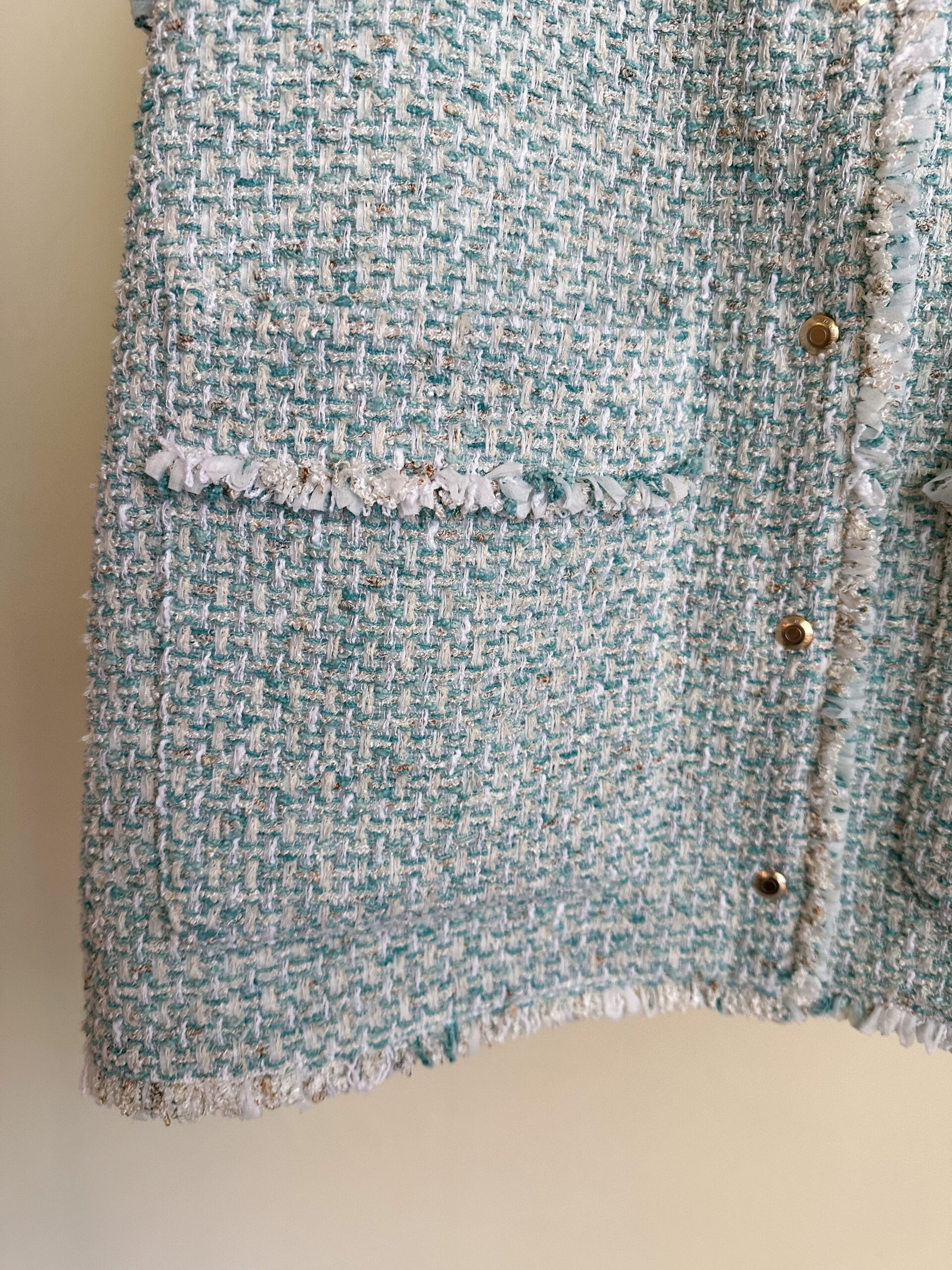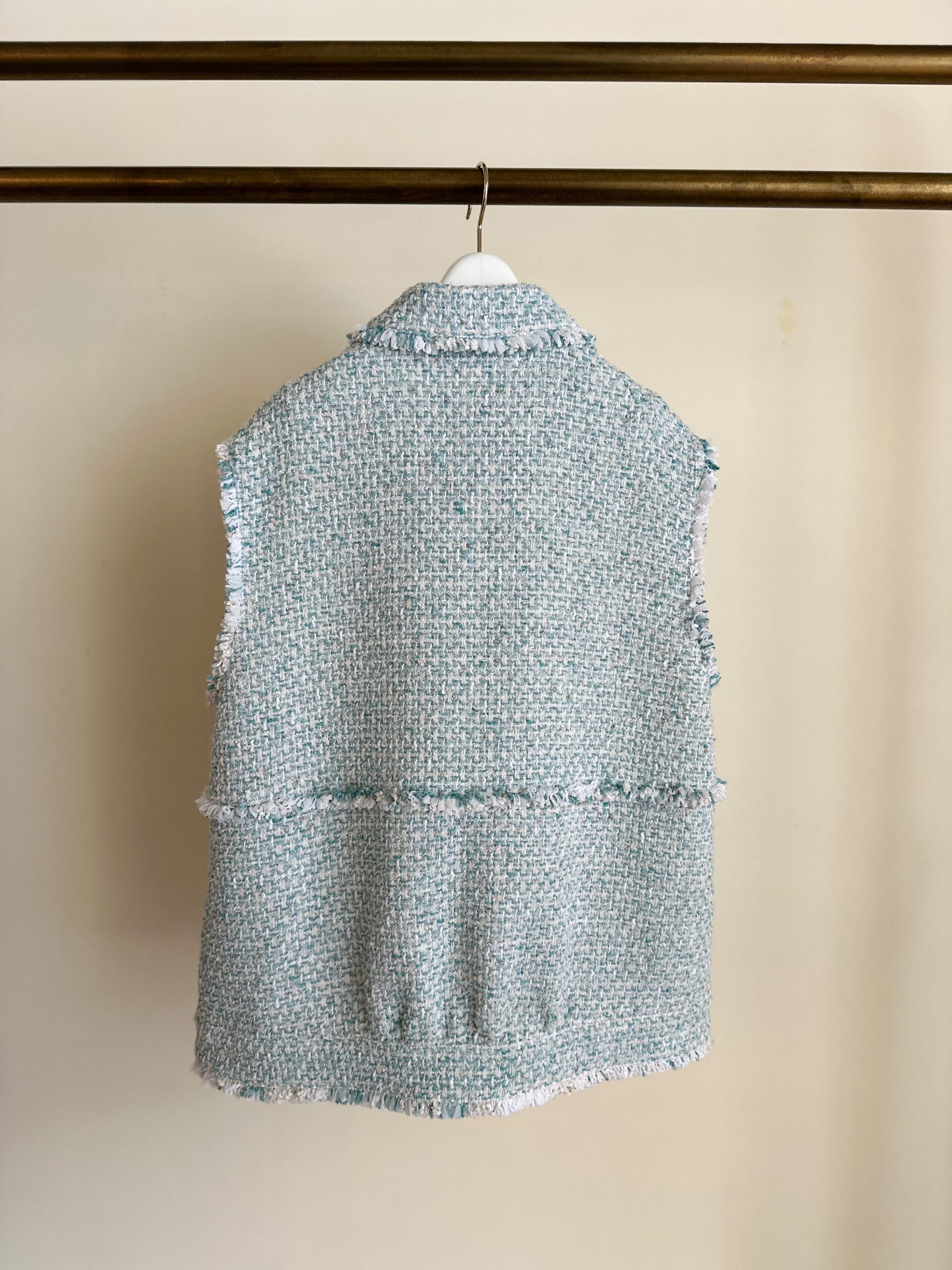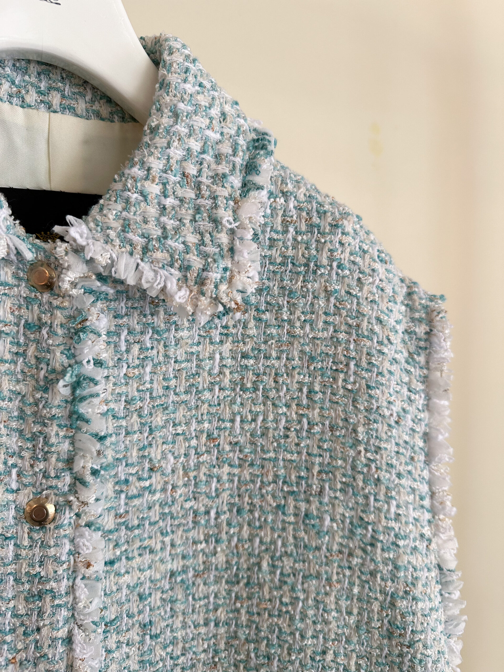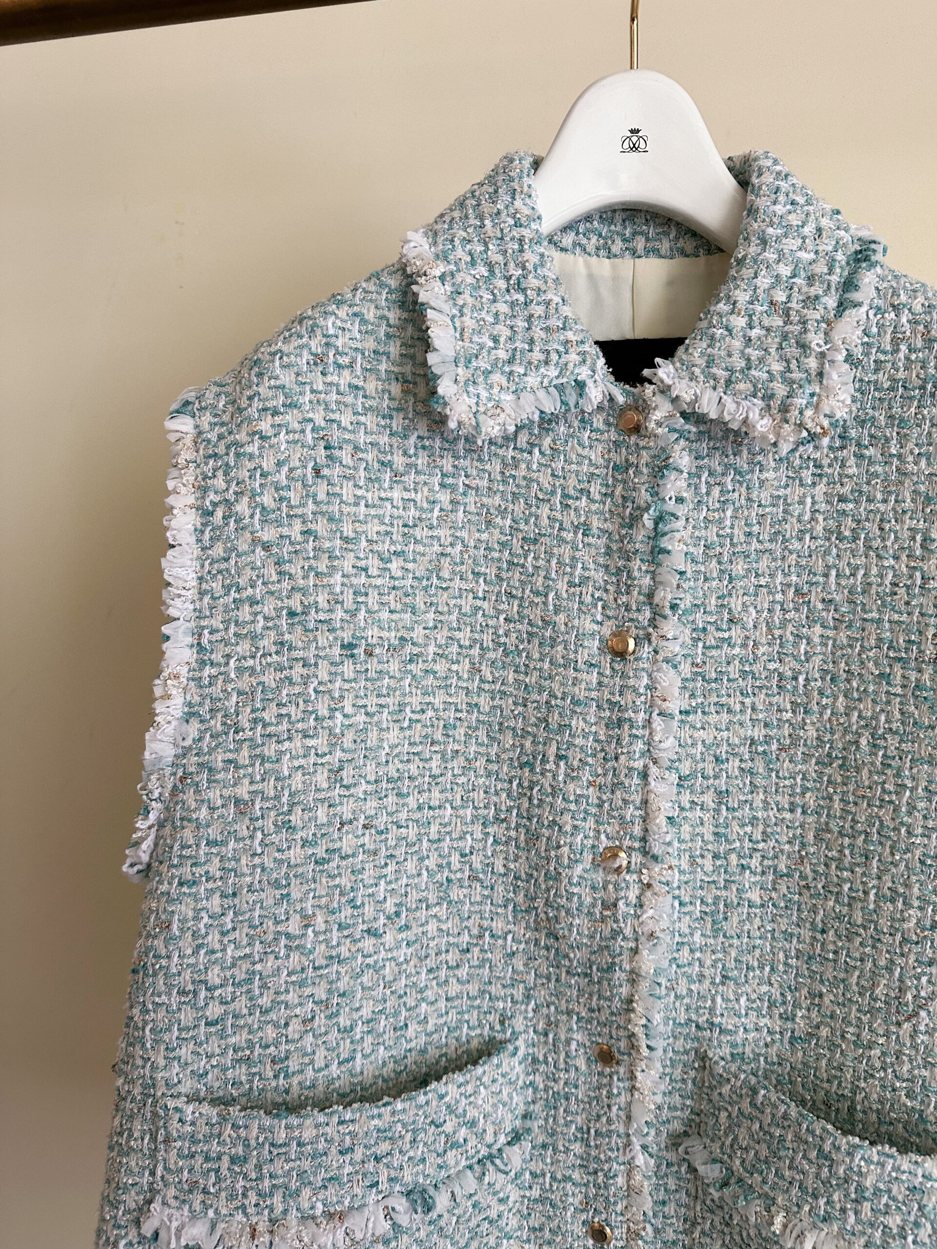 まずは、カバーオールの袖を潔く削ぎ落としたような、すっきりとしたデザインの襟付きジレ。レイヤードを自在に楽しめるオーバーサイズのボックスシルエットが魅力です。端にあしらわれた共糸のフリンジテープが、さりげない華やぎをプラス。爽やかなミントグリーンは、気分をパッと明るくしてくれます。カジュアルなデニムで崩しても、サテンのスカートで艶を足しても。