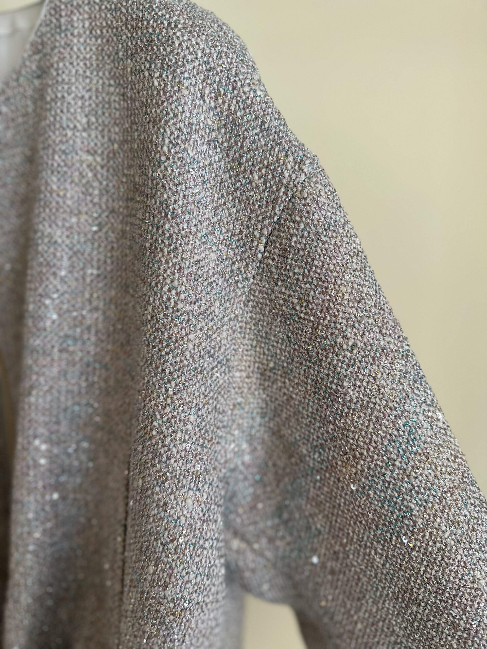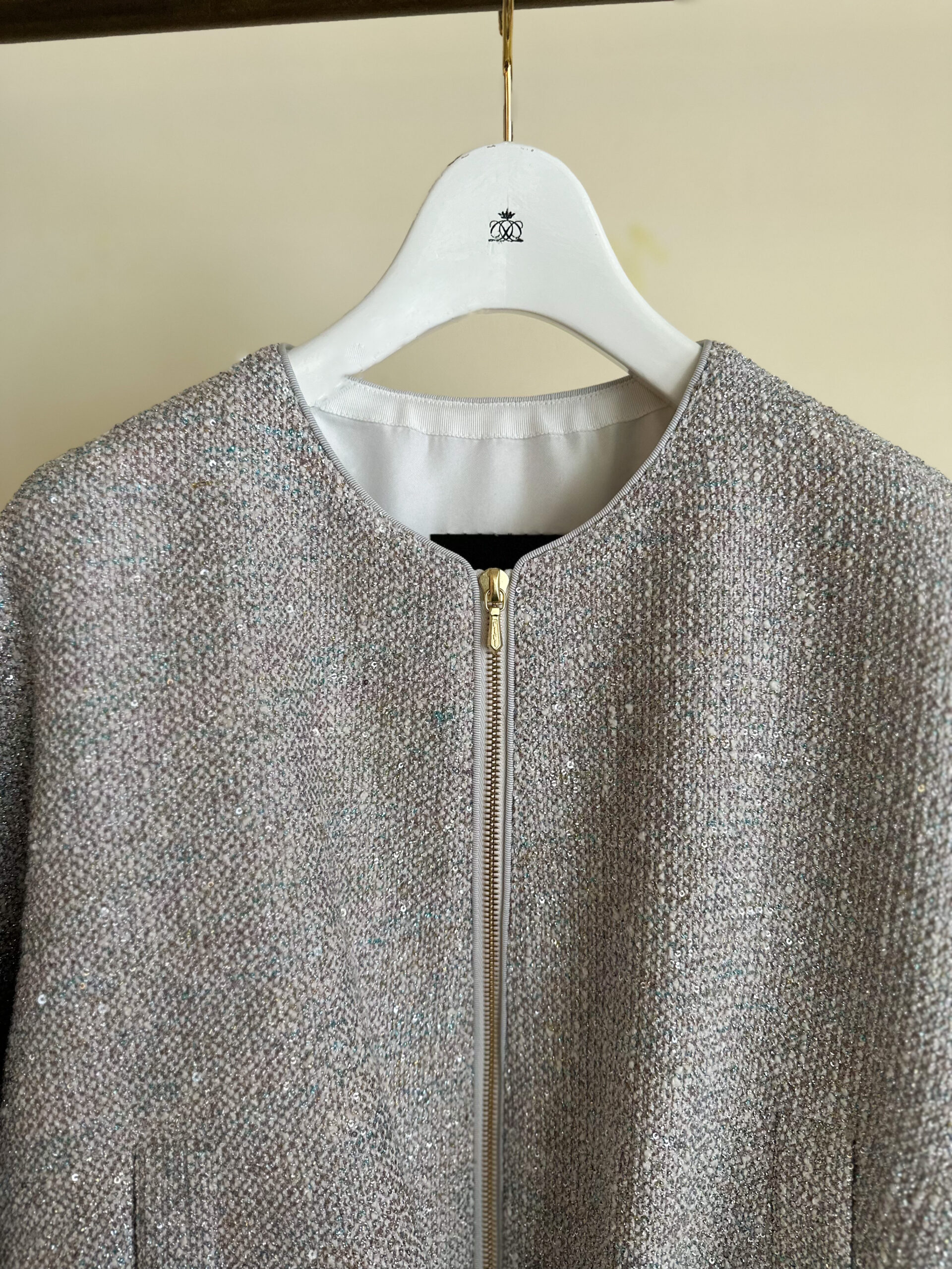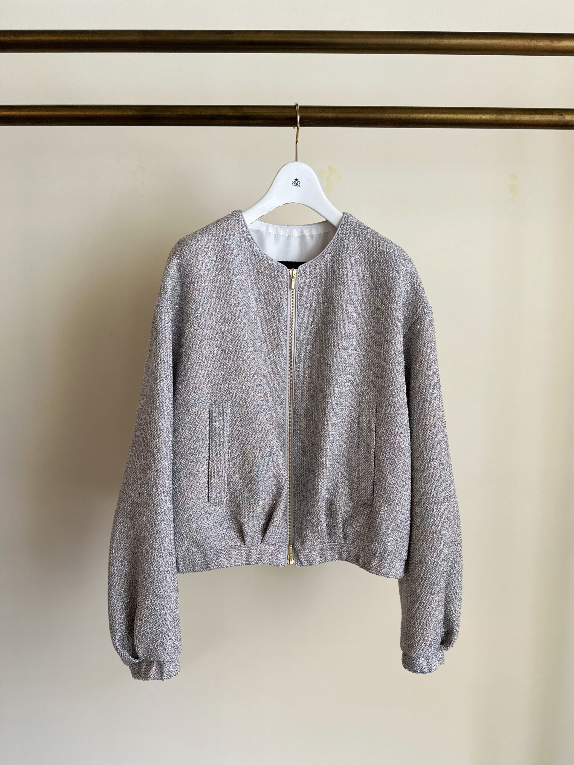 最後は、上品な輝きが特徴のノーカラーブルゾン。コンパクトなサイズ感とすっきりとした首回りが魅力の一着です。袖口や裾に施されたタックとギャザーが、ふんわりと愛らしい丸みのあるシルエットに。重厚感がありながら、しなやかなフォルムを形作るコットンミックスのツイード生地。クラフト感のある糸使いの中に、マルチカラースパンコールが繊細に散りばめられ、大人の華やかさを演出してくれます。