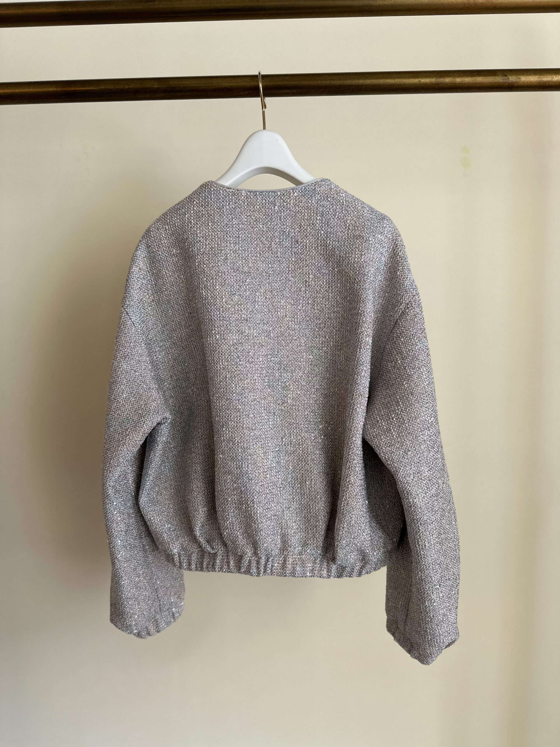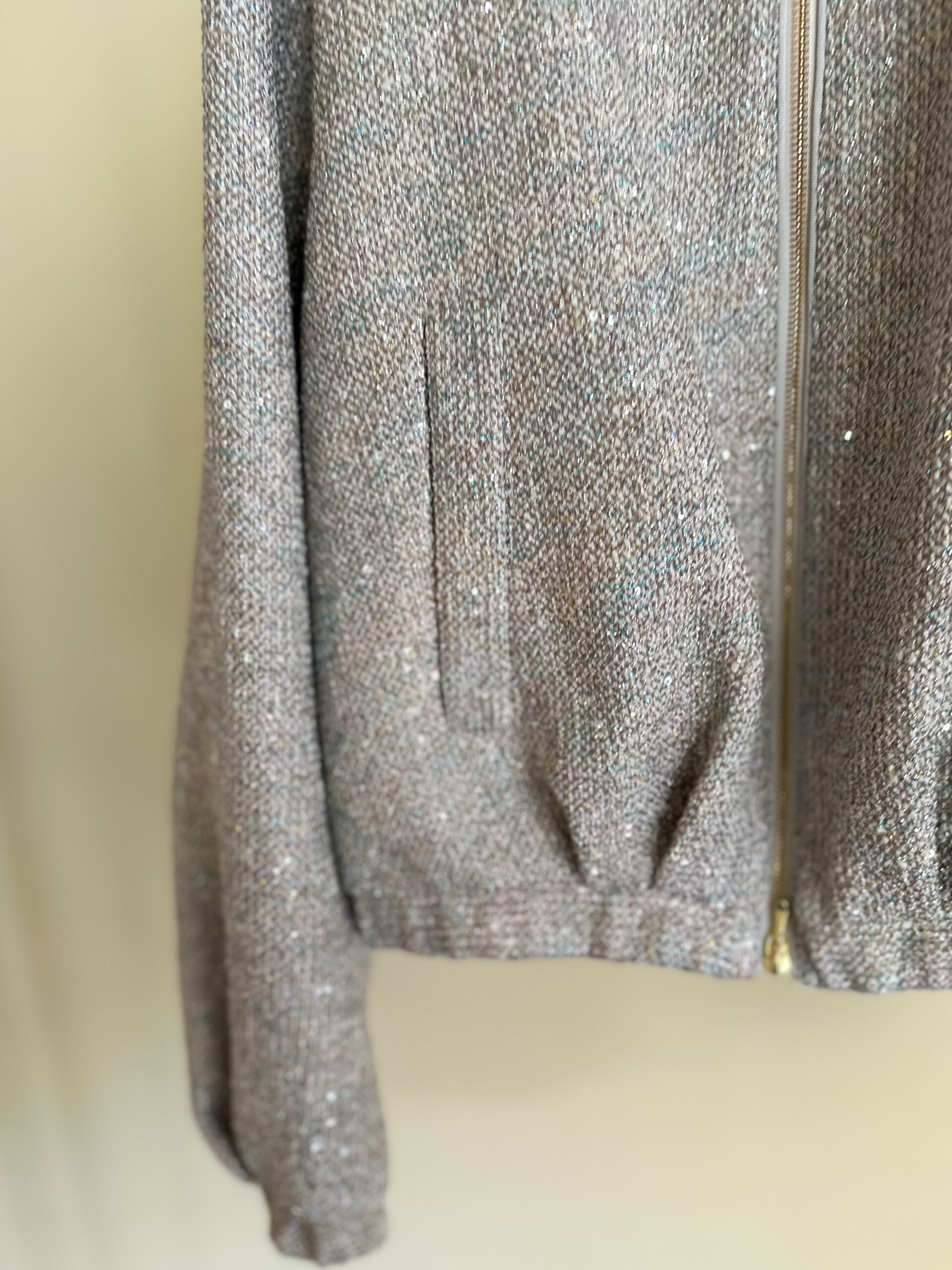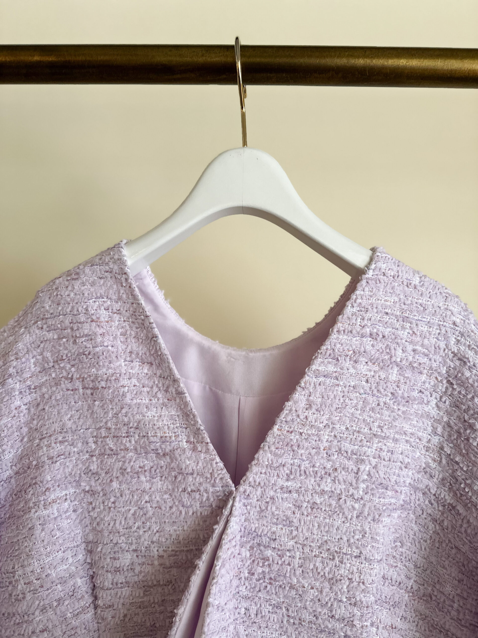 最後は、上品な輝きが特徴のノーカラーブルゾン。コンパクトなサイズ感とすっきりとした首回りが魅力の一着です。袖口や裾に施されたタックとギャザーが、ふんわりと愛らしい丸みのあるシルエットに。重厚感がありながら、しなやかなフォルムを形作るコットンミックスのツイード生地。クラフト感のある糸使いの中に、マルチカラースパンコールが繊細に散りばめられ、大人の華やかさを演出してくれます。