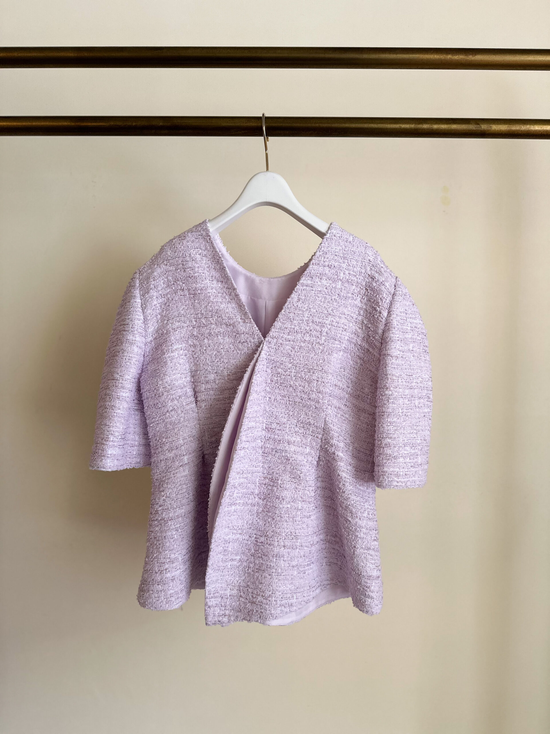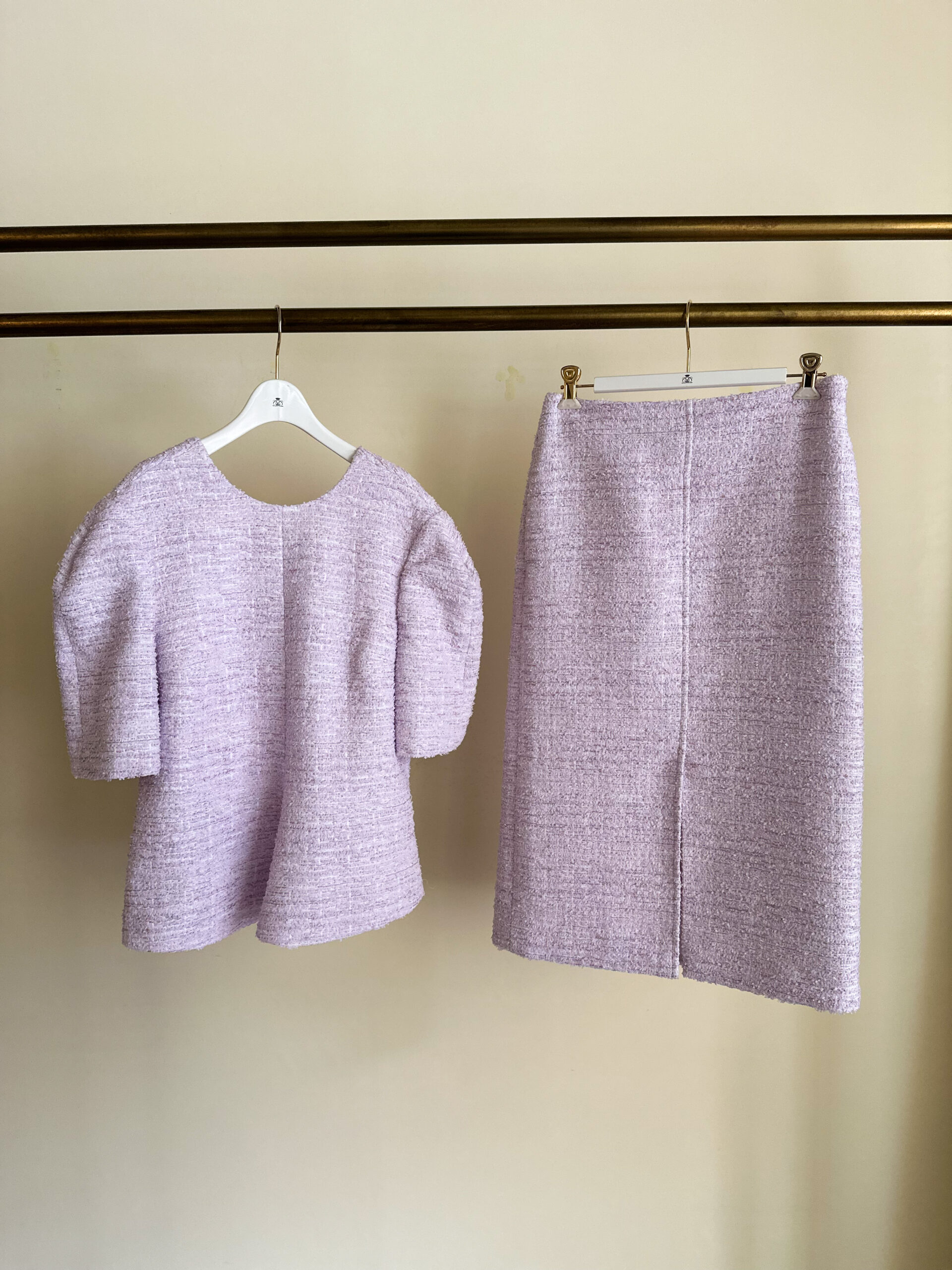 続いては、構築的なベルスリーブが目を惹くフォギーピンクのブラウス。華奢な肩のラインからすっと伸びる立体的なフォルムと、バックコンシャスなディテールが、女性らしいエレガンスと圧倒的な存在感を引き出します。トレンドのパワーショルダーを意識しつつも、あえて肩パッドを入れないことで、柔らかな女性らしさを残しているのがDrawerのこだわり。同素材のスカートとセットアップもおすすめ。