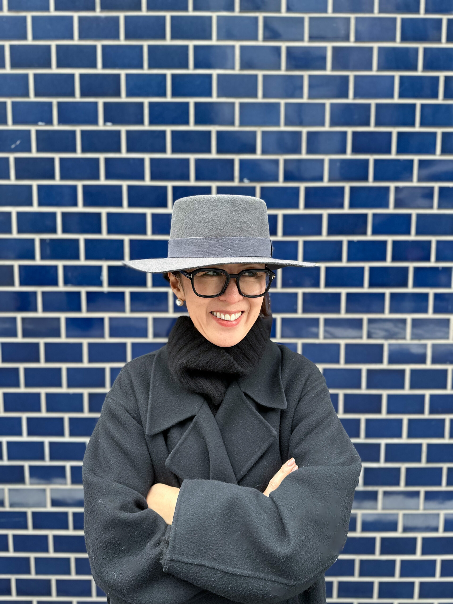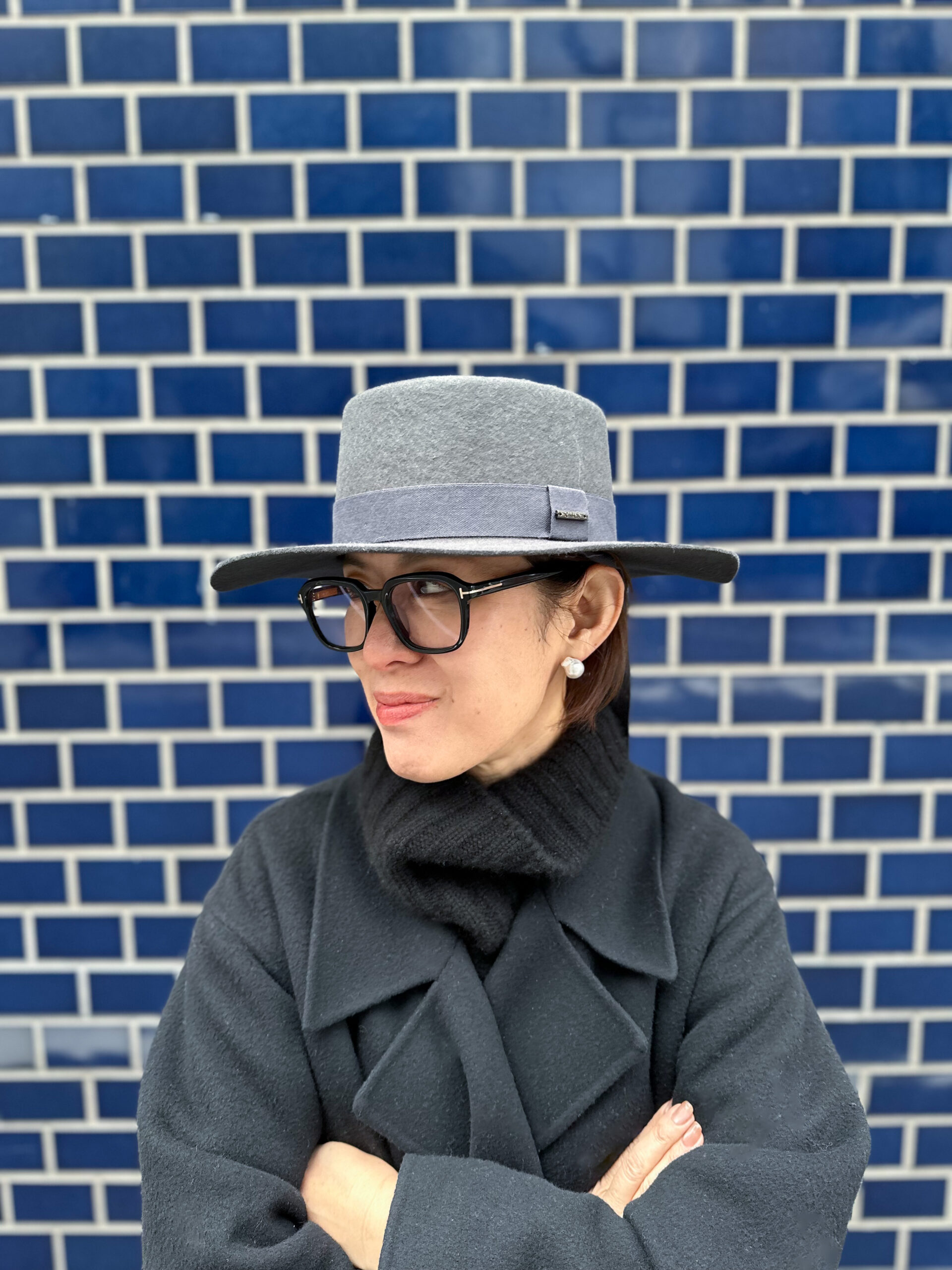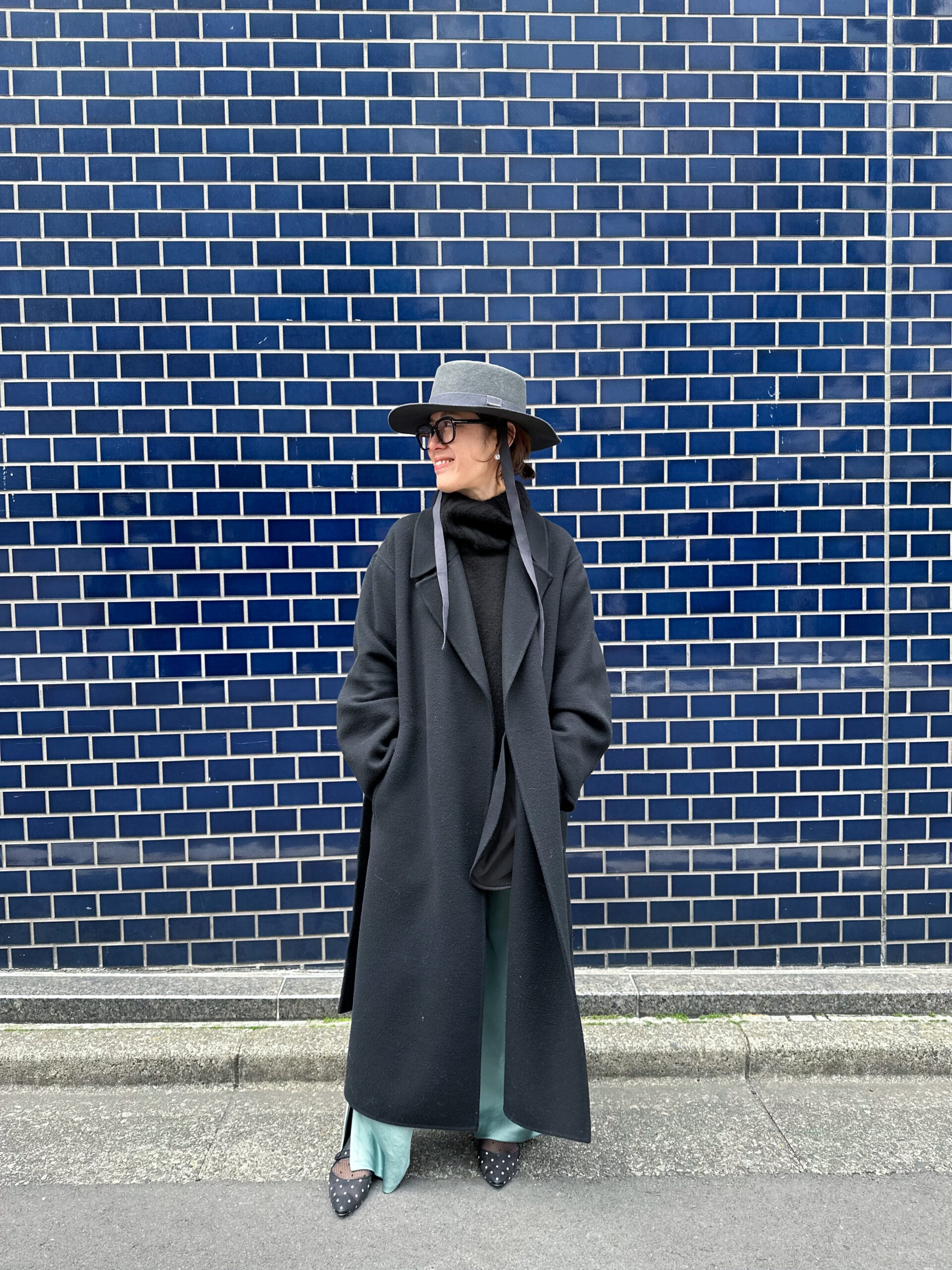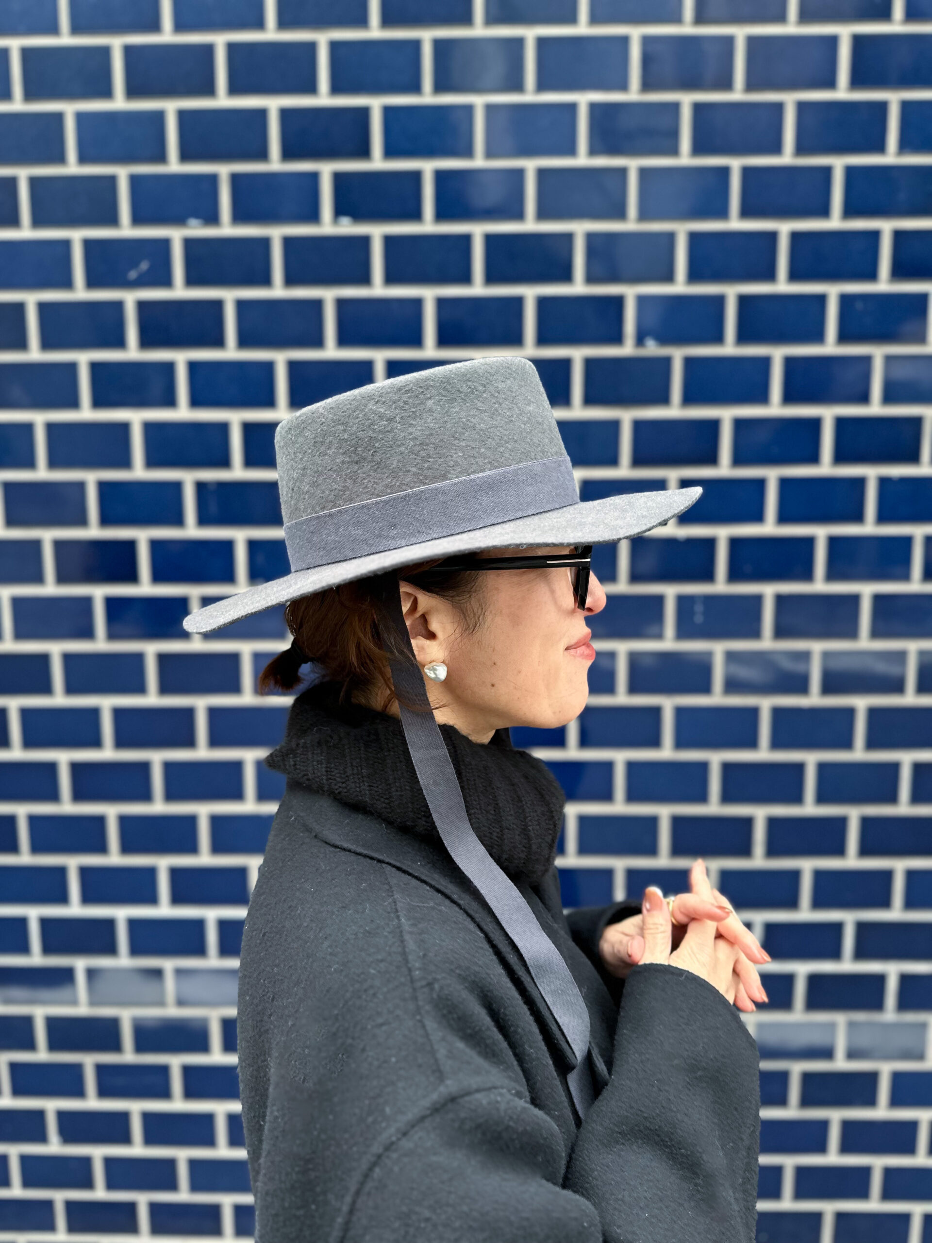 このグレーのハットを選んだのは、その理由は“可愛かった”から(笑)。店頭に並んでいるたくさんの帽子の中で、一番に目に飛び込んできたもの。フラットなクラウンに、ドラマティックな広めのツバ、さらに顎下で結ぶリボンがアクセントに。モードでクラシカルなその佇まいは、シンプルなモノトーンコーディネートを、一瞬で今の表情に引き寄せてくれます。何かひとつは今回購入したいと思っていたので、迷わずこれを選びました♡ サイズ調節ができるという安心感も相まって、冬だけでなく一年中、ワードローブの主役になってくれそう」(大草)