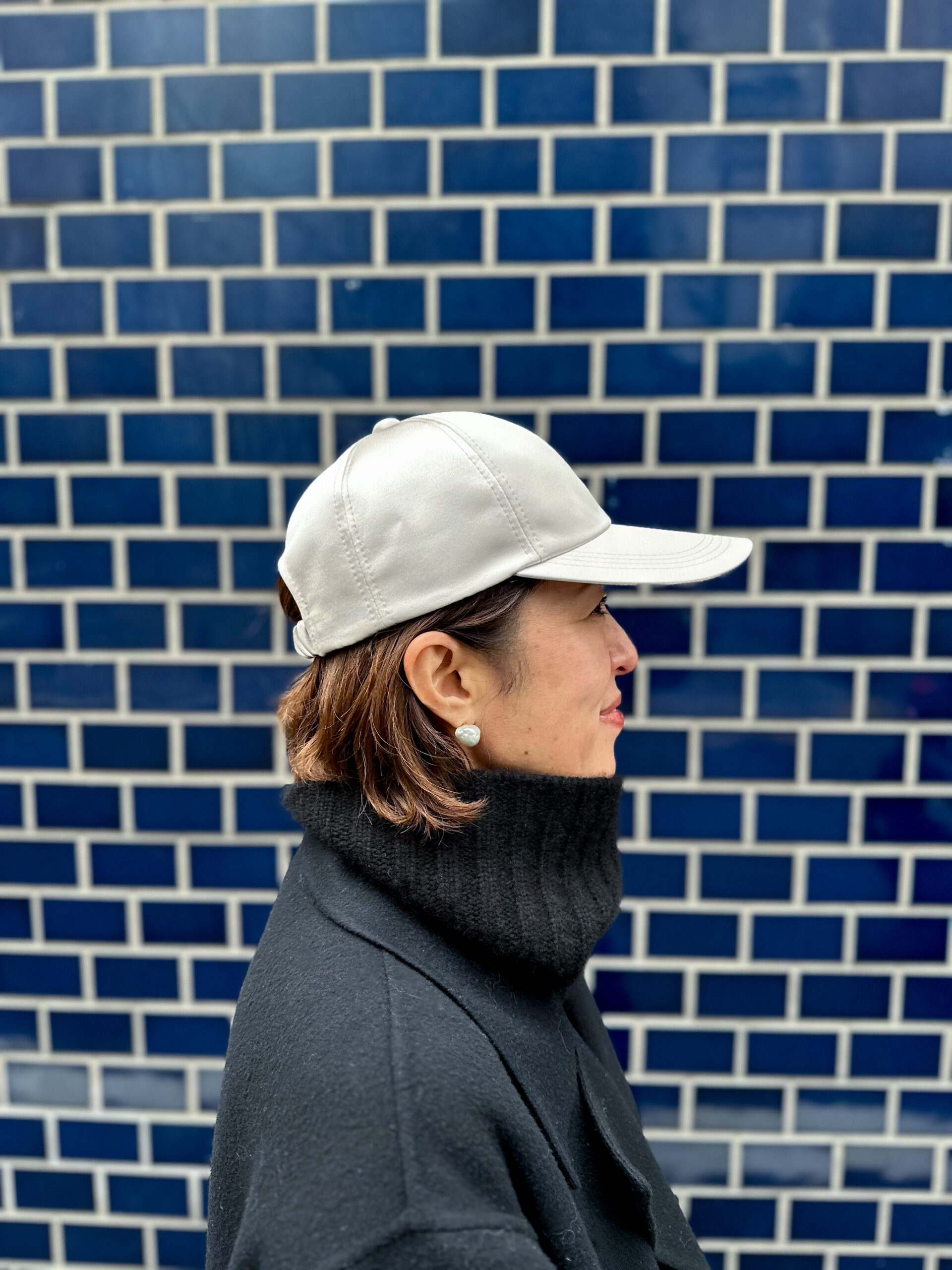 大人が女性らしくキャップを使いこなすには、素材選びの次に『形』が重要。クラウンはなるべく角のない丸みがある方がフェミニンで、さらに浅すぎないものを選ぶことで顔立ちとのバランスがぐっと取りやすくなります。そこへ少し長めのつばが組み合わさることで、全体のシルエットが綺麗に収まります。もちろん顔の形やパーツの配置によって似合う・似合わないはありますが、この絶妙なフォルムならどんな顔立ちの方にもしっくり馴染みそう。