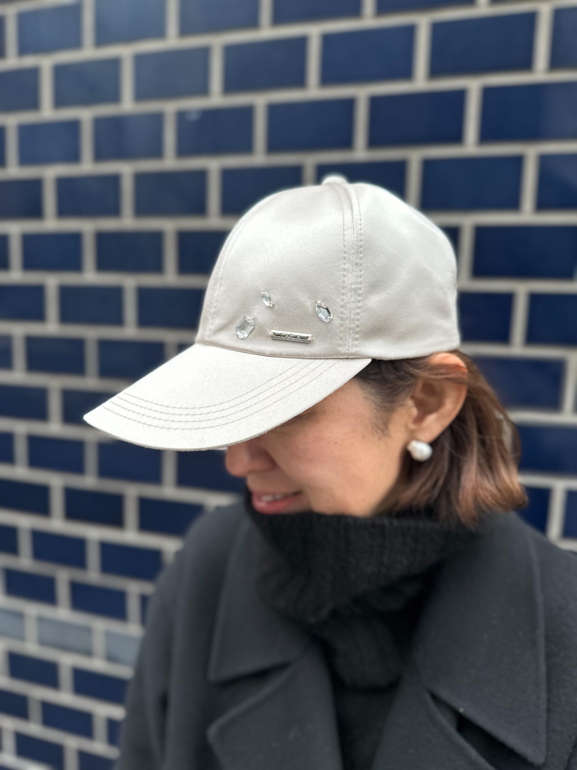「キャップって、たとえばベースボールキャップなんかだと、カジュアルになりすぎてしまう。私は好きだけれど、もう少し大人の女性が被りやすいものがあってもいいかも、と思っていたらこれを見つけました! 艶やかなサテンがとっても上品。火曜日に紹介したツイードのキャップのゴールドのパイピングもそうで、顔周りに艶や輝きが少しあるだけで、表情は驚くほどパッと華やぐもの。さらに、フロントに添えられたビジューとメタルチャームが、まるでジュエリーのような気品を添えてくれます。