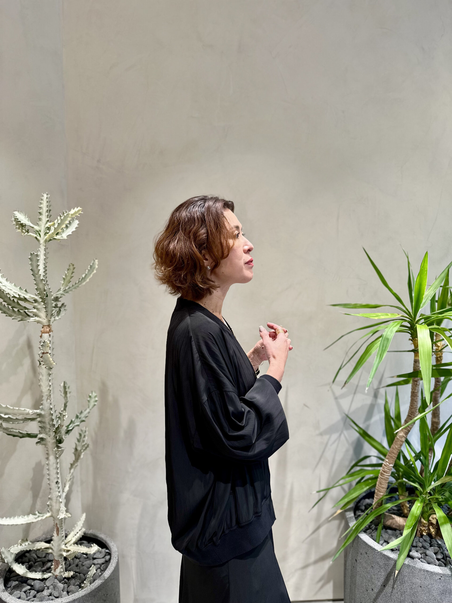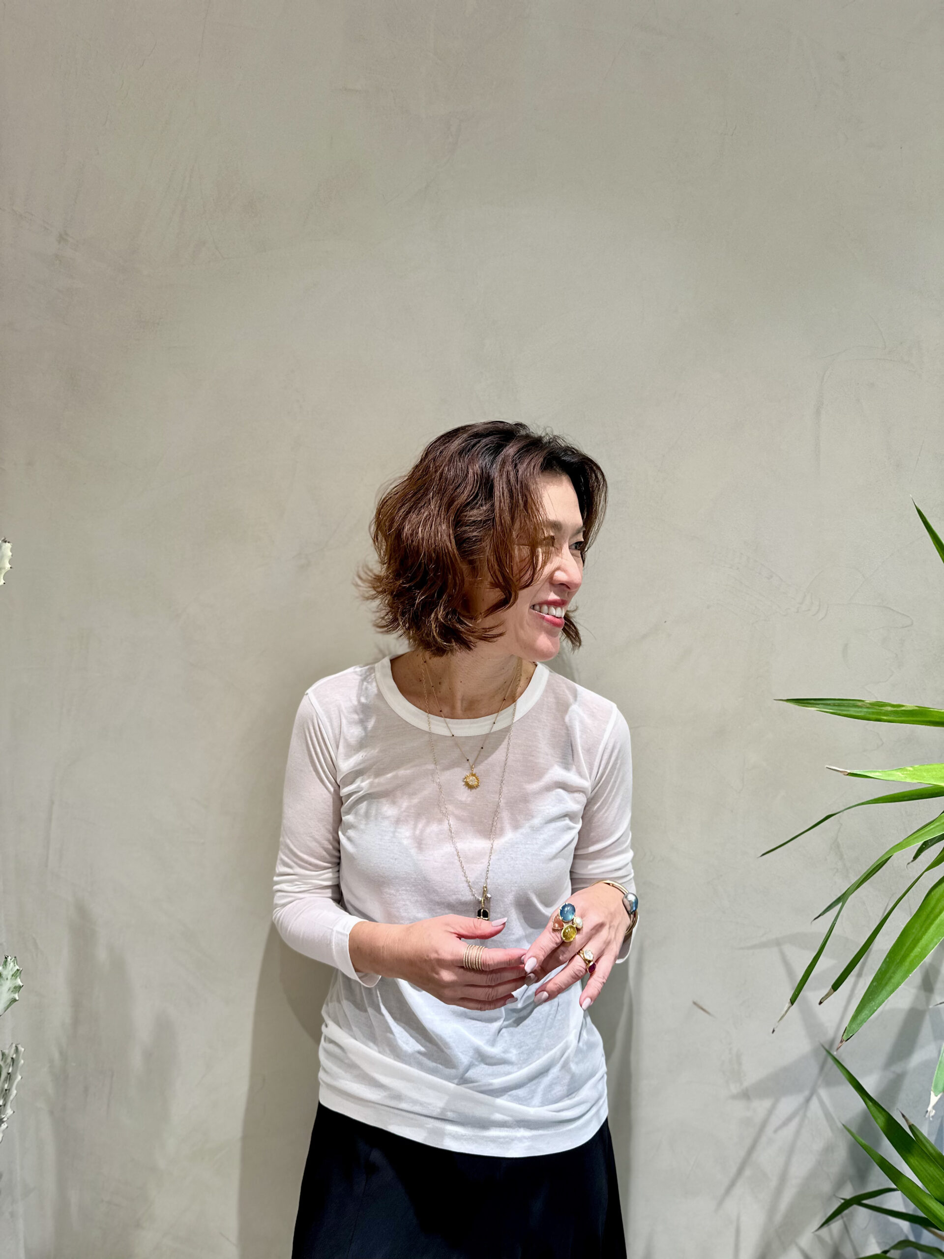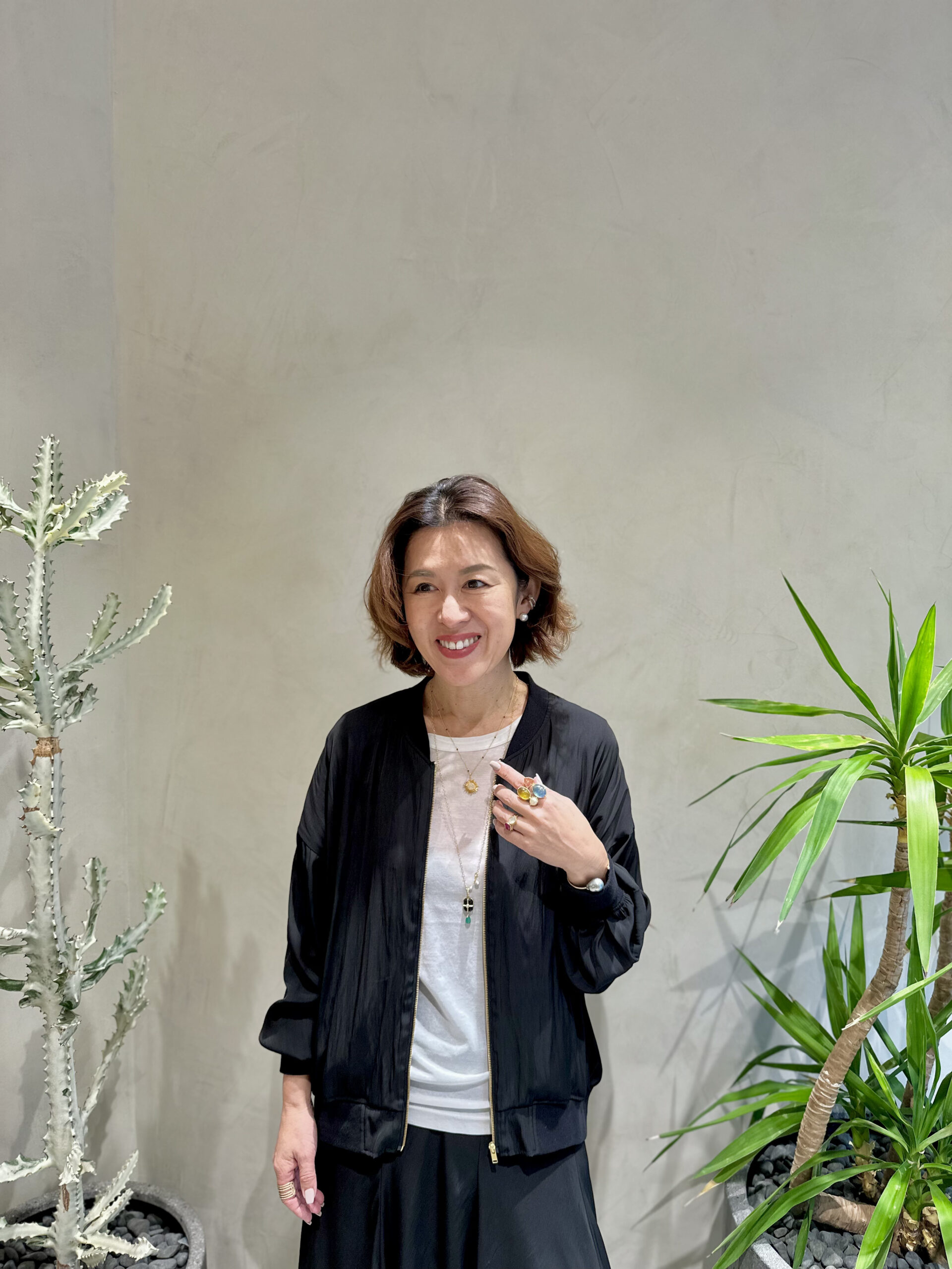 スタート以来、インスタライブなどを通じて、ブランドの大ファンと公言する大草。寒さが和らいできたこともあり、今すぐ着られる春アイテムを求めて、conte 青山店にお邪魔してきました!