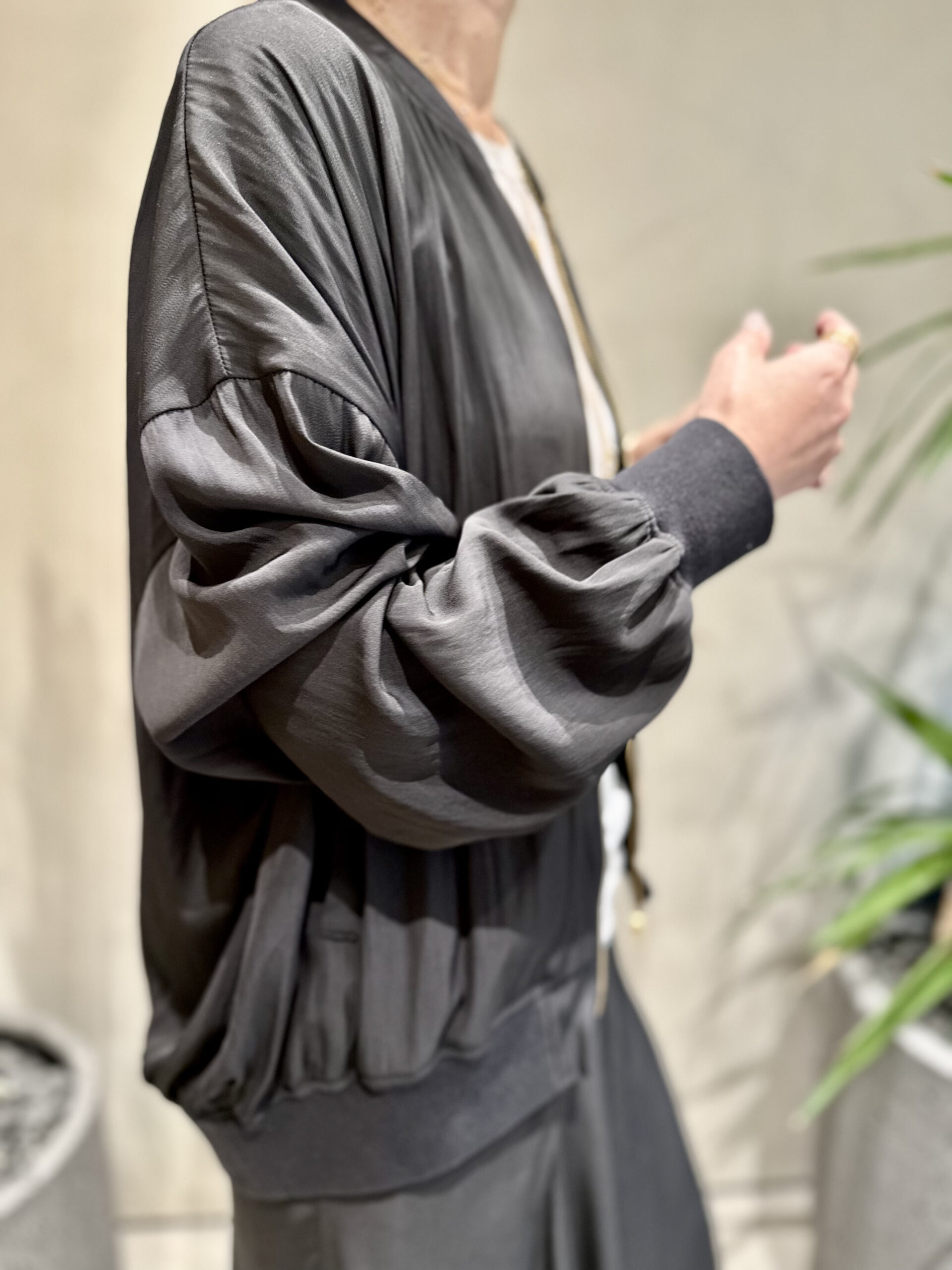 「このブルゾン、 買いました♡ 落ち感のある艶やかな素材と、ふんわりした袖、そして少し落ちたショルダーライン……一見スポーティなブルゾンかと思いきや、実はとっても女っぽい! 身幅をゆったり取りつつ、お尻が隠れる安心感のある丈に仕上げることで、抜け感のある印象に。さらに、体型のカバーもしてくれます。