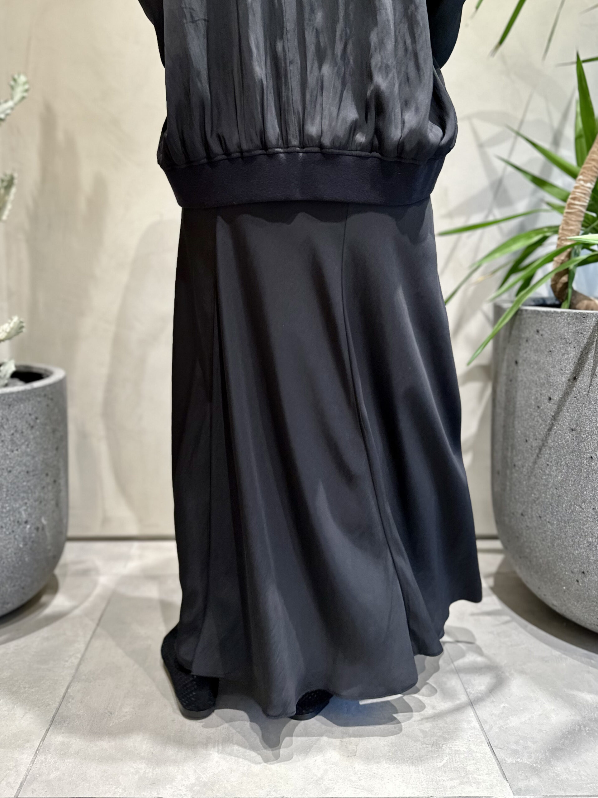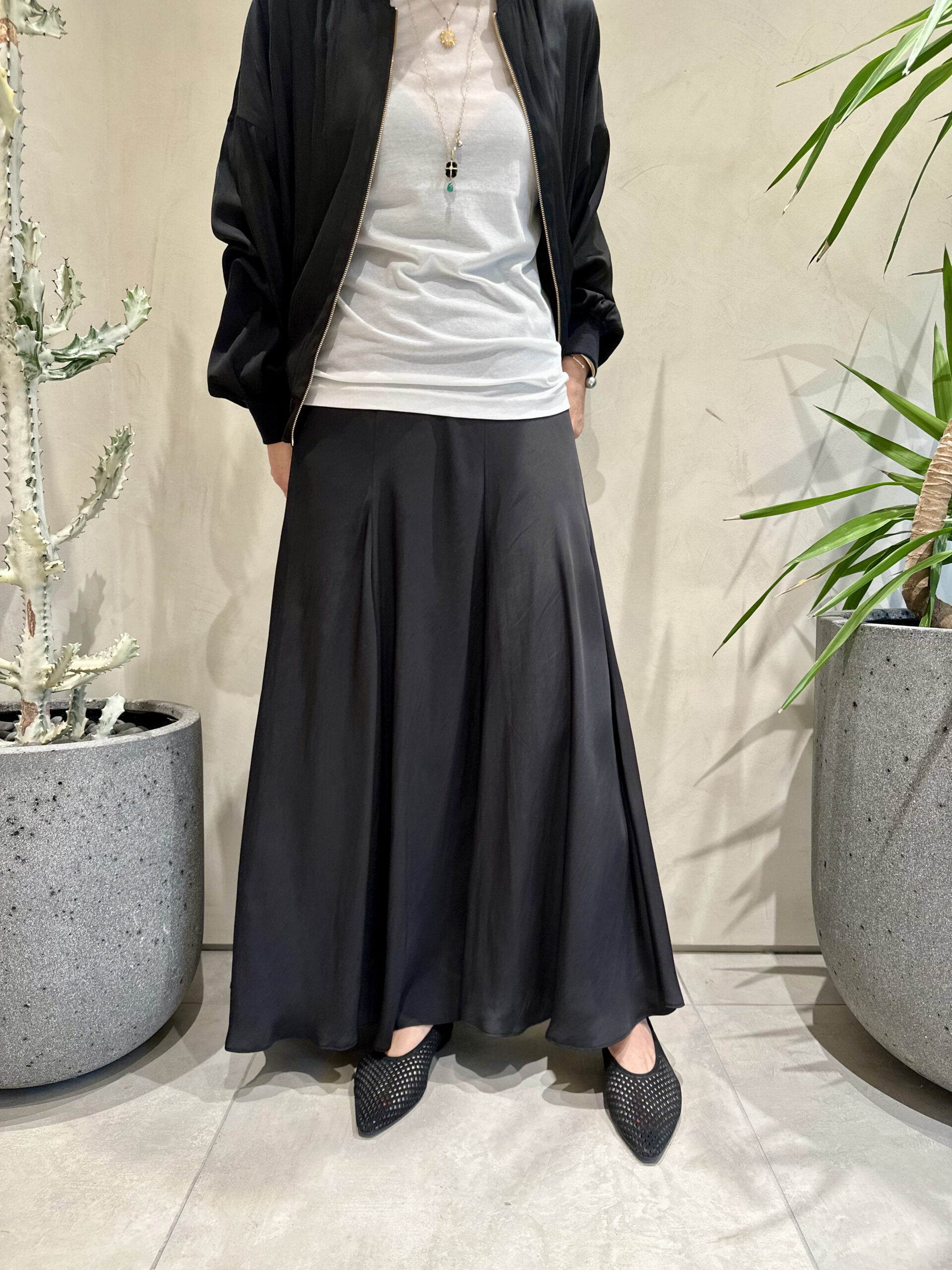 しかも、同素材のスカートもあって、セットアップで着られる! この形のブルゾンとスカートを、セットアップにしてしまうバランス感、さすがです♡ シンプルだけどドラマティック、エレガントだけどリラクシー、そんな相反するテイストが融合してしまうなんて、セットで着るしかない(笑)」(大草)