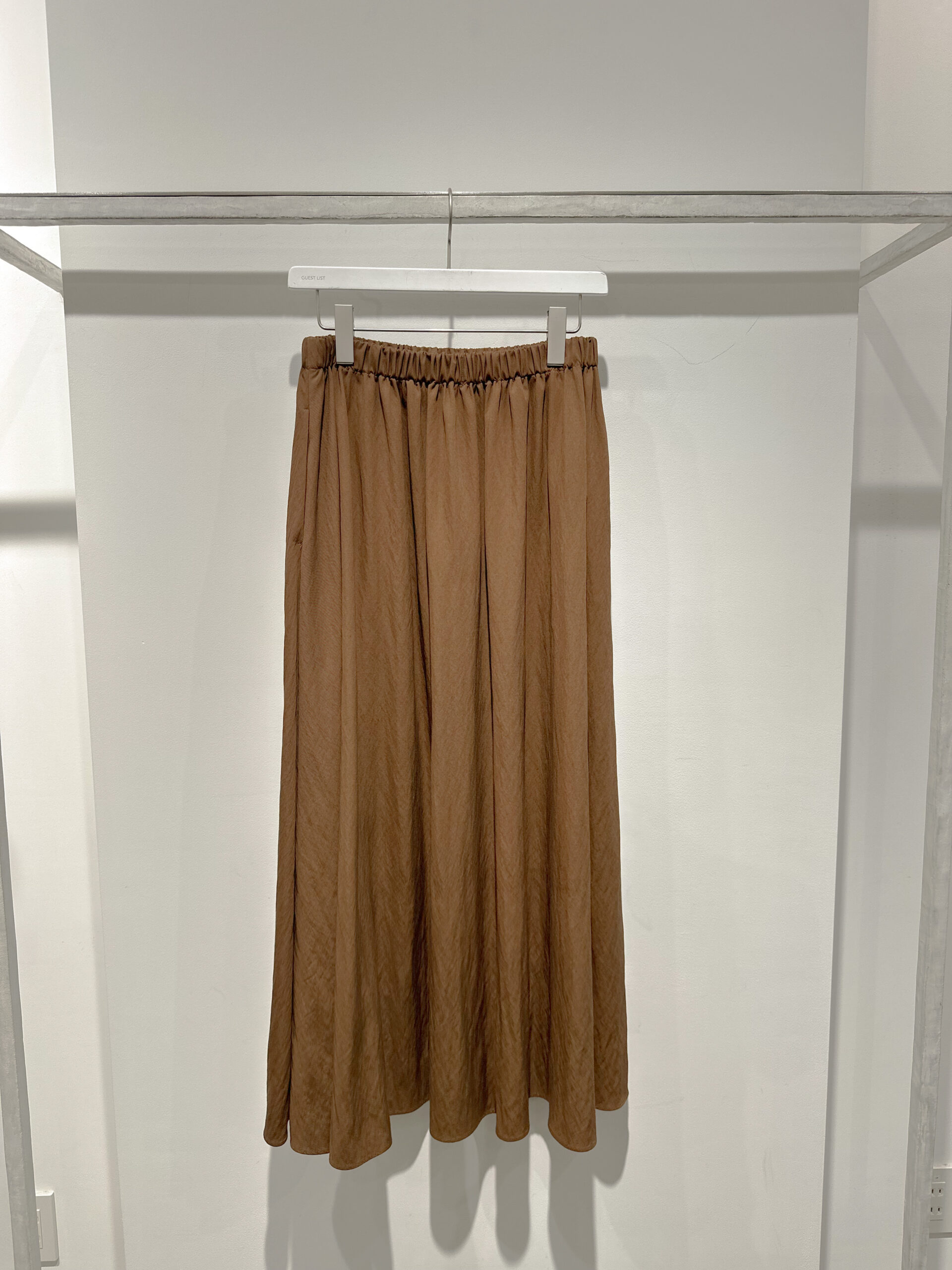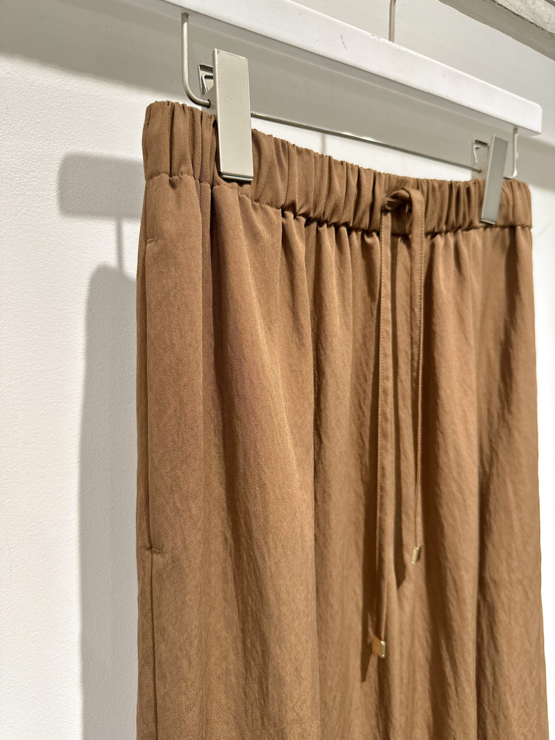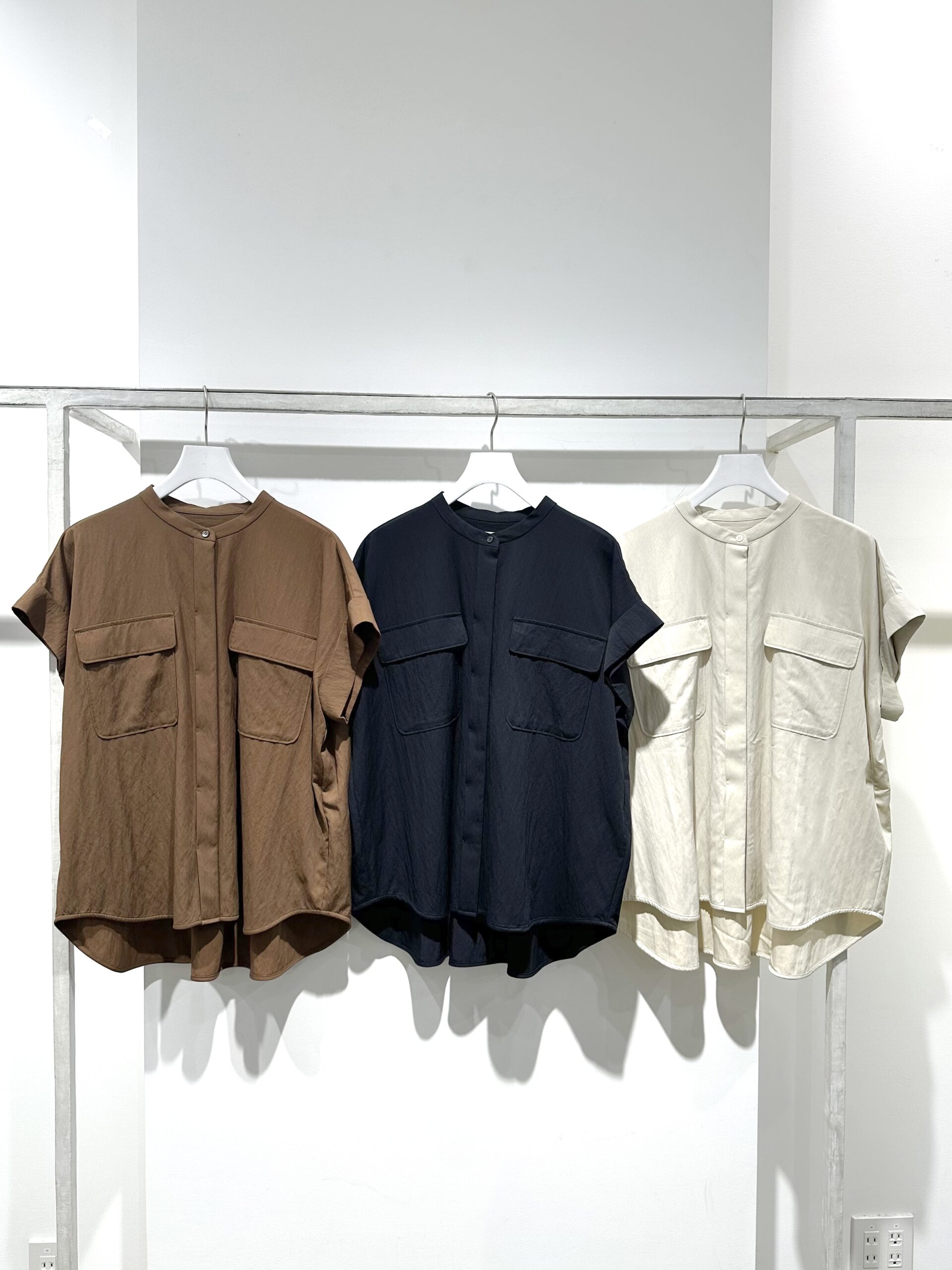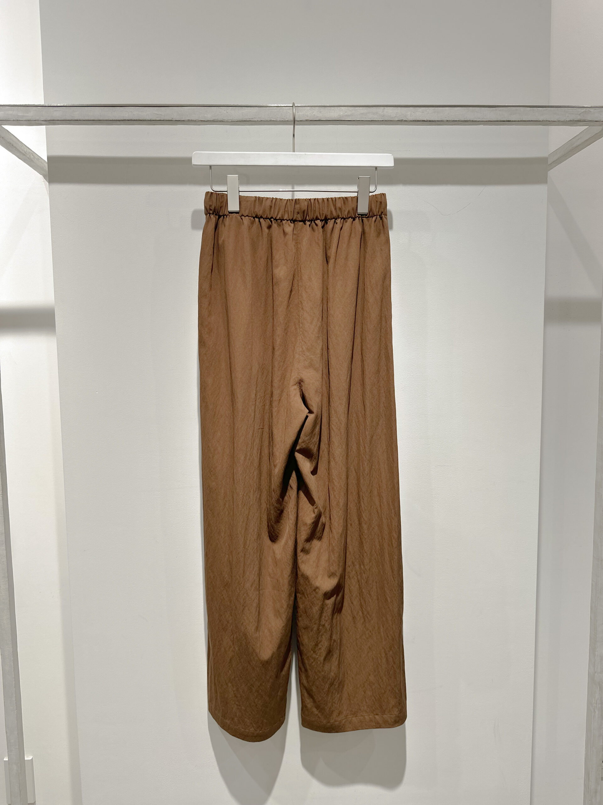 「光沢と落ち感が上品なツイル素材。同素材でブラウス、パンツ、スカートの、3アイテム展開なので、単品使いはもちろんお好みのセットアップにも。