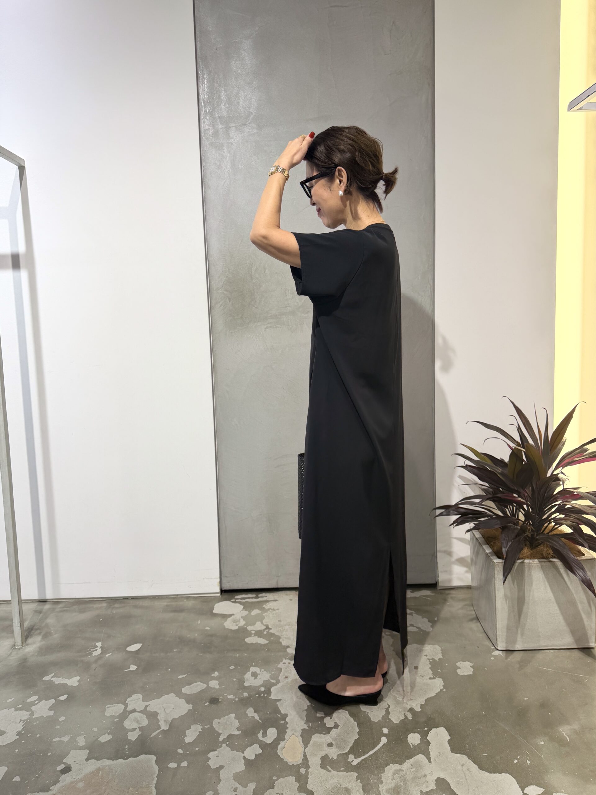「すっごいシンプルなのに、とってもキレイ! このカットソーワンピース、すっごくいい♡ ポリエステル100%さらりとしたドライタッチ素材で肌離れも良く、ラフなのに、ちゃんと綺麗見えする、計算し尽くされた一枚。あえてTシャツのようなリブを配したコンパクトなクルーネックは、ゆるやかなボディラインにモダンなアクセントを添えてくれます。しっかり深く入ったバックスリットは、足捌きの良さという実用性だけでなく、大人の女性に必要なエレガンスも添えてくれます♡