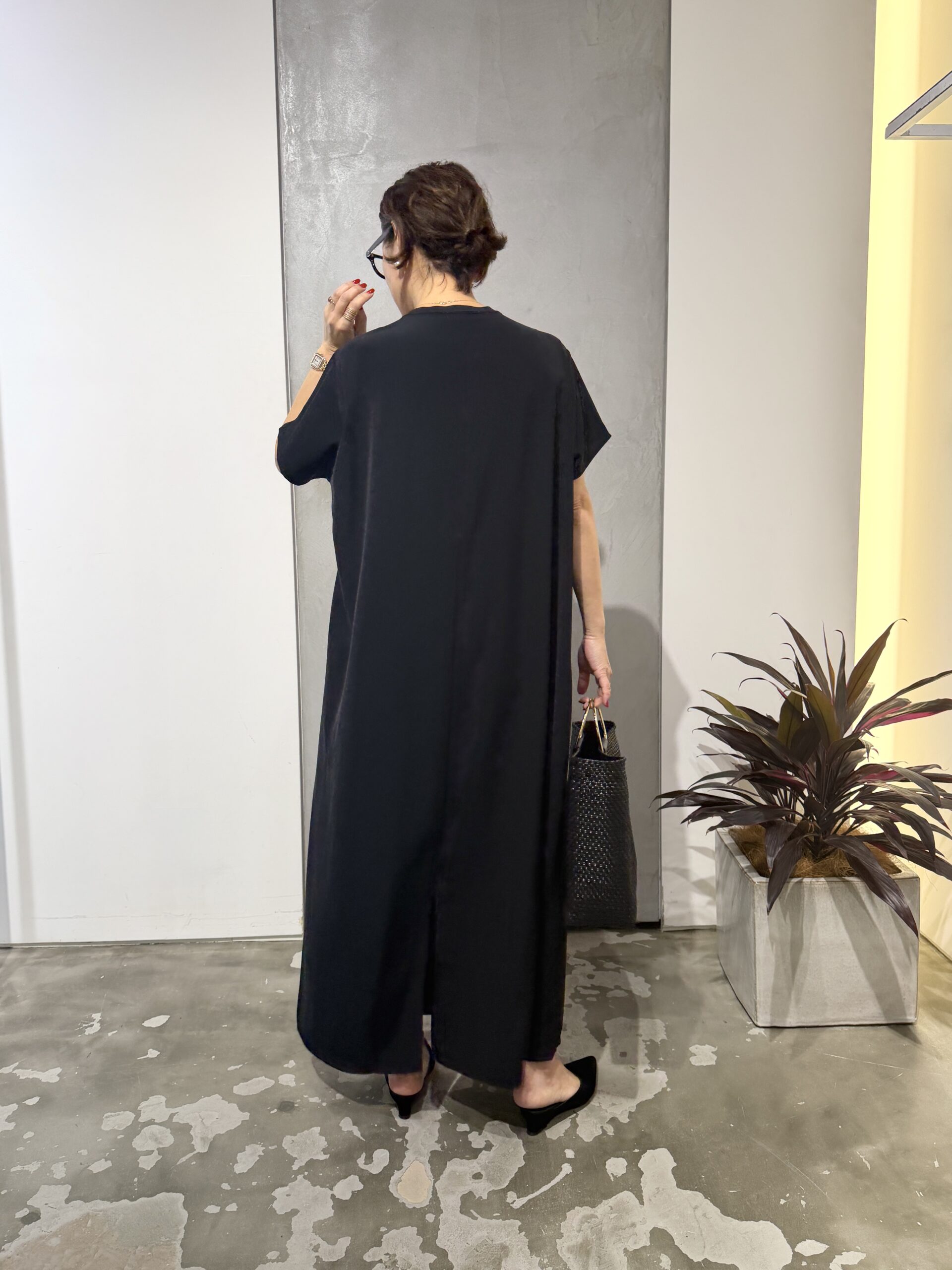 この艶やかな質感なら、デイリーなタウンユースはもちろん、ディナーの席だって臆せず楽しめそう。タウンでもリゾートでも馴染んでくれる、万能ワンピース」(大草)