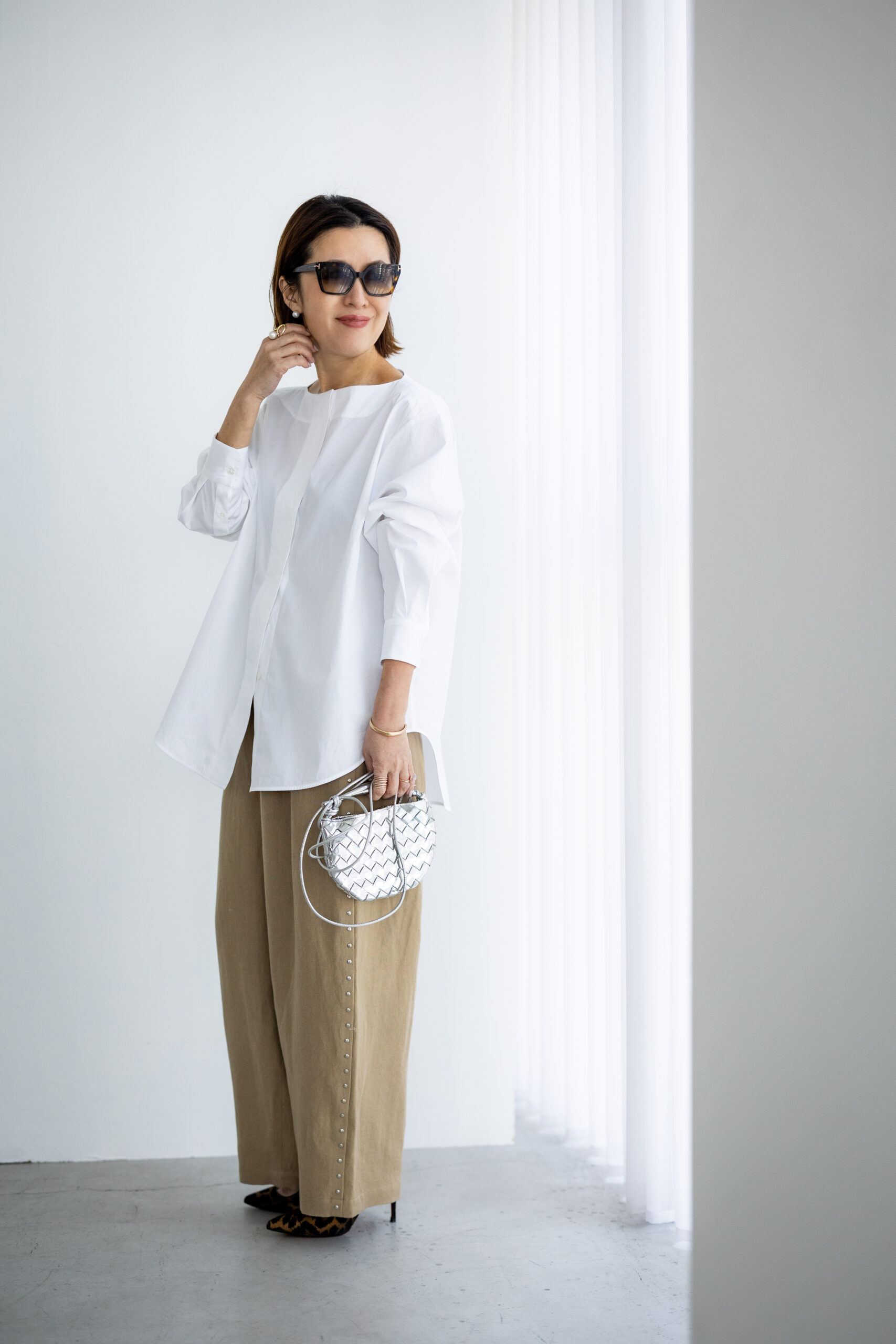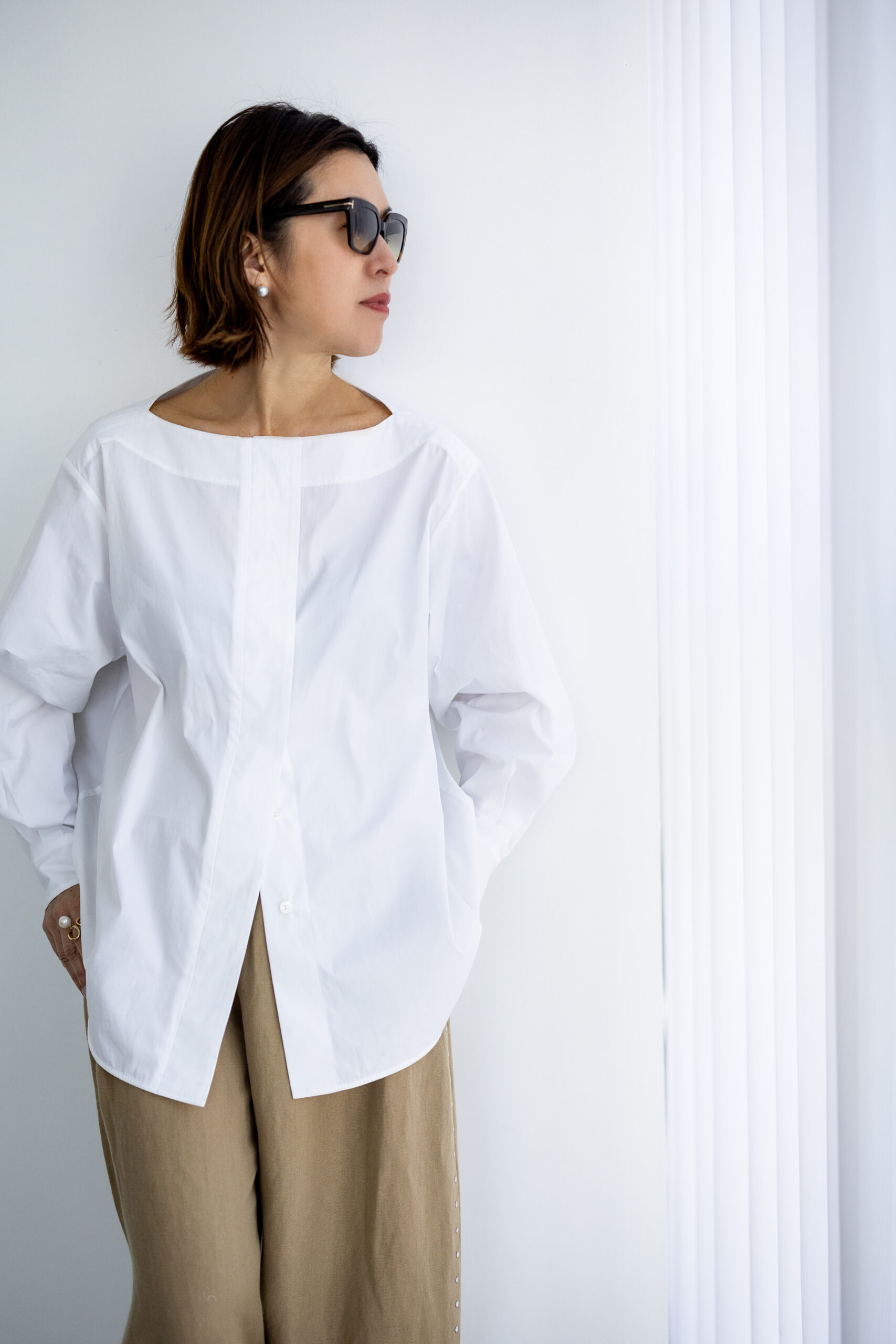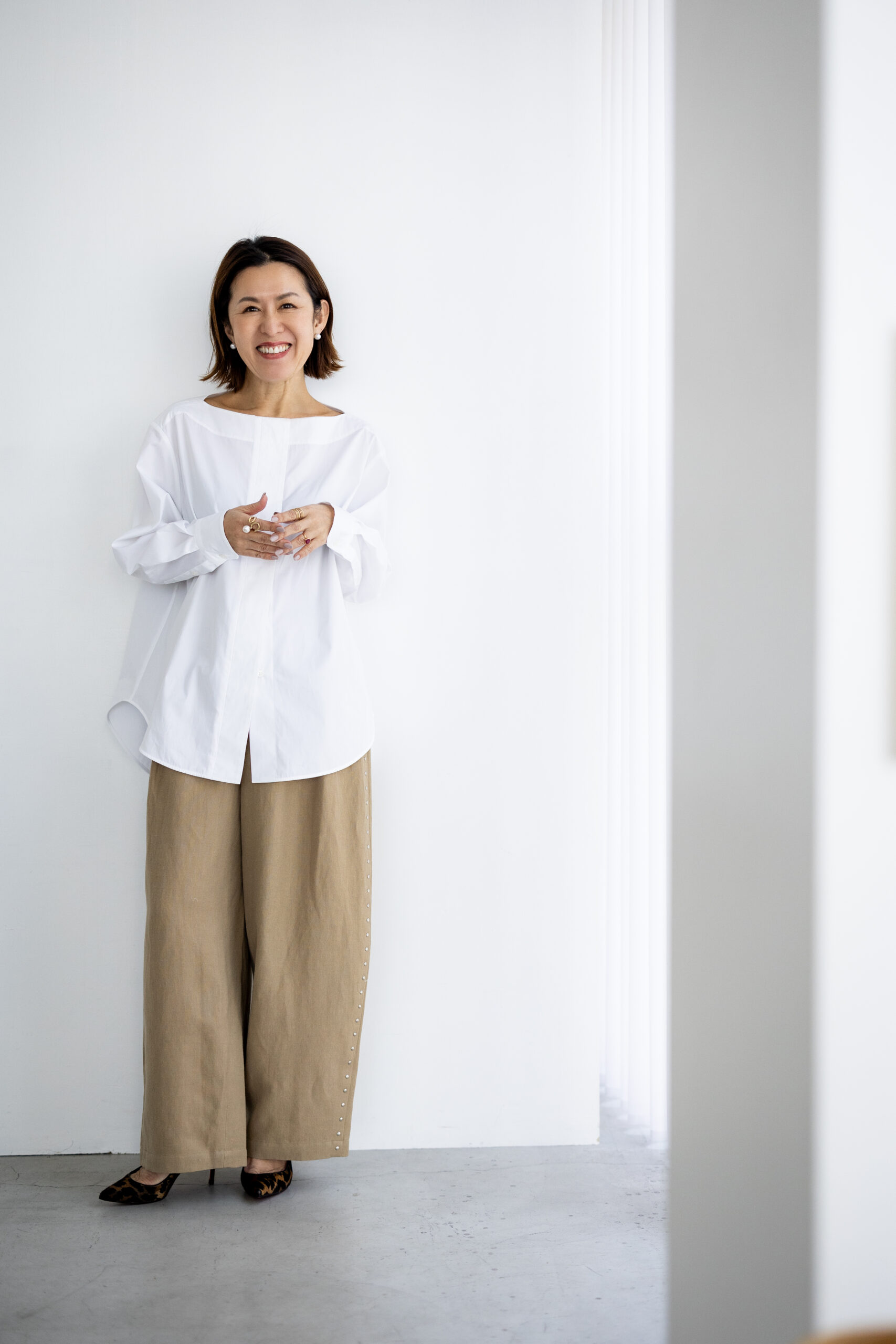 シンプルを愛する祐宗さんが行き着いたのは、ボタンすら削ぎ落とした、潔い比翼仕立てのブラウス。ブロードではなく、あえて硬さのある生地を採用することで、その構築的なシルエットをより美しく、立体的に際立たせています。そんなハリのある素材感だからこそ、首元はボートネックで。肌をのぞかせることで、心地よい抜け感を生み出しています。