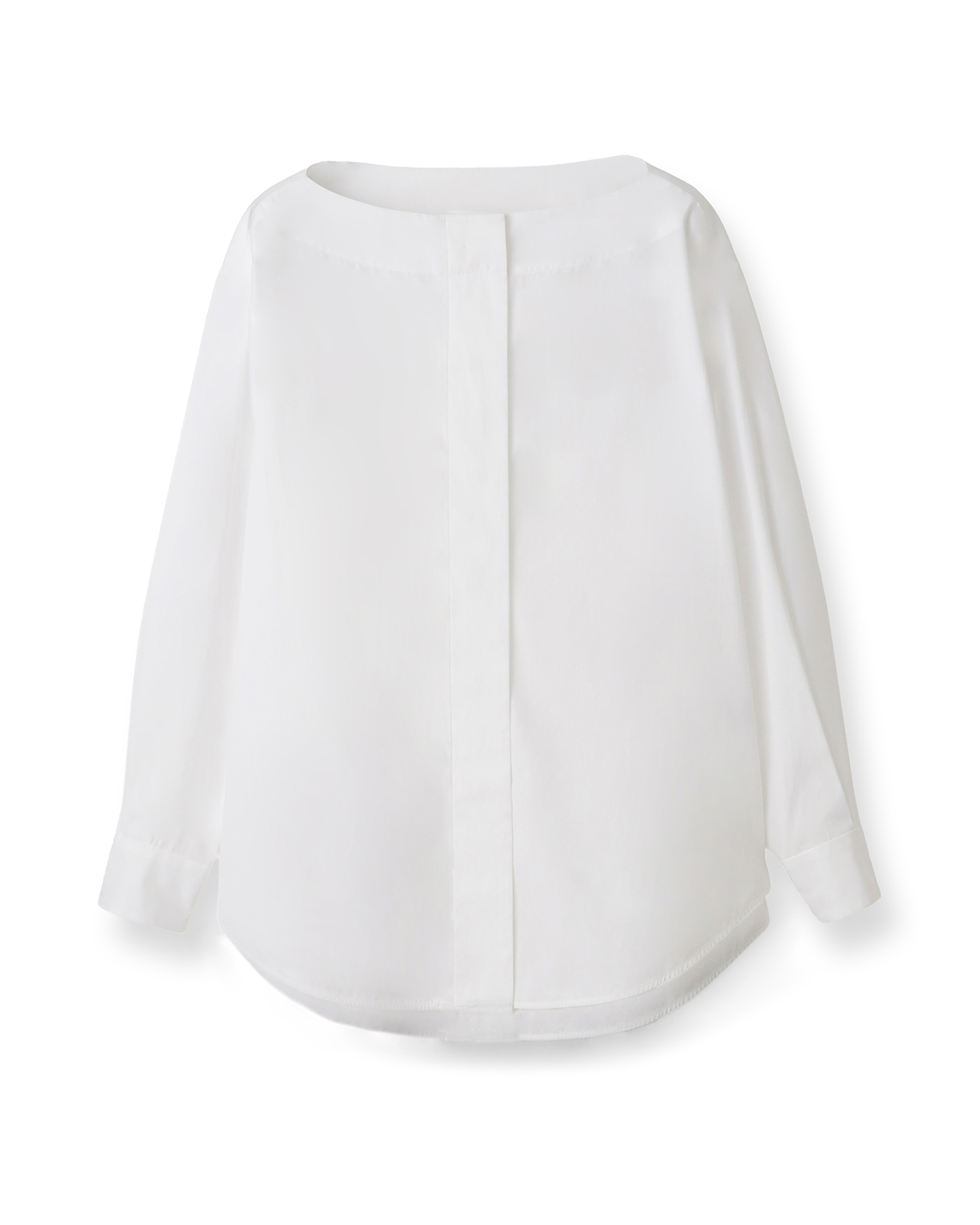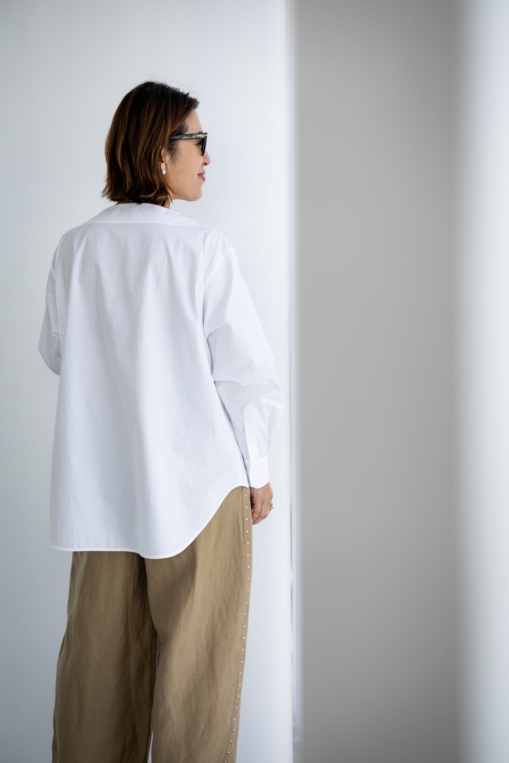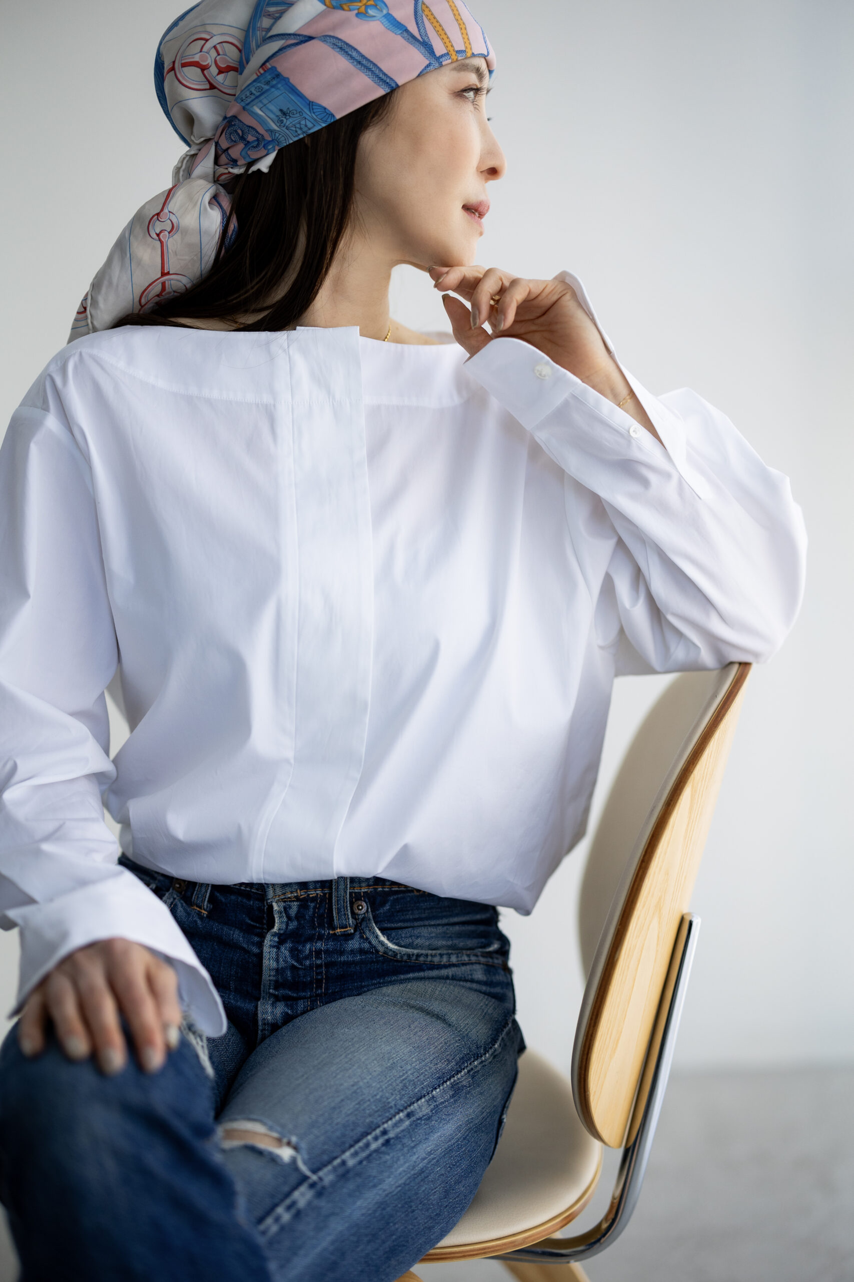 シンプルを愛する祐宗さんが行き着いたのは、ボタンすら削ぎ落とした、潔い比翼仕立てのブラウス。ブロードではなく、あえて硬さのある生地を採用することで、その構築的なシルエットをより美しく、立体的に際立たせています。そんなハリのある素材感だからこそ、首元はボートネックで。肌をのぞかせることで、心地よい抜け感を生み出しています。