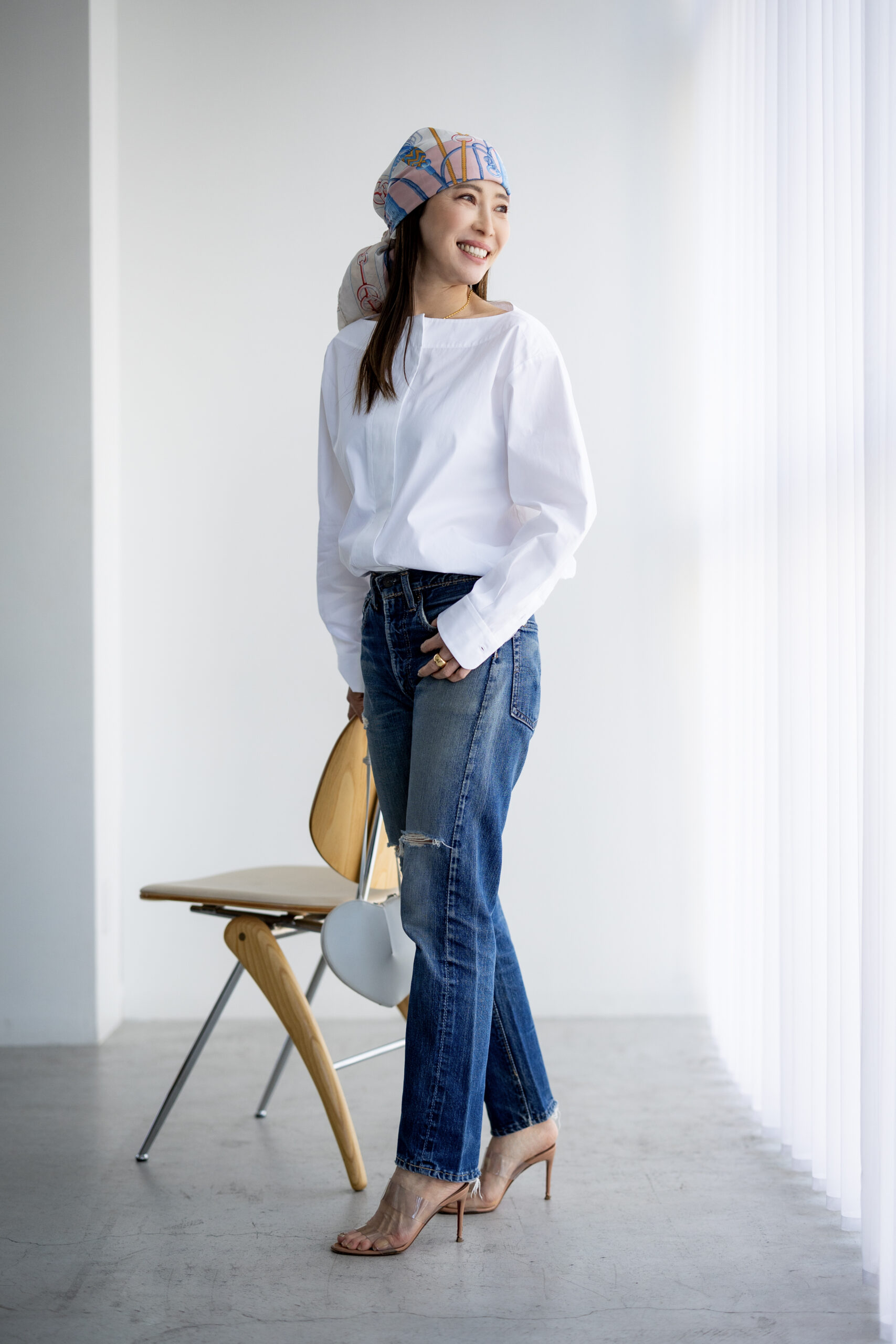 そして、遊び心は大胆に頭に纏ったスカーフで。華やかでチャーミングなアクセントが、シンプルな装いに奥行きと自分らしい個性を与えてくれます。