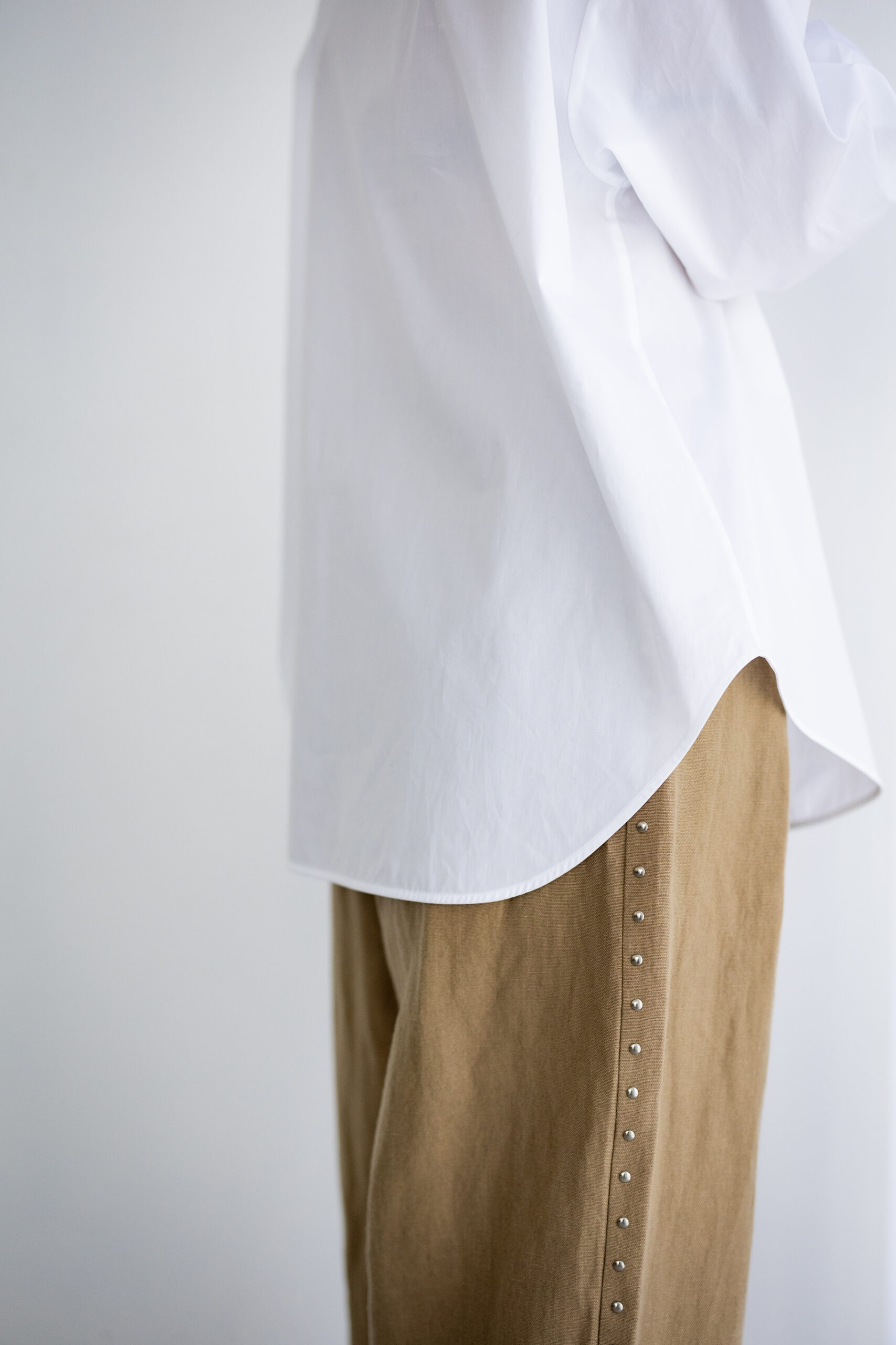 ボトムスは、ドライな質感が心地よいバレルパンツ。上下ともにゆとりのあるフォルムですが、決してルーズに見えないのは、素材に確かなハリがあるから。サイドに並んだスタッズが、スタイリングに程よい緊張感と辛口なアクセントを添えてくれます。ブラウスとパンツ、たった2つのアイテムを重ねるだけの「ワン・ツー・コーディネート」。こんなに簡単なのに、とびきりオシャレに見せてくれる、大人のための究極のブラウスです。