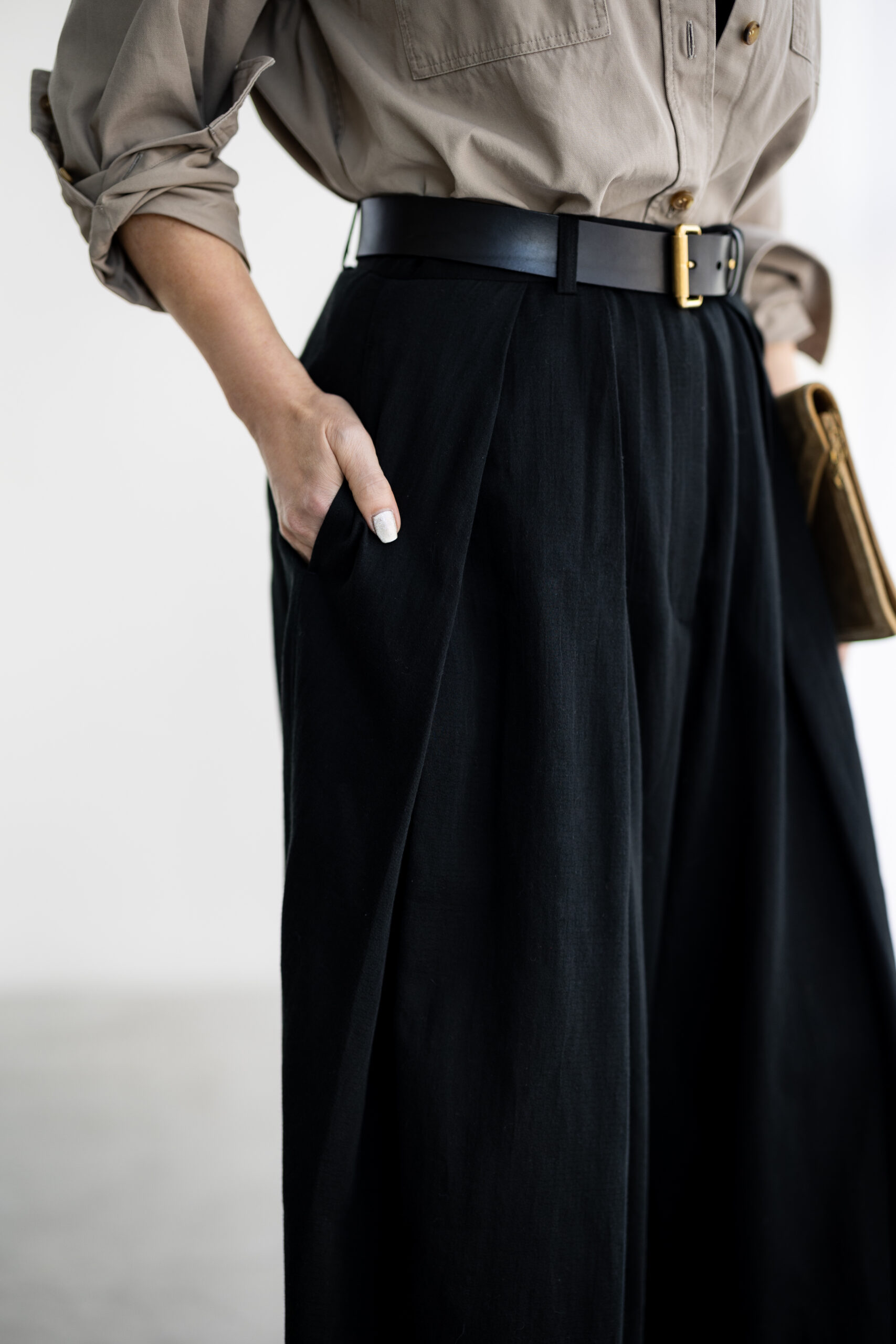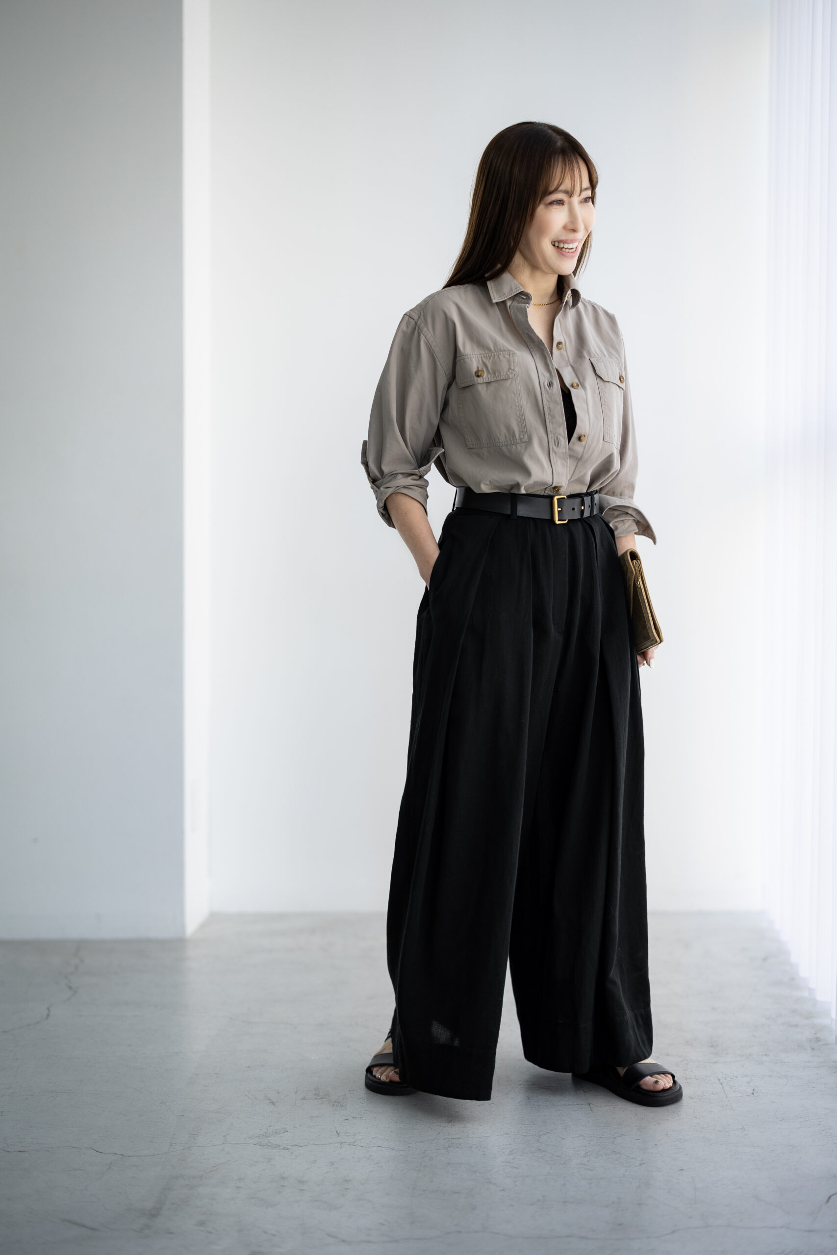 スタイリングは、ビッグシルエットのシャツを合わせてメンズライクに。フロントのボタンを開け、袖を無造作に捲り上げることで、大人のラフな余裕を演出。そこへ、ゴールドのバックルが光る「硬さ」のあるベルトを一点投入。すると、シフォンが持つ柔らかな表情がガラリと変化。シャツのハリ感と相まって、一気にクールで都会的な表情へと引き締まります。素材のコントラストを楽しむ、洗練された大人のパンツルックです。