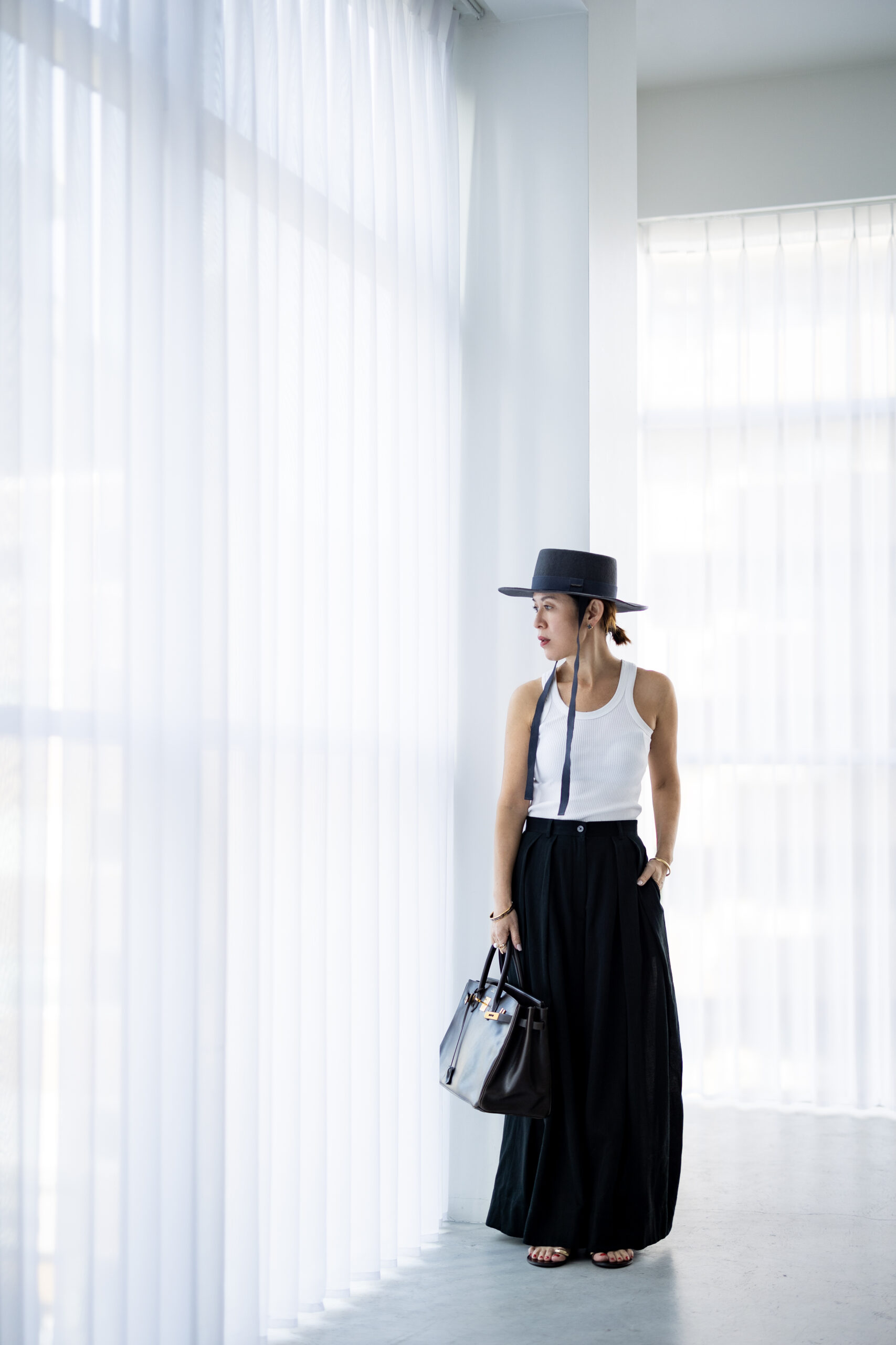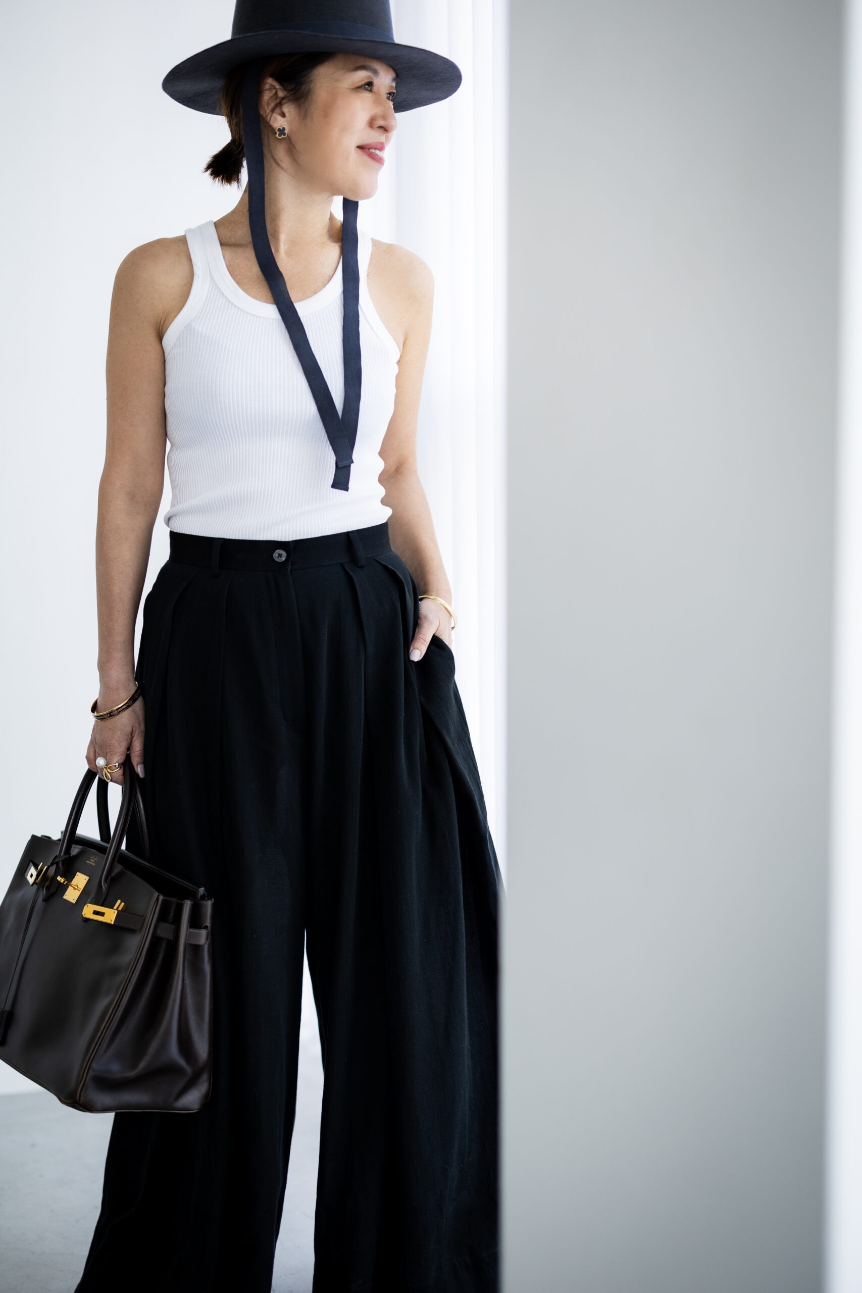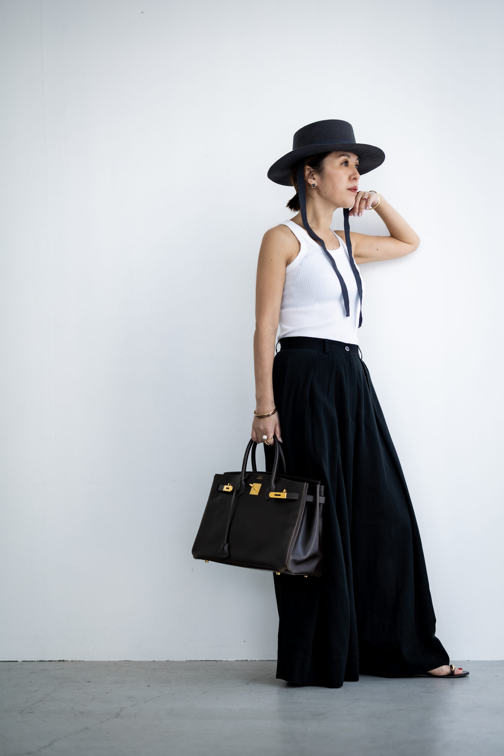 スタイリングは、シャープなハットと上質なレザーバッグを。タンクトップを合わせた軽やかな装いに、程よい重厚感と奥行きをプラスすることで、洗練されたハンサムな着こなしへ。