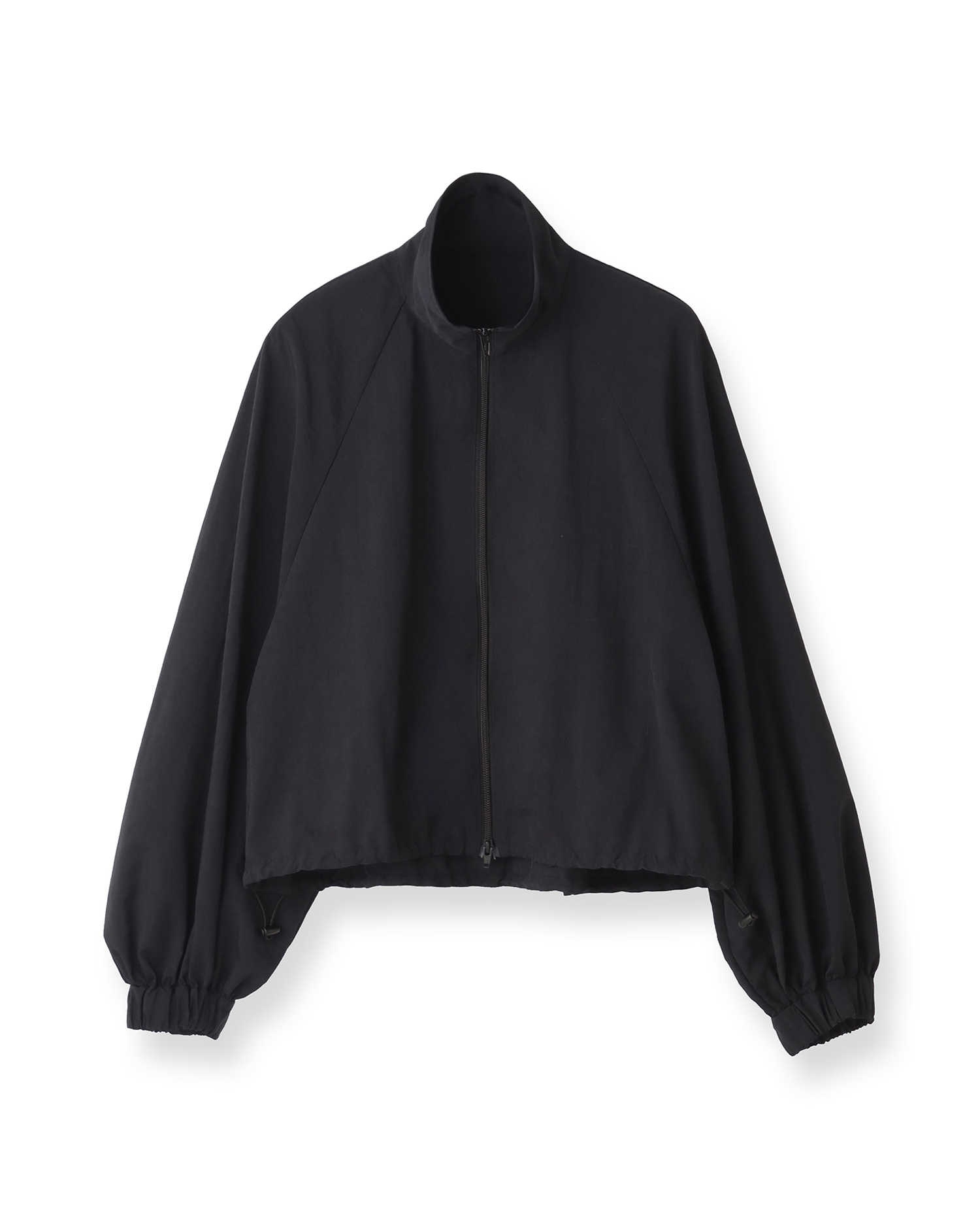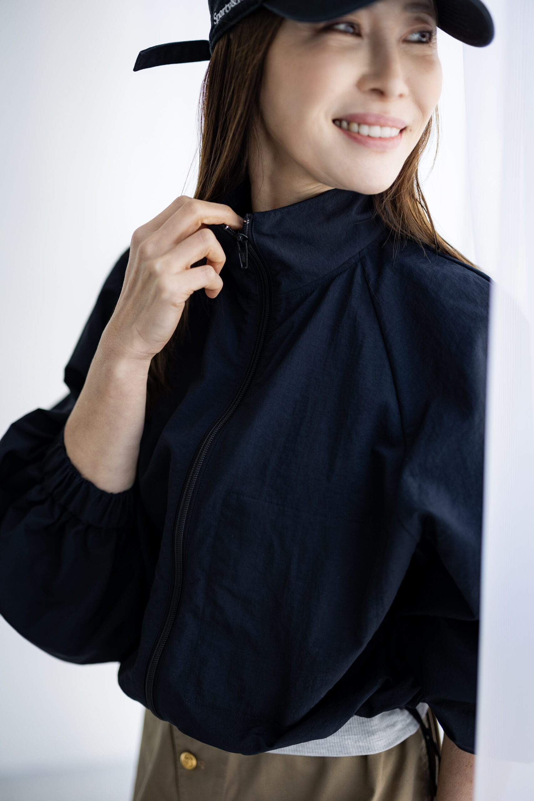 裾のドローストリングを絞れば、フォルムや丈感のアレンジも自在。合わせるボトムスを選ばず、その日のスタイリングに最適なバランスを即座に作れる着回し力の高さも魅力です。スポーティな素材でありながら、どこかモードな表情が漂うのは、端正なスタンドカラーと、ドラマチックな袖のボリュームがあるから。