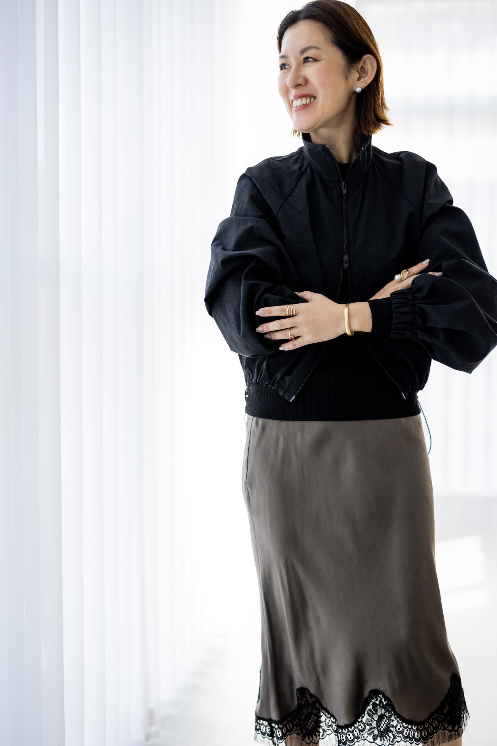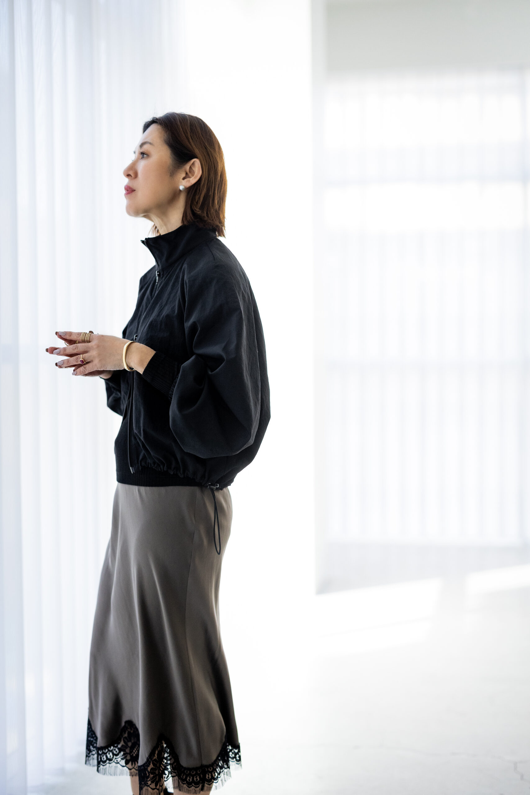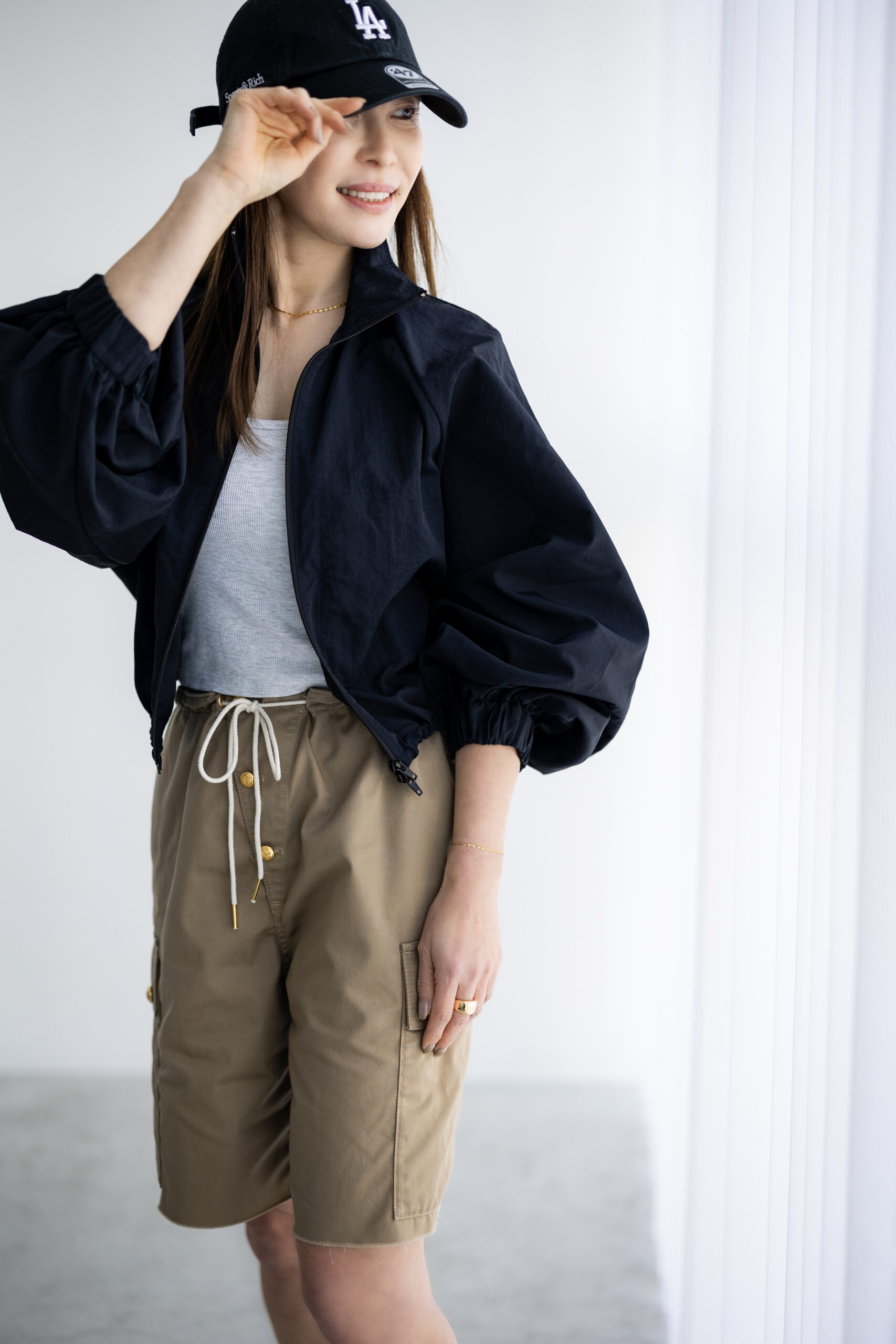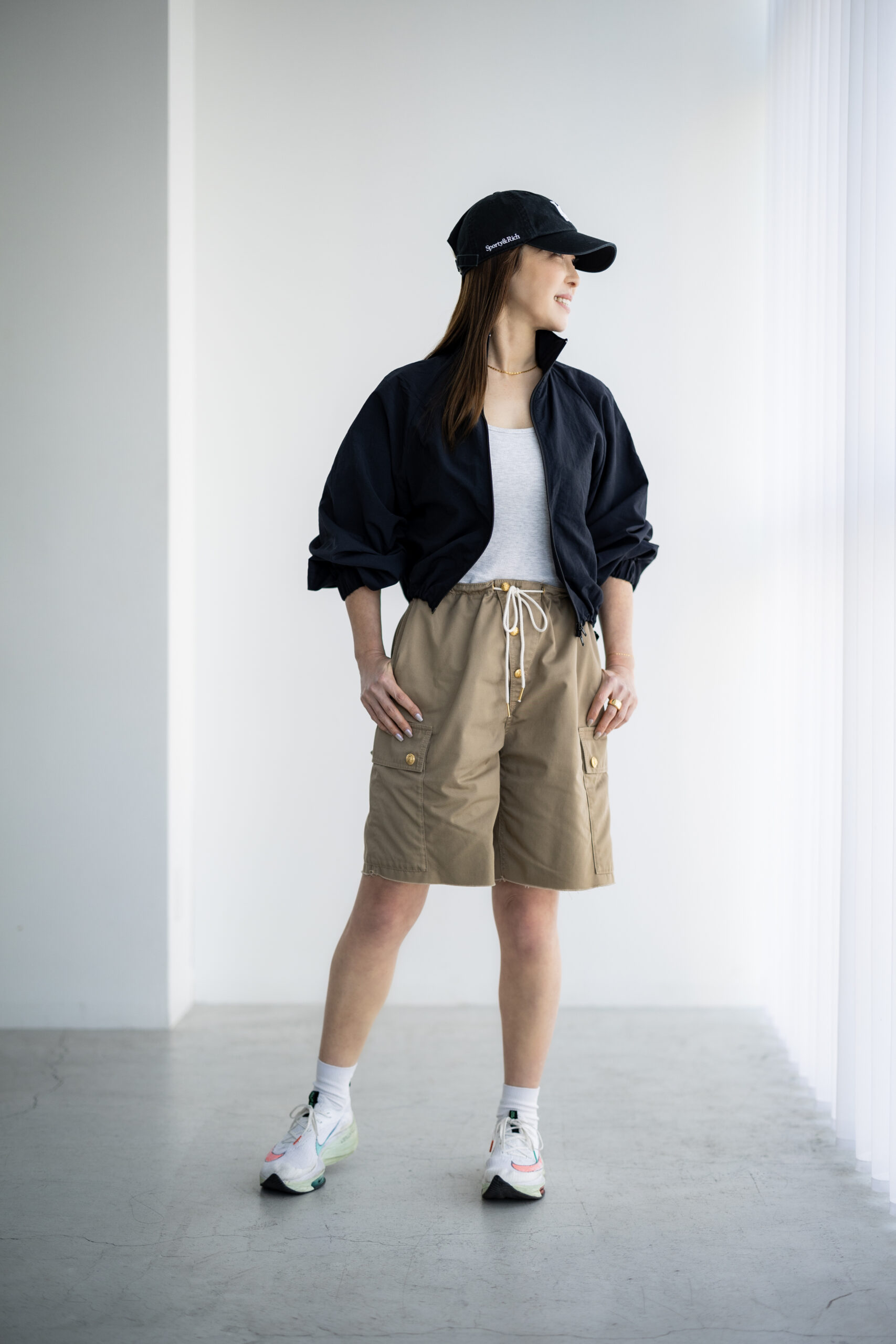 祐宗さんが提案するスポーツスタイルは、キャップとスニーカーを合わせた、とことんスポーティな装い。それでいて、決してカジュアルに全振りしない、大人の品格が漂います。その秘密は、やはりこのブルゾンにあります。スポーツブランドのロゴを主張するのではなく、細部に「女っぽさ」を宿したデザインだからこそ、溌剌としたショートパンツスタイルも、どこかフェミニンな表情に。