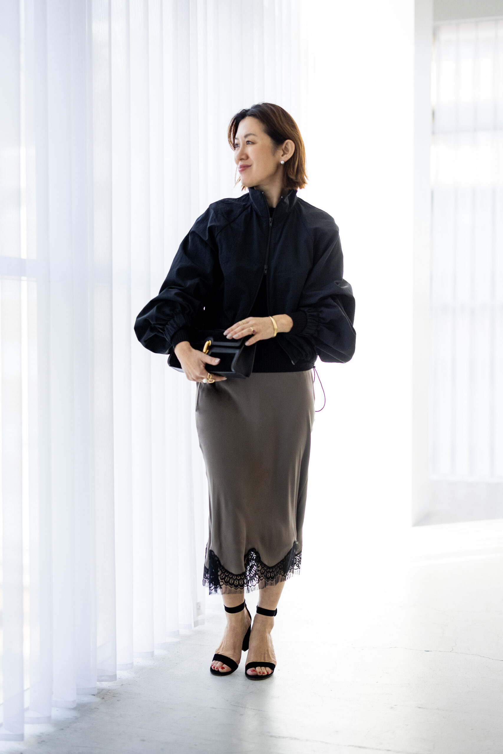 サテンとレースが織りなすレディなスカートに、華奢なサンダル、そしてエレガントなクラッチバッグ。本来ならテーラードジャケットを合わせたくなるような「女っぷりのいい」コーディネートに、あえてこのナイロンブルゾンを投入。大人のスポーツミックスは、これくらい上品なアイテムをベースに、潔く、そしてラグジュアリーに纏めるのがちょうどいい。