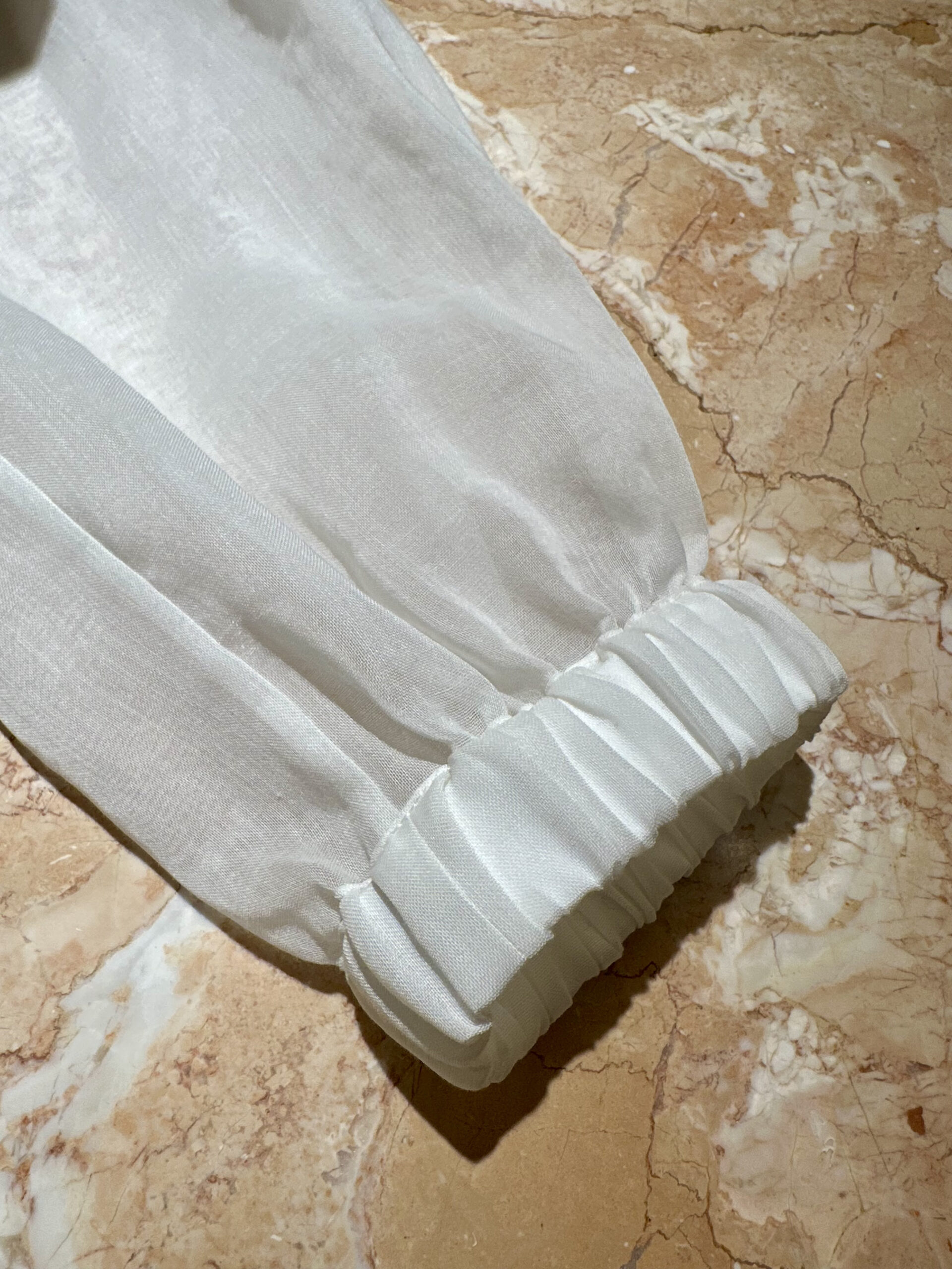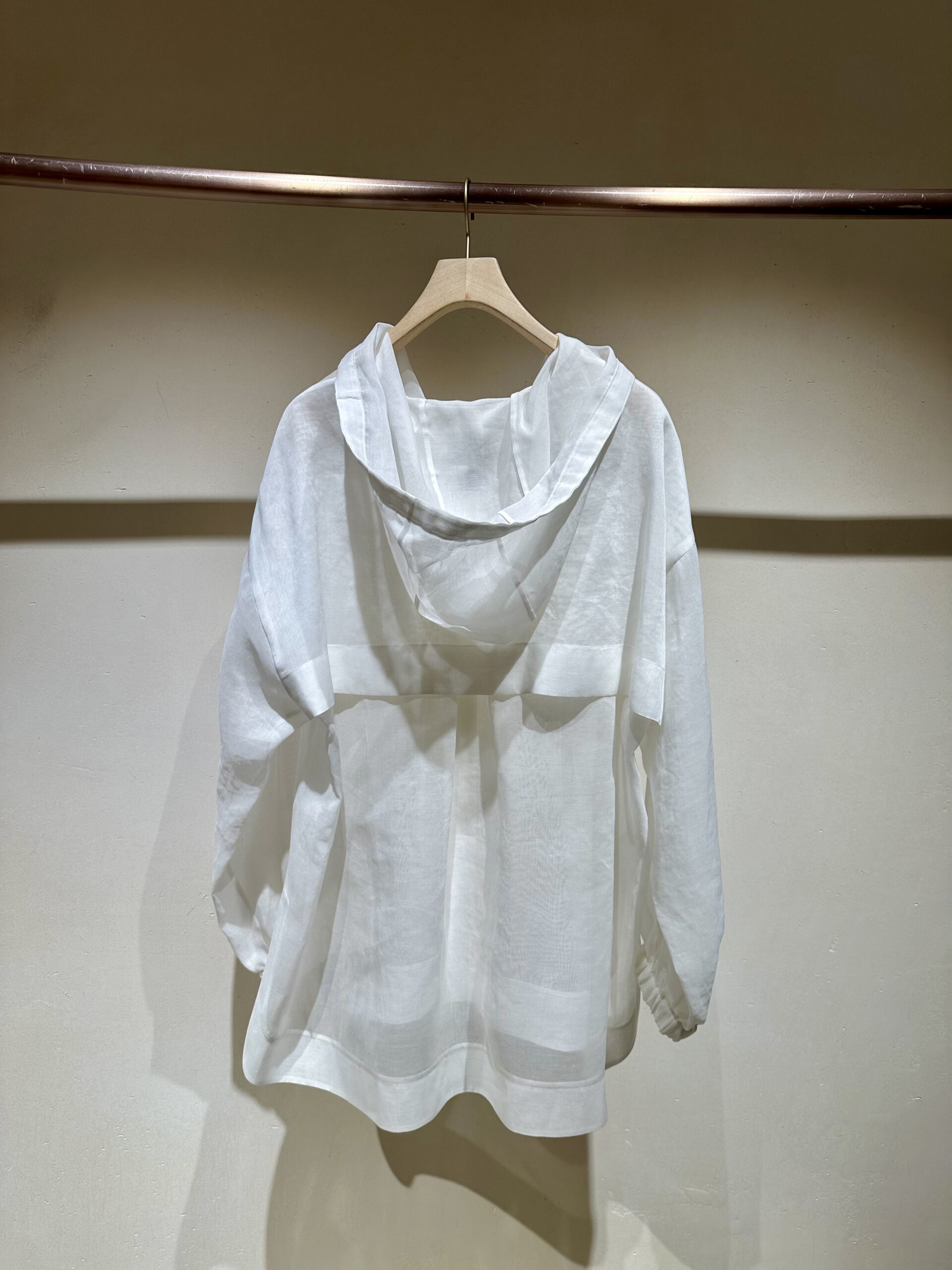 「カジュアルなブルゾンを、まさかこの素材で……!?と、心服した逸品。とにかく、そのバランスが絶妙♡ シースルーのシャツや、スポーティなフーディーは世の中に溢れているけれど、ここまで上品に、そしてラグジュアリーに昇華されたものは稀。ハリとコシを兼ね備えたオーガンジー素材は、驚くほど薄いのに身体のラインを拾わず、ドラマティックな立体感を生み出してくれます。3年前から不動の人気を誇っているというのも、深く納得。