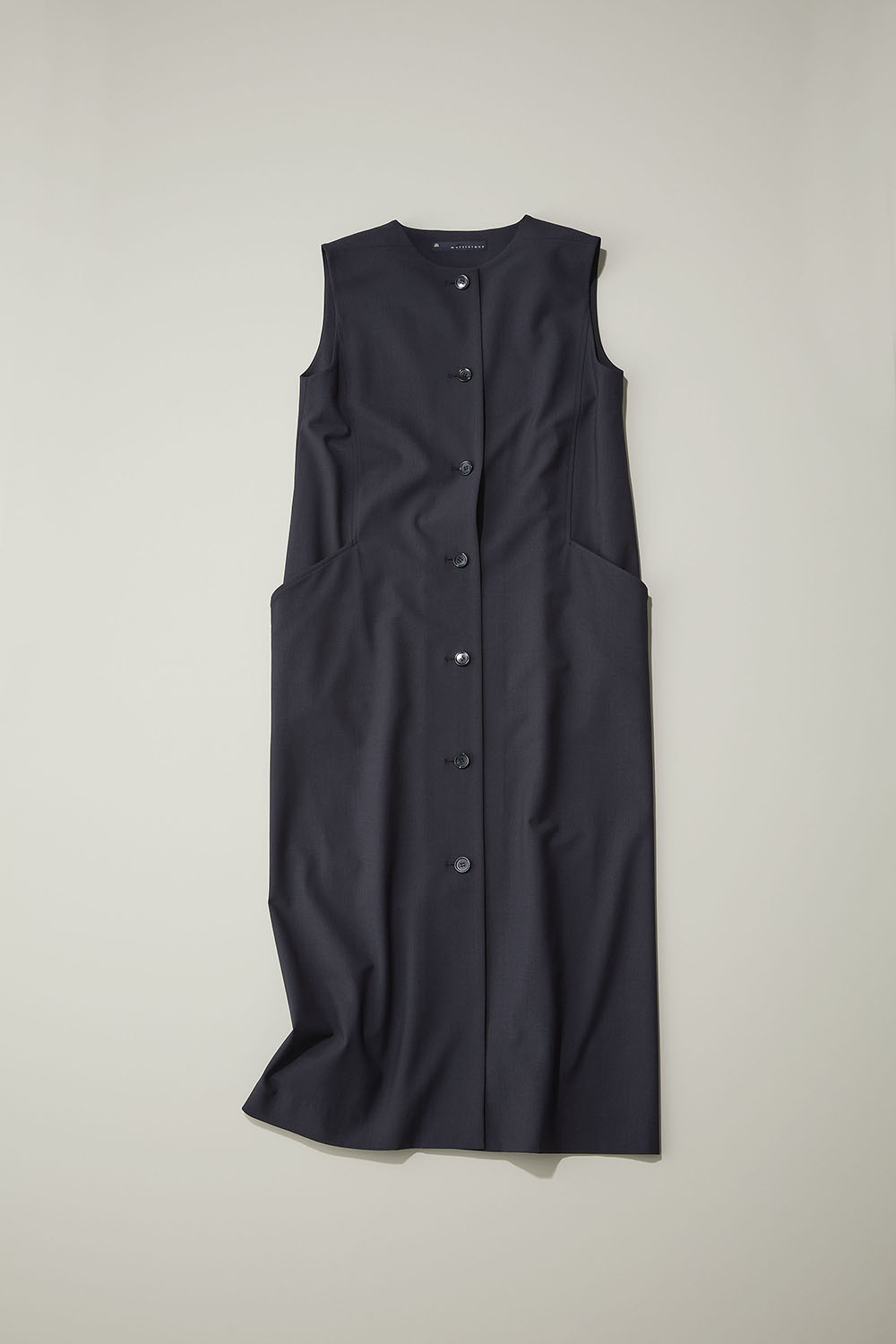 軽やかに“きちんと見え”を叶えてくれる、上品な光沢のあるジレワンピース。やや長めの丈と適度なハリ感が、縦のラインを強調し、スタイルUP効果も。Tシャツやニットの上にさらりと重ねるだけで、コートより軽やかに、ジャケットより今っぽく。季節をまたいで活躍する万能アイテムです。
