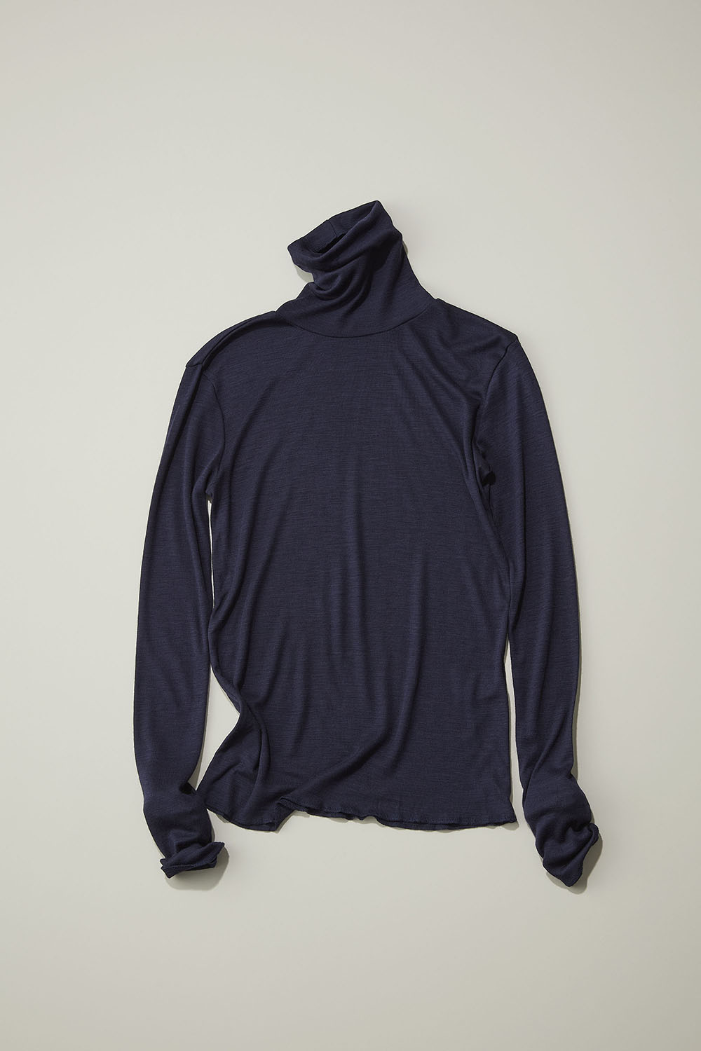 AMARC LIFE STOREで人気のタートルネックカットソーに、新色のネイビーが登場。しなやかで柔らかな素材が心地よく、薄手ながらも安心感のある着心地です。重ねてももたつかず、インナー使いにも最適。大草はじめAMARC編集部員全員が愛用している、スタイリングの“軸”になる一枚。