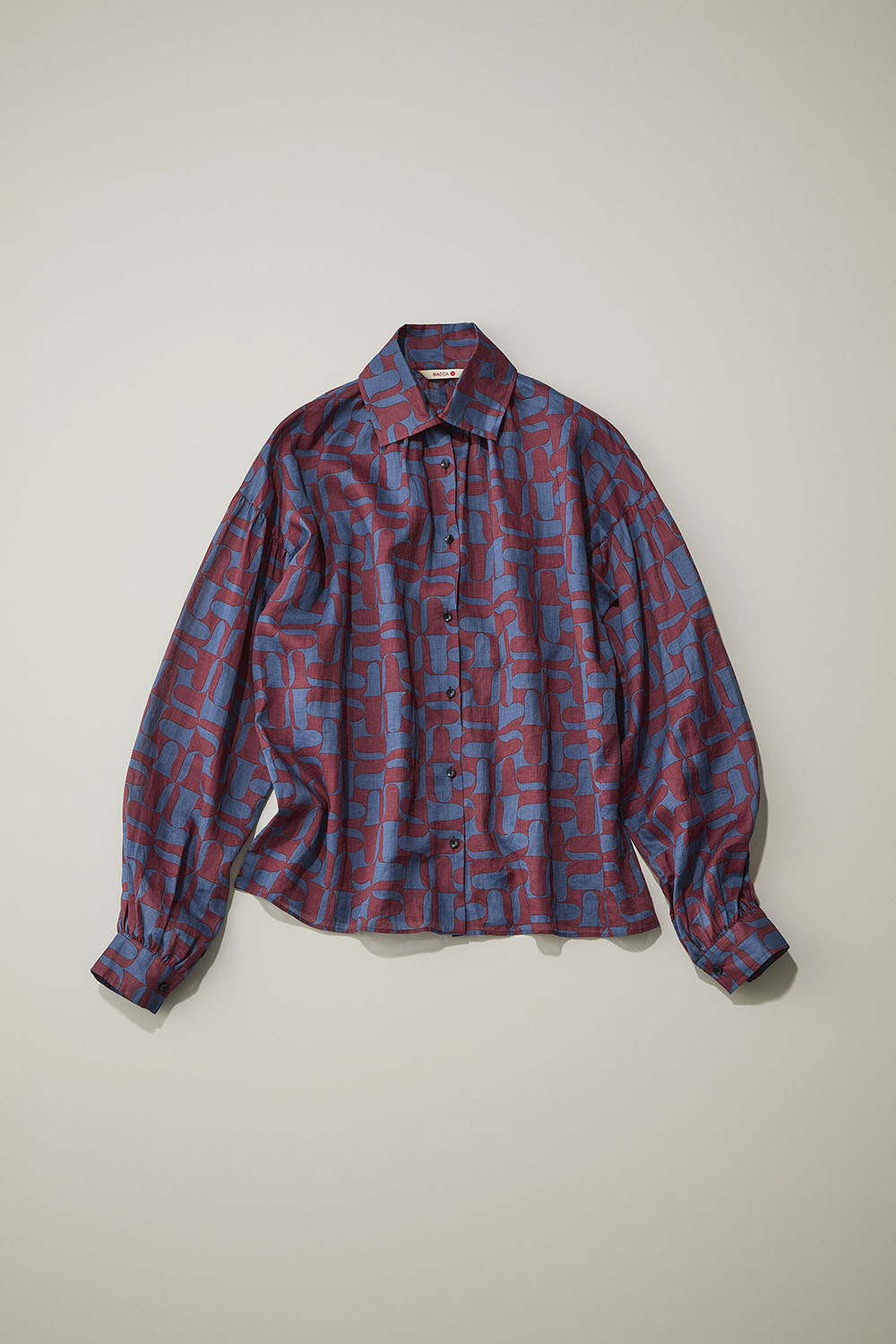 深みのあるブラウンとネイビーを掛け合わせた、グラフィカルなブロックプリントが印象的。繊細な透け感と落ち感のある素材が、柄に奥行きをプラス。一枚で着るのはもちろん、ニットのインナーとしてのぞかせても美しい、知的さと華やかさを併せ持った一枚です。