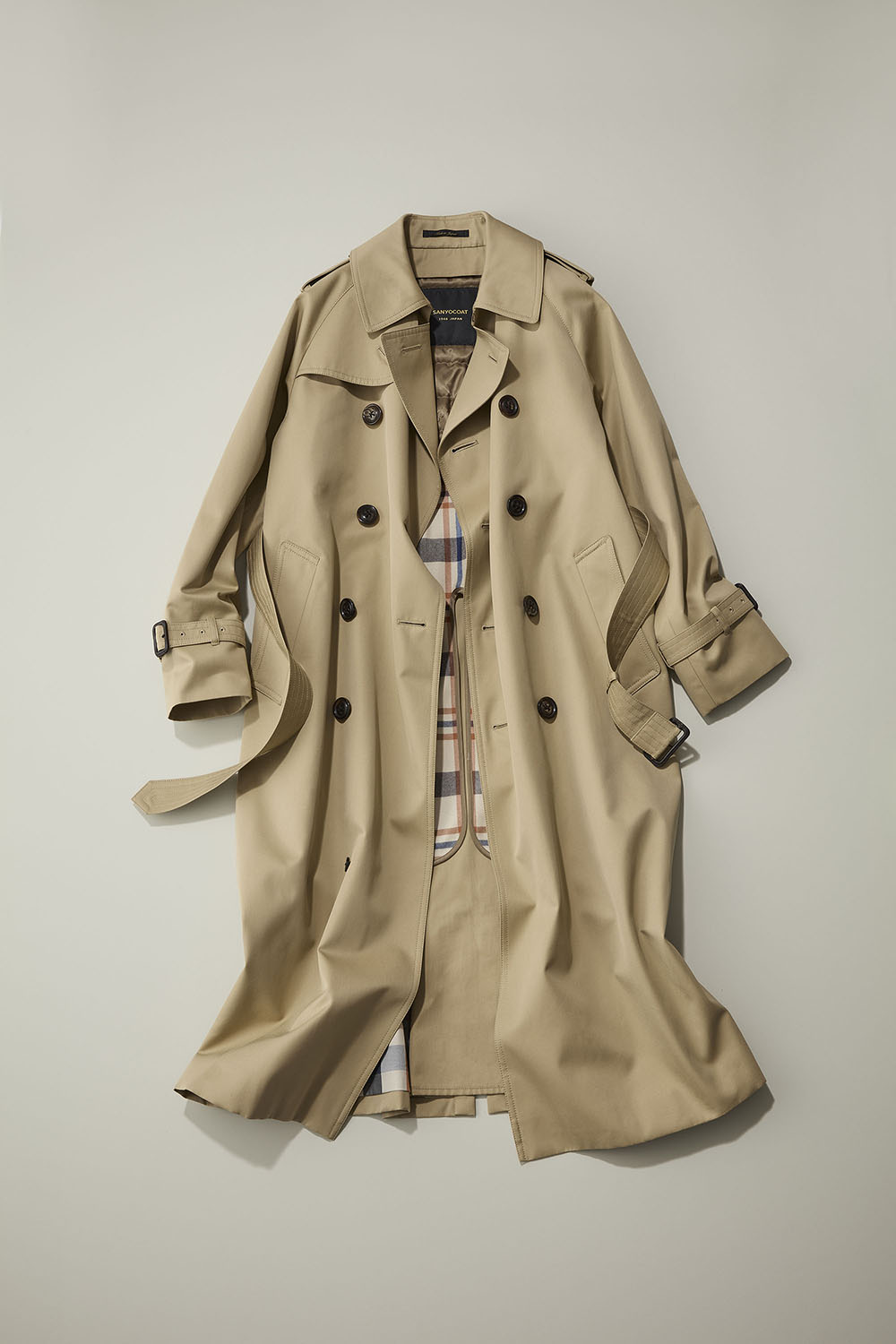 大草本人も愛用し、AMARC CHANNELでも20体の着回しを紹介した、〈SANYOCOAT〉の100年コート「極KIWAMI ダブルトレンチコート」。高密度のコットンギャバジンが生むハリと艶、端正な仕立てが際立つ一枚です。トラッドの王道にして、時代を超えて寄り添う名品。