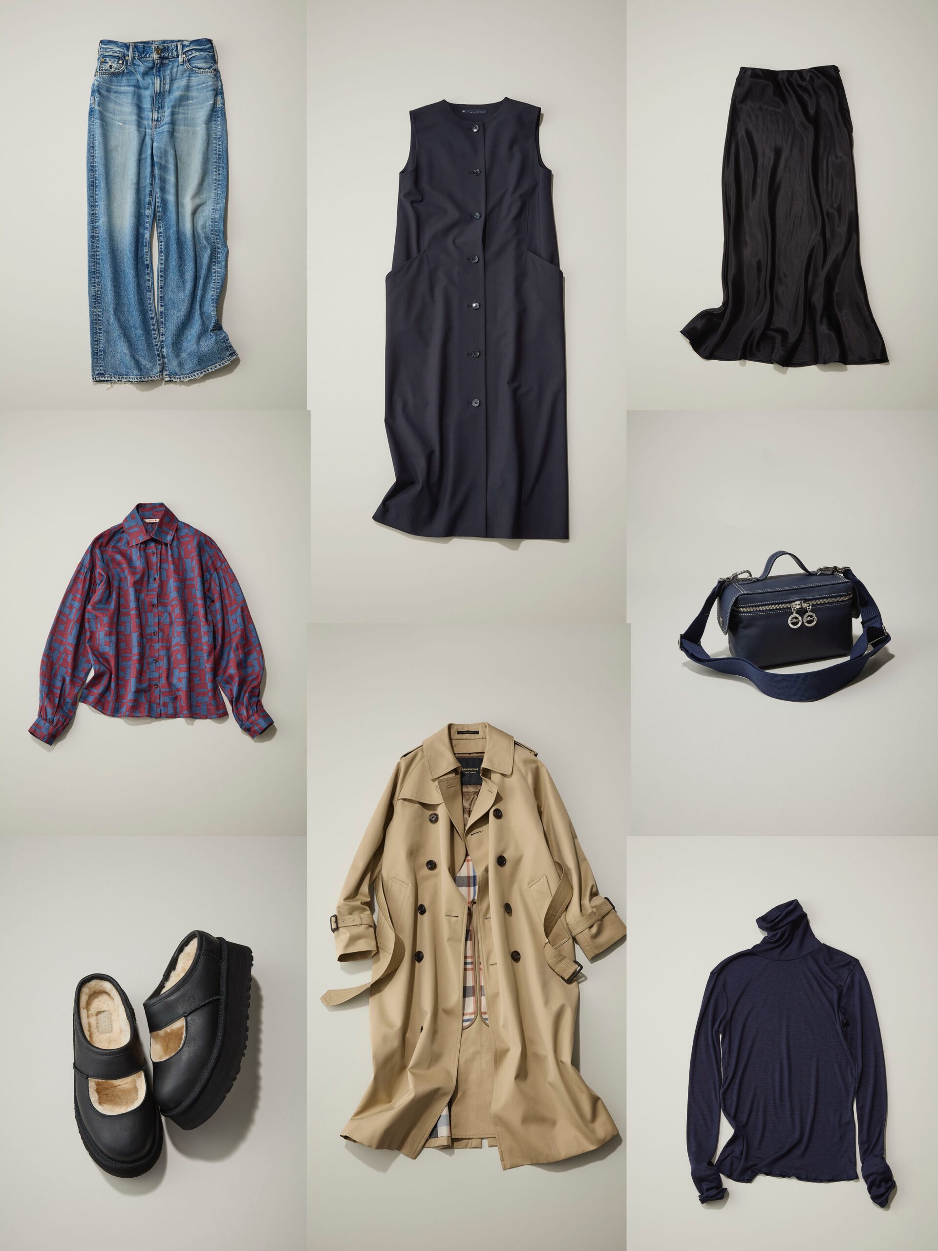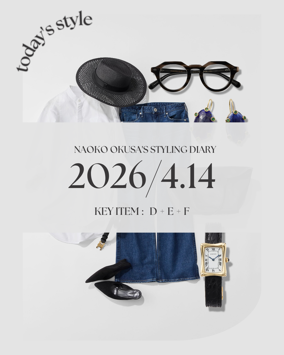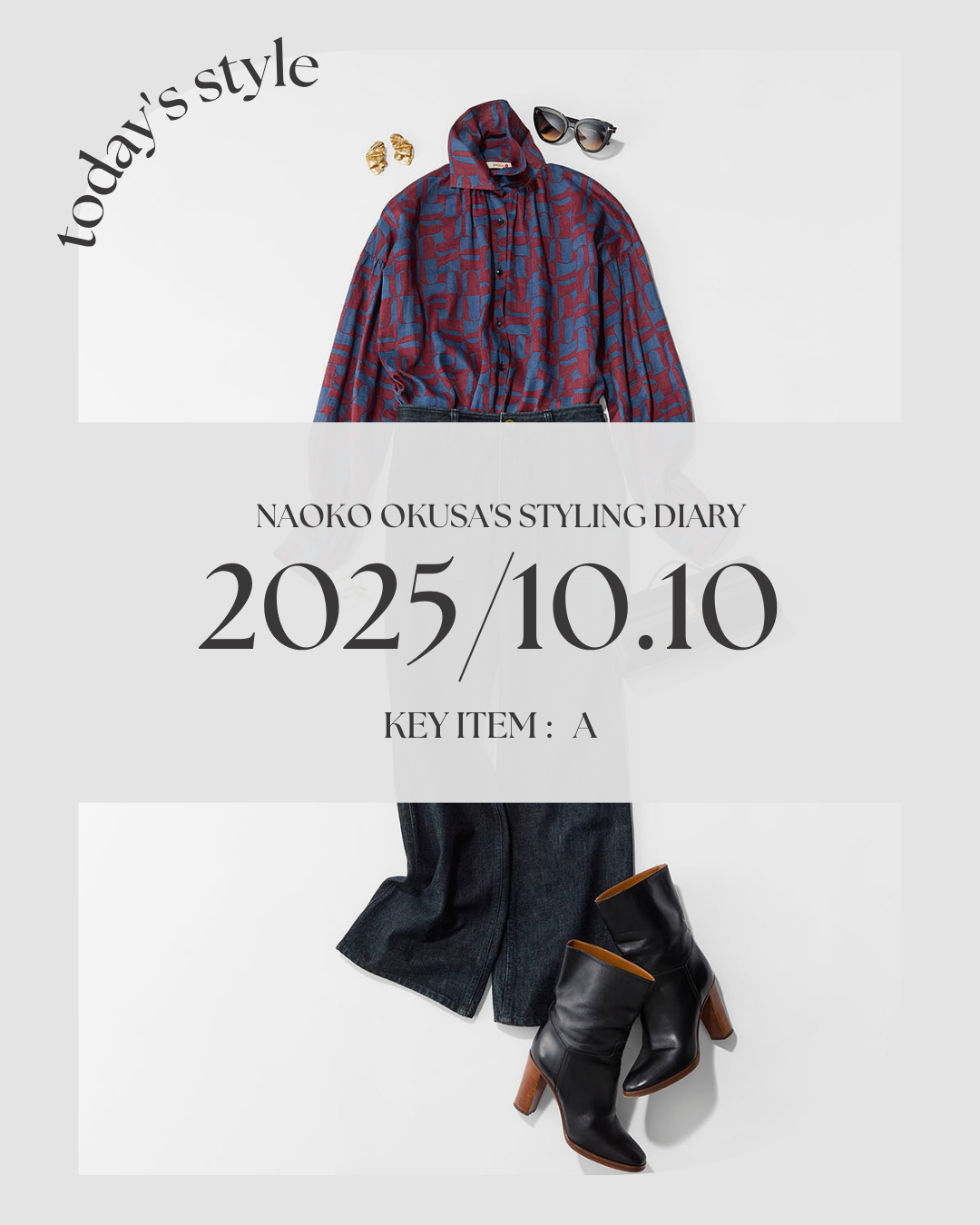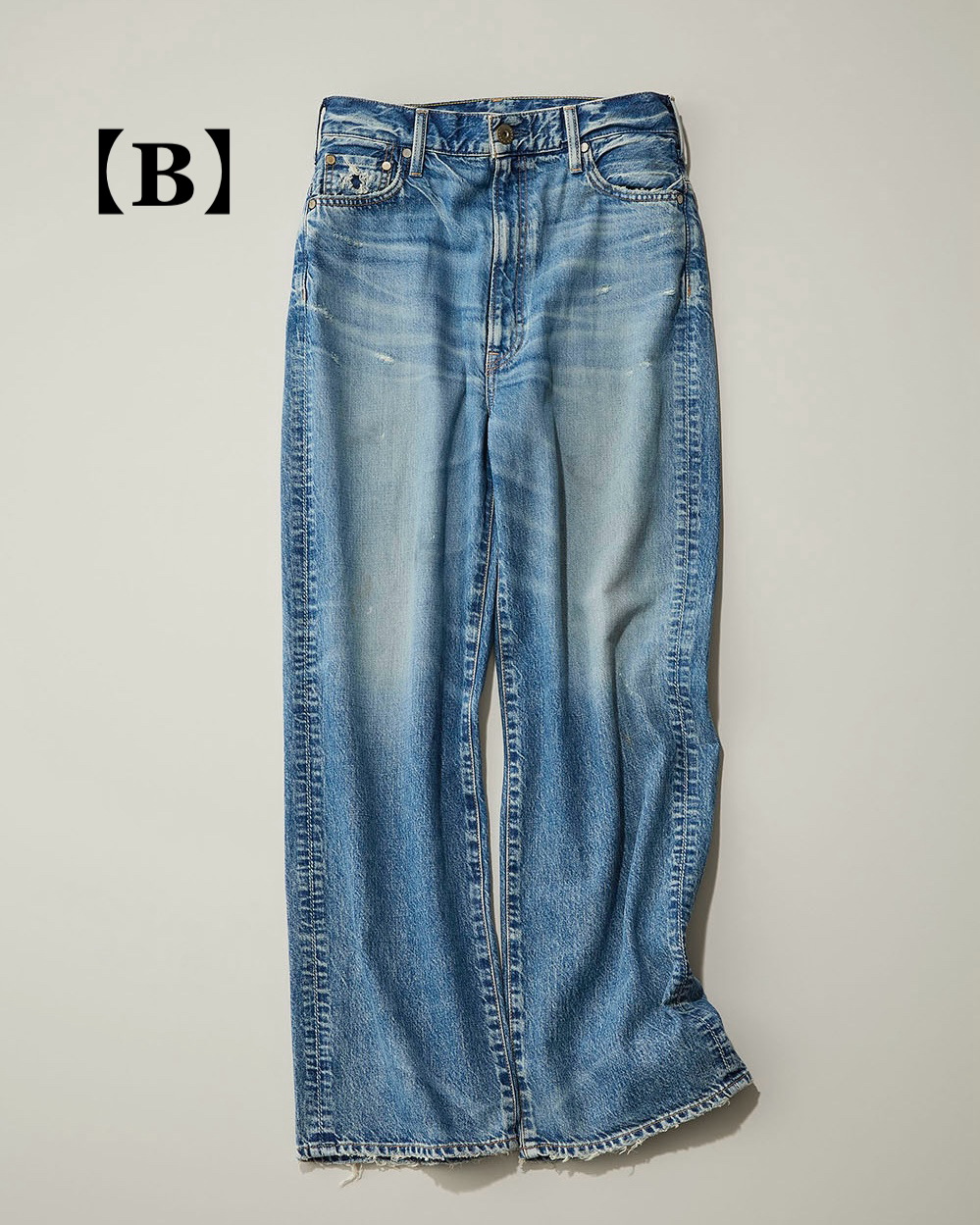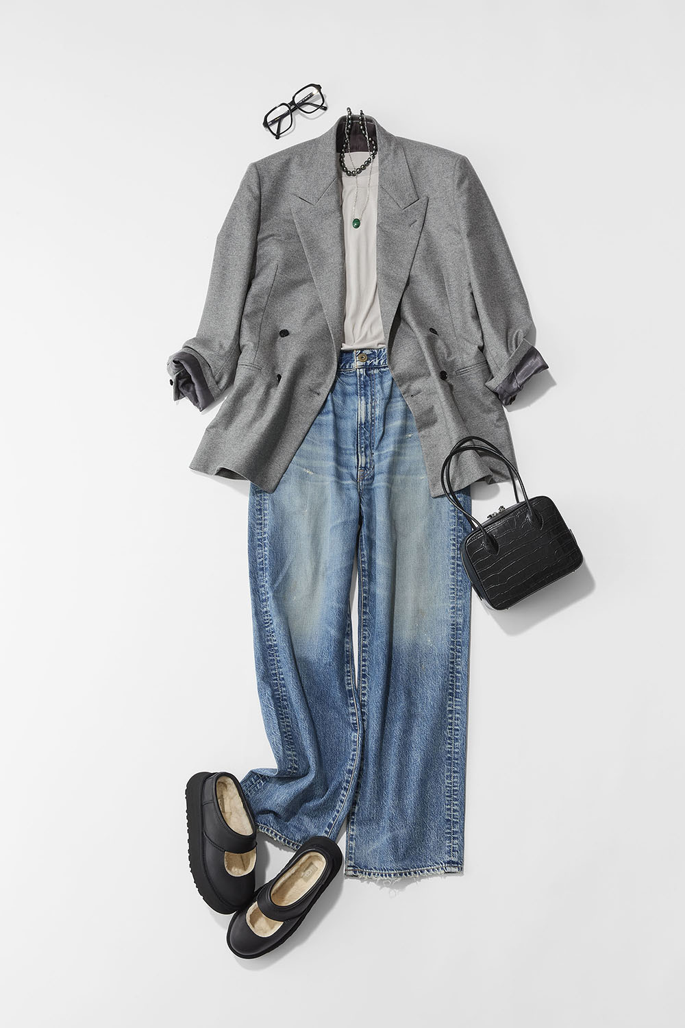 「デニムをはきたい日。手に取ったのは、ヴィンテージライクな色落ちとワイドストレートがほどよくラフで、気分をフラットにしてくれる一本。オーバーサイズのジャケットと厚底スリッポンのボリュームで、モードなエッセンスをひとさじ。肩の力が入っていないのに、エッジが効いてる──そんなバランスが今の気分」