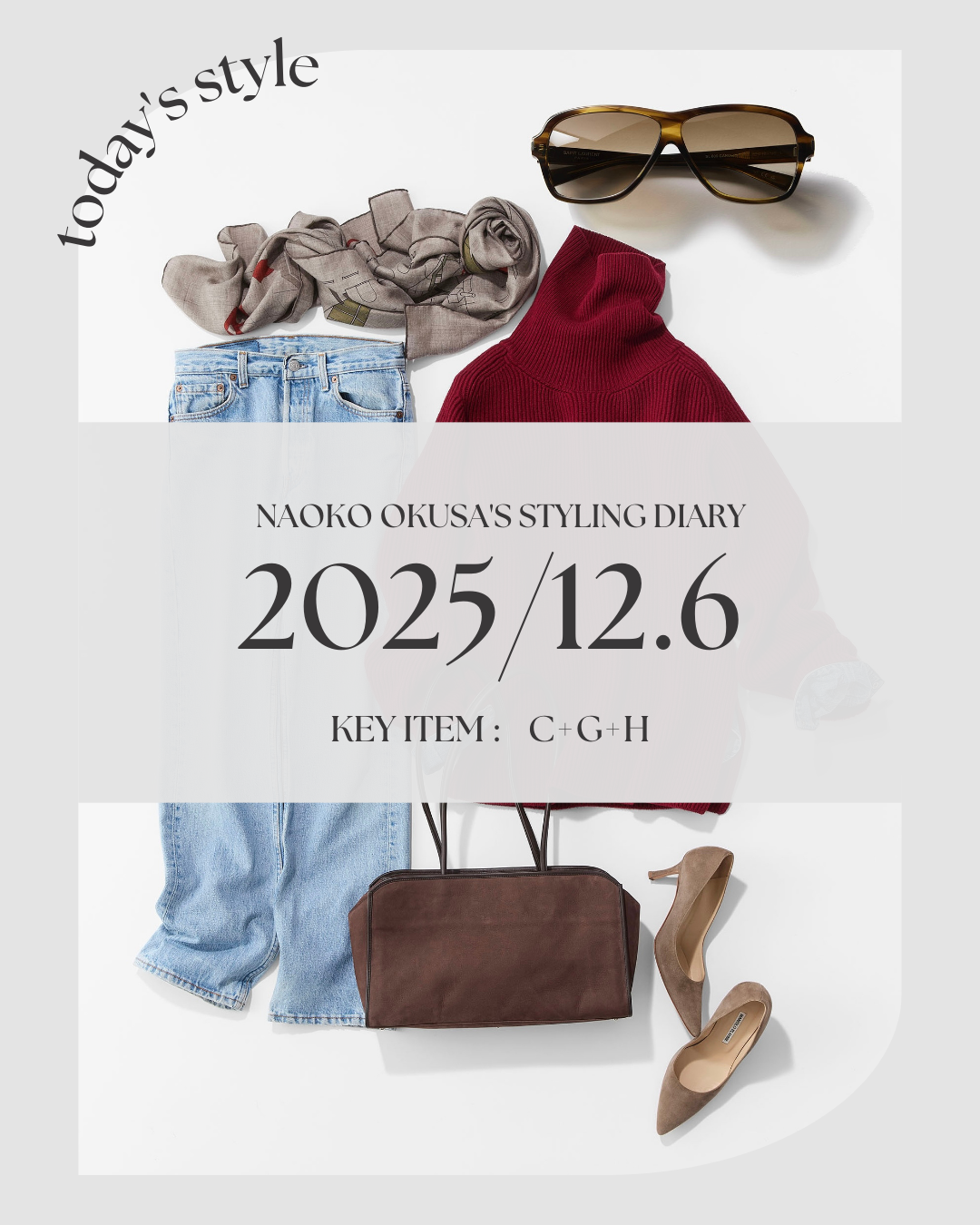 「フェミニンでドレッシーな印象の強いサテンスカートですが、ウールのグレーのジャケットを合わせると、”艶バランス”がニュートラルになり、全体の印象もぐっとマニッシュに。アクセサリー感覚で添えたシルバーのバッグで、輪郭をシャープに引き締めて。足もとは〈UGG〉のスリッポンで、全体のボリュームを支えるのが正解」