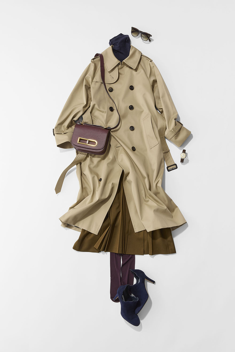 「東京も、冷え込む日が増えてきました。ようやくトレンチコートの出番です。端正なゴールドベージュの一枚に、カーキブラウンのプリーツスカート、そしてボルドーのバッグとタイツを合わせ、秋色を重ねて。インナーは、黒ではなく、あえてネイビーのタートル。トラッドムードが加速し、装い全体がぐっと秋めきます」