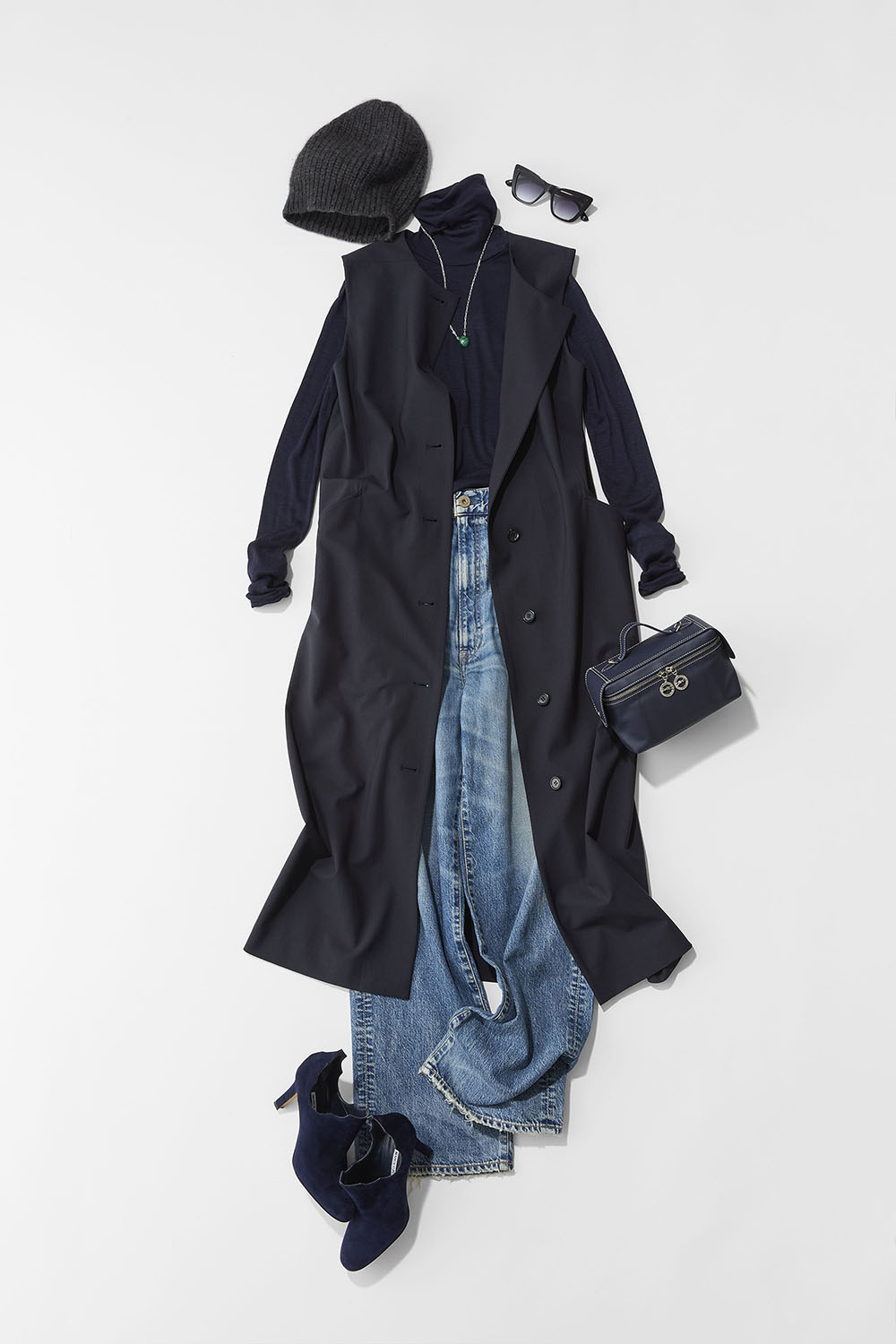 「ジレを羽織ると、シルエットに”角”が生まれ、着こなし全体が凛と引き締まります。タートルネックカットソー、ブーツ、そしてバッグを、ネイビーで揃えたのも、端正な華やぎを漂わすポイント。バッグのコンパクトさや四角いフォルムもアクセントとして効いてきます。シンプルだけど、静かな強さが宿る、大人のデニムスタイルです」