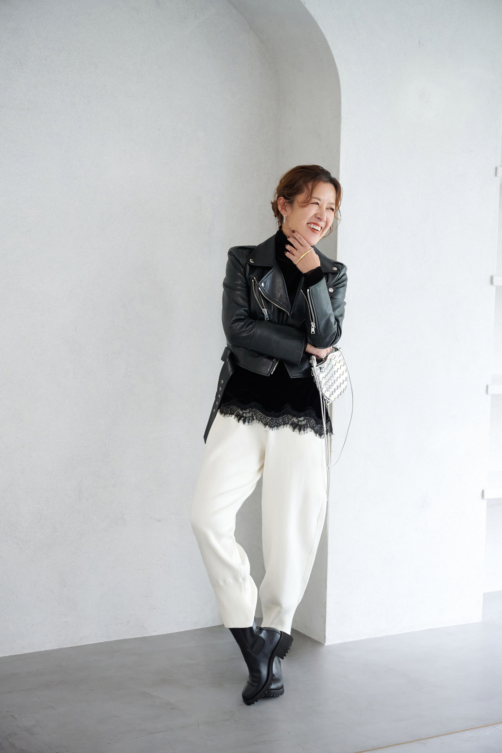 「スウェットのようにリラクシーな白のニットパンツ。裾はサイドゴアブーツに引っ掛けて。上半身は、ライダースジャケットと黒のレースキャミソールをレイヤードして、エッジの効いた着こなしに。ゆるさとモードのアンバランスが生む、洗練された抜け感を意識しました。バッグは、モノトーンに硬質な光を添えるシルバー」