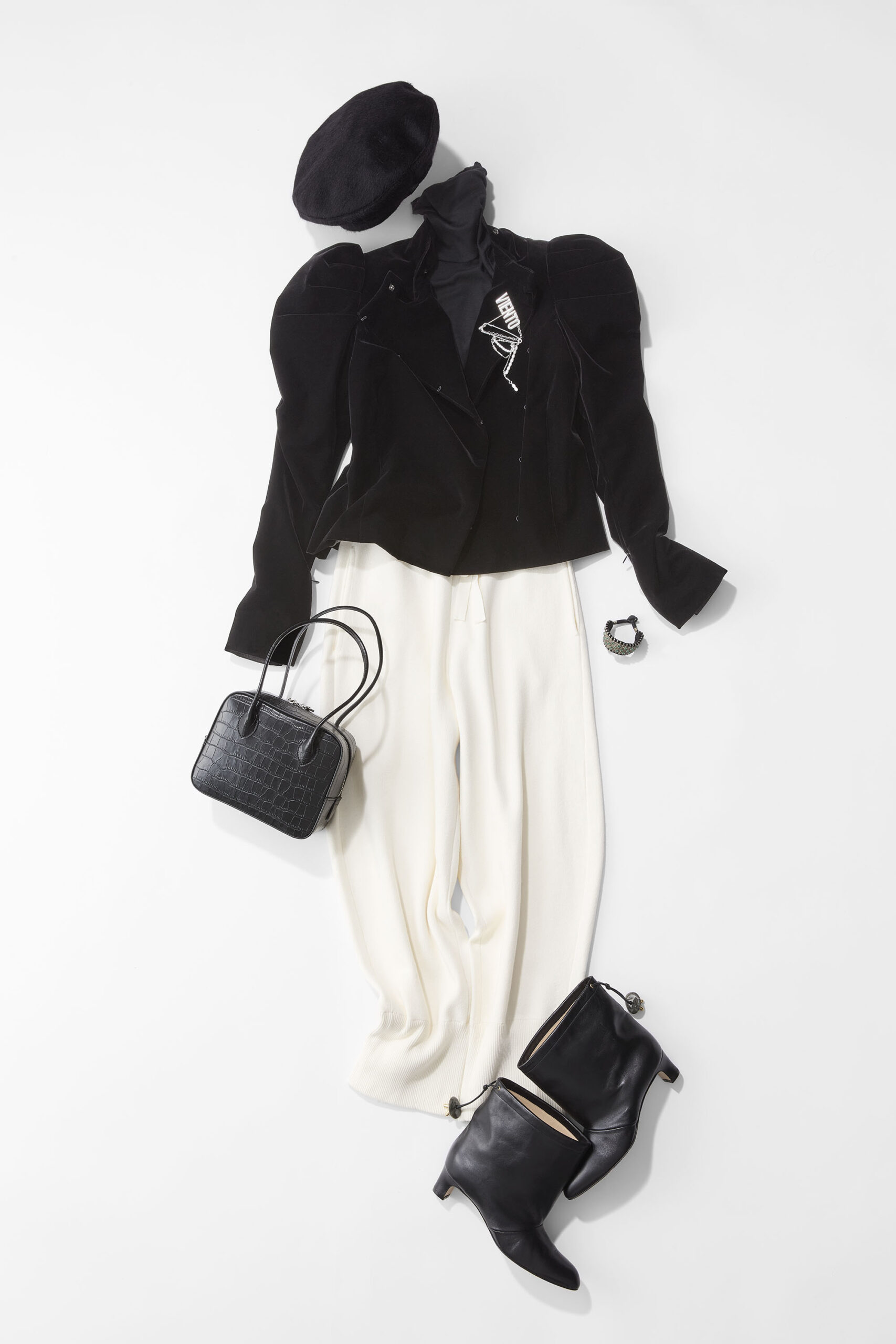 「肩のデザインが印象的なベロアジャケットに、白のニットパンツを合わせて、冬のモノトーンを軽やかに。黒をメインに据えつつ、白の分量をしっかりとることで、ジャケットの強さが和らぎ、”甘モード”な着こなしに。仕上げに、ブローチを重ねづけし、ベレー帽をプラス。可愛げとモードが混ざり合う、冬のモノトーンスタイル」