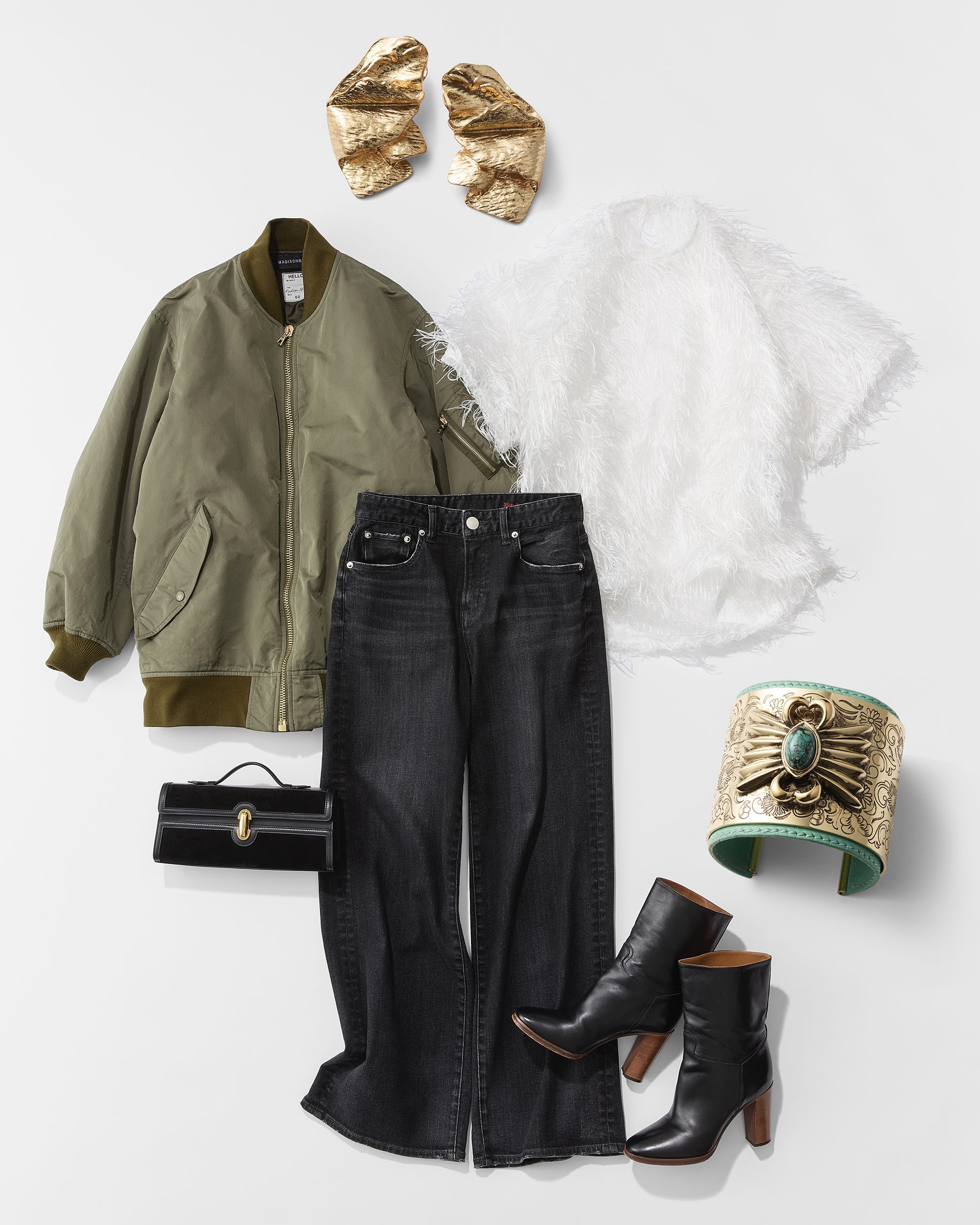 「ブラックデニムを軸に、白のフェザーニット、カーキのオーバーサイズブルゾン、そして黒小物を重ねました。軽さと強さ、甘さと辛さ──異なるキャラクターのアイテムを大胆に掛け合わせることで、奥行きが出て、その人らしい”スタイル”が完成します。耳元と手元のゴールドのアクセサリーでドラマを添えて」