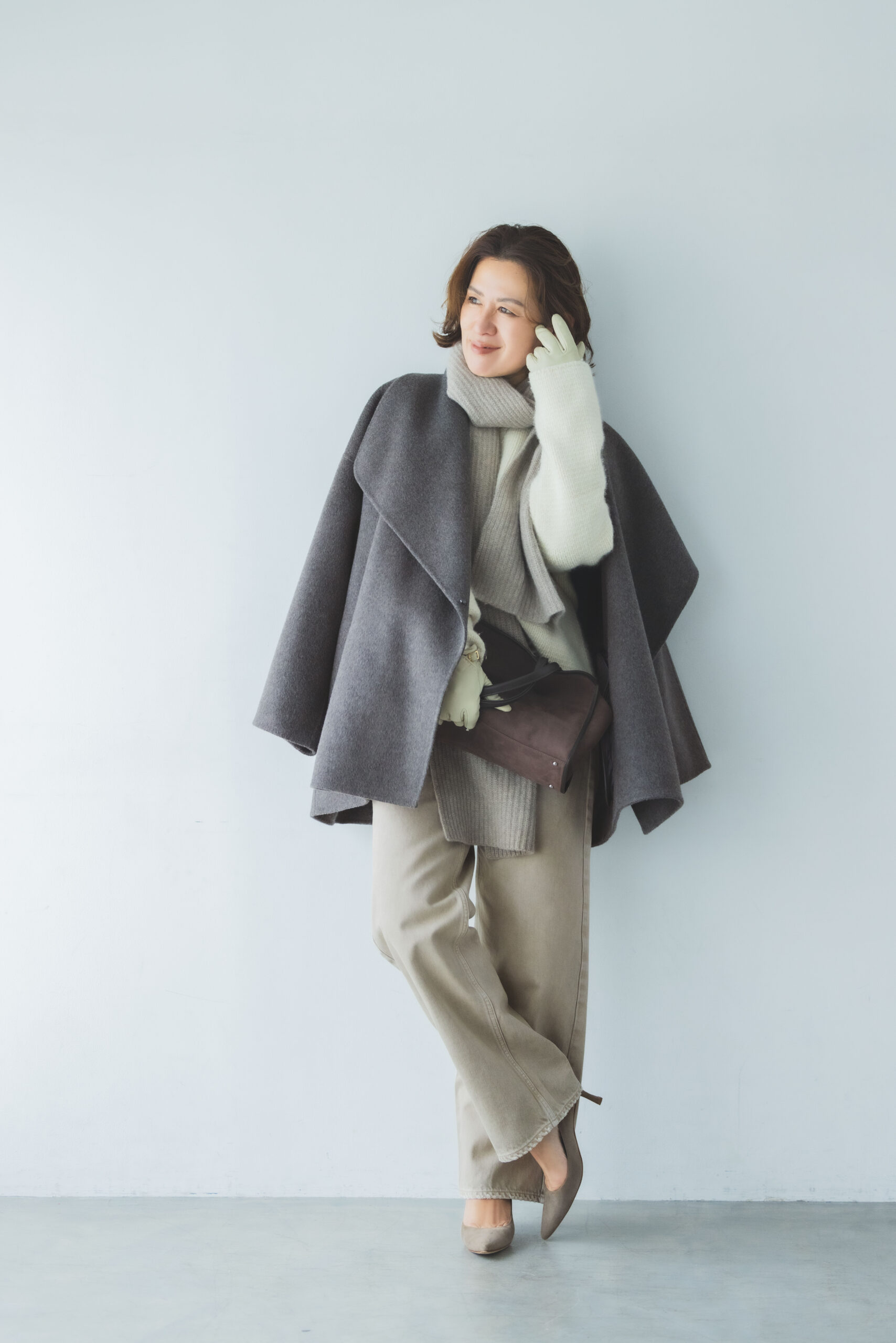 「ブラウンのガウンコートに、ミルク色のニット、そしてベージュのデニム。淡めのグレイッシュなグラデーションでも、メリハリがあるのは、デニム特有のドライな質感のおかげ。コーディネート全体に“抜け”を作り、軽やかなリズムが生まれます。ガウンコートのラグジュアリーなシルエットで全体をやさしく包みつつ、足元のヒールでひとさじの緊張感を」