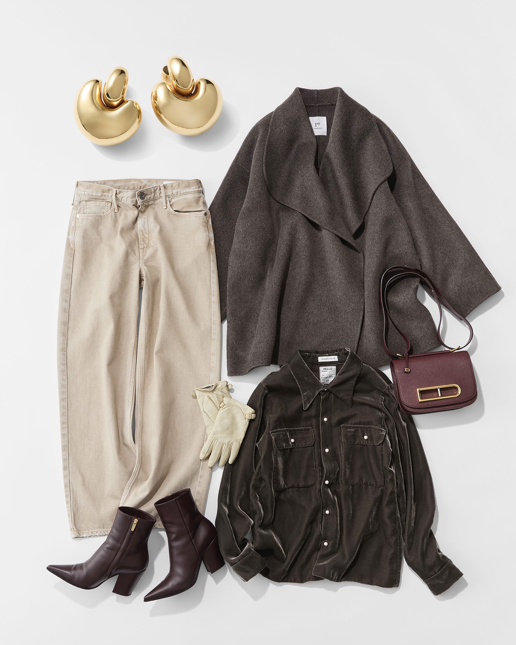 「デニムに合わせたのは、薄手で落ち感のあるレーヨンベルベットで仕立てられた『MADISONBLUE』の名品、MADAME WORK SHIRT。ワンウォッシュされたような風合いで、デニムとも好相性。着こなし全体にモードな艶を足しながら、印象を引き上げてくれます。ブラウングレーのガウンコートで全体を包み込み、デニムの日常を、”少し特別”に仕上げたホリデーシーズンの週末スタイル」